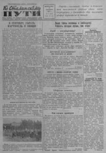Пролетарии всех стран, соединяйтесь[ Ш>СтйЛшияСбЖ) П У Т И Орган Северного РК Коммунистической партии Советского Союза и районного Совета депутатов трудящихся Новосибирской области В СЕНТЯБРЕ УБРАТЬ КАРТОФЕЛЬ И ОВОЩИ В своих постановлениях по д н а о л в ь о н дс е т й в ш а ем и у м р е а р з а в х ити у ю вели ж ч и е в н о и т я п щ р е о й изв С о о д в с е т т ва Ми к н а и р с т т о р ф о е в ля СС п СР о , воп Центральный Комитет КПСС обязывают расширить посадку картофеля, корнеплодов на к г ч о о и р л м и р о а в п й ы о о с е н е а в це в к л о и э р т . ц о . К е м и о л л г о х о д о д о з у в ы н н у а в к ш е а л е р и тофеля' на несколько десятков г д е а к . та Ч р а о с в ть про к т о и л в хо п з р о о в шло з г а о няло го сь по-настоящему овощеводством. Почти везде выращены богатые урожаи, так как применялись т п о е д р ы е З д , а о д в в а ы н ч е о а с а с и о г л р с и т о с о т ь и е т хн у и т д е ч о п е б е с р к р е и ь н е и в я м т . о е м , чтобы убрать своевременно в г т о е а п с н ь р о и в у я и р т л о с а ж т с в ь а у й е . п т р П е о к г р о у д а б а сн ор а с я е к й е. ч п ас б Д у л о с а л г правлений, смотреть ор б га р н и и га з д а и ц р и о ю в т п р е у р д е а на полях, уплотнить рабочий день и найти резервы рабочей силы специально для уборки ц н к е о а й р й т , оф у з с е е и л р л я н е . о н в н Н ы о а х й ряд с у и даче б с й есп к р о з е с е о р р в ы н и в а государству, вести копку кар- хофеля. Если сбор н х н р е и т а т с н с я е я н д и п о е з д н м о а о ж ч ж д и е л т т и ел вы ьн х п о р е и г д в о н е у с е с т й л и з , о а ж т т я о к порче, как это имело место в прошлые годы в отдельных случаях. Этого мы г с о т д ить с н у е вел м и о ч ж е е н м и . ем На по б г у о д л у о щ д в о и ь п й я у скота в колхозах надо будет расширять посевы кормовых культур, значит необходимо большое количество семян. Надо также сейчас обеспечивать животноводство, тем более, чтобудут ставиться на откорм свиньи. А остатки картофеля можно продать государству по повышенным ценам. Главное внимание в первую о с н т ч о к е й р а е м у д . ч ь а 1 с ! т у о д с е к л л у и н ч т с ь ая с о х е т , м ве е ч н а г н е д ы т е м т с р е у е м ч б е а о й в м м а и е н н и и к я т л м ь уб е п н г о я о с м е и в р н . яд ы о х вы к м аче с ст х в о , рош з и а С уборкой этих культур у т н я а б с ря но уб в р с а ё но хор т о о ш л о ь . ко На "¿ п 5 ол с т е о н р а д т щ о е а ф с д я е и т л к ь а вы в г к е о к п х т а р а л а р и н о и в л п .Г и с о щ с л ы а ы к ш й к У е , г » п х к о л а з о р ы и ва м , . У К б а и г р ан аю ов т и в ча а , р и т м ел . ях Во « р П ош ам и я л т о ь Куйбышева», им. М Горького, им. Крупской, «Борьба за мир» н ряде других. А вот колхозы н « а Путь ещ С е тал п ин н а е » н ирн н с м т . уш Ст и алик убо Т рк ак е. ое положение обязывает о к ры н о а лх к о п з р у ы с и к н о н я р т е ь в н с и ё ю пра н к а у т с б и е о л ч р е е к н с и к и и . е е Бо р м л а е ь й шую помощь в этом должны м о к к е е р а - о з с а м е т в ь а мо у Й г ч у о а т н щ о с и л -Т е у р с ж я о и н т ц ь к ш . ш ко к О л о к . л и ь П н н р и а и копали уже около 2,5 тысячи пудов и взяли обязательство с ф х в о е о з л и е ь ми со и с м и в . л с а е м й и К п а л г у о а б щ н р а о а д т в и ь ич в а. кар к У т о ч о л а л щ х ск о ы и р з е а е с у х с я б н и ы п р С е а е ю в п е д о т р н с н л и к о е . а й р у т р с о р ф о е к е д л о н ь в е , й и в ш в к к о в о л о Необходимо мобилизовать все резервы и.в ближайшие 2—3 "дня закончить уборку феля, овощей н корнепл к о ар д т о о в . П Л О Х О О Р Г А Н И З О В А Н О П И Т А Н И Е б л щ а е и в й а