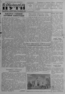 * Пролетарии всех стран, соединяйтесьi fie CmaJunarfiMij П У Т И Орган Северного РК Коммунистической партии Советского Союза и районного Совета депутатов трудящихся Новосибирской области НАВСТРЕЧУ РАЙОННОЙ ПАРТИЙНОЙ КОНФЕРЕНЦИИ В жизни первичных партийных организаций нашего района наступает ответственный период—с 20 октября начнутся отчетно-выборные партийные собрания и подготовка к районной партийной конференции, которая пройдет во второй половине декабря. Это мероприятия большой политической важности. Предстоящие собрания подведут итоги работы парторганизаций по выполнению постановлений и критических замечаний прошлых отчетных партсобраний и конференции, на основе критики и самокритики коммунисты вскроют недостатки и наметят пути дальнейшего подъема всей организационно-партийной и партийно-политической работы, изберут новый руководящий состав. Перед партийными организациями стоят огромной важности задачи к деле крутого подъема социалистического сельского хозяйства. Они мобилизуют тружеников колхозной деревни на выполнение решений сентябрьского,февральско-мартовского п июньского Пленумов ЦК КПСС. II надо добиться такого положения,чтобы отчетно-выборные собрания уделили особое внимание этим главным вопросам. В центре внимания должны быть вопрос идеологической и внутрипартийной работы, усиления деятельности по коммунистическому воспитанию трудящихся, по повышению их активности. Коммунисты должны подвергнуть критике тех секретарей парторганизаций, которые не сочетают партийно-политическую работу с хозяйственной, не смогли развить творческую инициативу коммунистов и вовлечь их в активную партийную жизнь, мало придавали значения идейно-политическому росту членов и кандидатов в члены КПСС, не опирались на актив. Одновременно с критикой недостатков следует отметить всё положительное, что проделано коммунистами за отчетный период. А многими парторганизациями проделана значительная работа по организационно-хозяйственному укреплению колхозов, улучшению работы предприятий и МТС, по развертыванию политико-массовой работы среди трудящихся и мобилизации их на выполнение всех хозяйственно-политических задач. Именно к таким относятся парторганизации: Северной МТС, колхозов «Память Ленина», им. Калинина, райпромкомбпната и другие. Другая важная задача состоит в том, чтобы в руководство парторганизаций избрать способных коммунистов, проявивших себя на практических делах. Избрать достойных делегатов на конференцию. Отчетно-выборные собрания должны пройти на высоком уровне. Всё зависит от подготовки собраний, от того, насколько содержательным будет доклад, как глубоко будут проанализированы все стороны жизни партийной организации. Доклад это не только дело секретаря. Ему в этом должны помочь коммунисты, партийные комитеты и бюро, там, где они есть. Долг партийных организаций в период до партийной конференции поднять трудовую активность тружеников села на решение всех задач, на успешное завершение сельскохозяйственного года. На высоком уровне проведем отчетно-выборные собрания, поднимем активность трудящихся и новыми трудовыми победами встретим районную партийную конференцию! Готовимся к областной сельхозвыставке Замечательных успехов добились в этом году колхозы зоны Северной МТС . Они по праву з