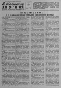 Пролетарии всех стран, соединяйтесь! ШСшЛшш&Щ П У Т И Орган Северного РК Коммунистической партии Советского Союза и районного Совета депутатов трудящихся Новосибирской области ЧЕТВЕРГ 28 ОКТЯБРЯ 1954 г . № 86 (1685) Цена 10 коп. Колхозника и колхозницы! Повышайте производительность труда и укрепляйте трудовую дисциплину! Изучайте и широко внедряйте достижения науки и передового опытаЮбеспечим дальнейшее укрепление общественного хозяйства колхозов, рост колхозных доходов и повышение благосостояния колхозников! (Из призывов ЦК КПСС ) ПРИЗЫВЫ ЦК КПСС к 37-йгодовщине Веиклой Октябрьской социалистической революци 1. Да здравствует 37-я годовщина Великой Октябрьской социалистп- ческой революции! 2. Да здравствует международная солидарность трудящихся всего мпра! 3. Братский привет всем народам, * борющимся за мпр, за демократию, за социализм! 4. Трудящиеся всех стран! Мир б р у о д д е ы т в с о о з х ь р м а у н т ен де и ло с у о п х р р о а ч н е е н н , ия еелк мп н р а а в свои руки и будут отстаивать его до конца! Крепите единство народов в борьбе за мир! н ду ие 5 Д н . а а с т р Д з о о а д р д р о а а з н м д в н и с р и ! т а к в в о у с в е т т ву м е и п т р р а о м чн в о о ы г у й в ч с е е м е м пр д м в и м и р е ж е ж е ! Т р в р о и й у те д н с я ы ь щ , п и р е з о с а т я ив в м с и у е р г х р н о о с з е т ы ра н н с о о , в т о а р й к у т д м и н в и и н р ч о о е в с о т б й в о о между народами! > р т о е д с н ь 6 о . г з о а Тр и з у а д п д р р я у е щ г щ и о е г е н о с и я е ор в а у с т ж е о х и м я н ст о м р г а о а с , н с ! о в в Б о о о д го р о и - ^ у р н н о и и д е 7 ч . ов т в о П о в ж о у р б е ст о н у р ж ь и ь е я б к н , е р и е з й п а п ! н р е о в т т с и е с о в о б л щ и в е д е о а з р р н с о о о ж с к т д р ь е а н щ н и а е я германского мплитарпзма, против с п о и з р д З о а а в н о и к п я ! ро а ч г н р ы е й сси м в и н р ых и во к е о н л н л ы е х кт г и р в у н п ую безопасность для всех европейских нар 8 о . до Б в! ратский привет трудящимся стран народной демократии, успешно борющимся за дальнейший подъем народного хозяйства, за неуклонное повышение благосостояния народов, за построение социалистического общества! м р в о е а т д я Д с н к а о д о - р г д з о у е д ж м р о б С ав к а о с р ю т а в з и т у а и е ! ч т е с с о к и т и р к х у р д е с н п т и н р ч е а е т н ст н в п е о руш С н о и а т м а у й с с 9 я к . о з м Б а у ра п т н о с а д к р ъ и о е й д м у, п н р а у и р с в о п е д е т н ш о в г н о е о лик х б о о о м з р я у ю й щ с к т е и в ц а ию п с к т у р л ан ьт ы у , ры з , а з п а ост и ро н е д н у и с е триа о л с и н з о а в социализма! р со у в ш Д е и т а с м к а з о я д г р о а д в р и с у т ж в к б у и е а т т айс и и ког п о с р о о т ц р н в у а е д р т н о а и д ет о ч в ест — н во емогучий фактор мира во всем мире! 10. Братский привет героическому н ти ар ч о е д ск у ой Кор Р е е й с с п к у о б й лик Н и а , род б н о о р -Д ю е щ м е о м кр у а ся з д с а т и в н а е в , н о и з с а е ста м К н и о о р в р , л еи з е а ние н н а а н ц а д и р е о о м н д а о н л к о ь р г н а о о т е и х ч о е о з с б к я ъ и й е х началах! м ли у к 1 и н 1 а . В р Б о ь д е р т у а н тс а Д к м е и м , й о б к о п р р р а ю т и и в щ е ч т е е м ск у о с г й я ер Р о з е и а с ч п е м у с б к п о р р и од д 1 н е 2 м о . г о о к П ра р х т и о и з в ю я ет й , с з т а в м а и во р с с о в с л о т ю е а й б н и о в р в ы о л д е м н и и ны е с ! и н л а а м Г н с е о т р й у м п а н Г н ы е и р х и м , а п н б л и о а и р н ю о в в щ п и р м о е с ч в я а р г ащ п т е р р н о е и т т и я ь в ей Зап п а м р д е и ровой войны! к о р п а л Д т о а т иче з б 