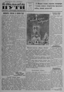 пролетарии лсех стран, соединяйтесь! СУББОТА 1 ЯНВАРЯ ЖМ З К н г ж я О р г а н С е в е р н о г о Р К К о м м у н и с т и ч е с к о й п а р т и и С о в е т с к о г о С о ю з а < р а й о н н о г о С о в е т а д е п у т а т о в т р у д я щ и х с я Н о в о с и б и р с к о й о б л а с т и 195 г. № 1 (16104) Цена 10 коп. 1 С Новым годом, дороги* товарищи, —годом нового творчества, трудовых побед, новых радостей! МНОЖИТЬ УСПЕХИ В НОВОМГОДУ Советские люди с радостью оглядываются на прошедший год. Он принёс нам много прекрасных трудовых побед. Не перечтешь всего, что построено, воздвигнуто, открыто, сколько какой выпущено продукции и о с в о е но новых земель, сколько выросло новаторов социалистической промышленности и сельского хозяйства, своим упорным трудом создающих блага для народа. Сотни, тысячи предприятий, совхозов, колхозов н МТС страны ещё накануне Великого Октября рапортовали о выполнении своих обязательств перед Родиной, рапортовали и в последний месяц минувшего года о выпуске сверхплановой продукции." Воодушевленные историческими решениями XIX съезда Коммунистической партии и последующимирешениями партии и правительства, трудящиеся нашей славной необъятной страны добиваются всё новых и новых успехов. 1954 год был годом великой борьбы лагеря мира во главе Советского Союза за мир во всём мире. Немало успехов принёс 1954 год н труженикам нашего района. Он принёс нам высокий урожай, он принёс на наши поля и животноводческие фермыбогатейшую и разнообразную технику. Большинство колхозов успешно завершили сельскохозяйственный год. Славно потрудились хлеборобы сельхозартелей «Память Ленина», им. Калинина, «Заря коммунизма», им. Крупской, «Путь к коммунизму», им. М. Горького, «Красный Октябрь» и другие. Онив лучшие сроки провели все полевые работы, вырастили высокий урожай всех культур, рассчитались с государством по всем видам обязательных поставок сельскохозяйственных продуктов, большое количество зерна продали в порядке закупа, получив большие доходы. Колхоз «Память Ленина» на днях продал ещё 400 центнеров хлеба. Животноводы ряда колхозов также добились немалых успехов, выполнив и перевыполнив задания понагулу скота, надою молока, пополучениюи сохранению приплода. Можно назвать целый ряд имён, известных своими достижениями в полеводстве и животноводстве всему району, таких, как комбайнеры В. М. Смык, ВВ. . Прокофьев, Н.Д. Виноградов, трактористы бригад, которыми руководят А. А. Фу- лавкнна, И. А. Буглеев, Ф.Ф. Тарасенко, М. П. Байдагулов, знатная свинарка П. И. illna- кова, знатный пастух II. II. Драган и много много других, завоевавших честь и славу своим трудом. Радостными успехами встречают новый год и коллективы местной промышленности. Рай- промкомбинатом перевыполнен производственный план и более чем на 20 тысяч рублей дано продукции сверх "задания. С честыо выполнили свои обязательства рабочие артели «Прогресс» — к 25 декабря они дали уже сверхплановой продукции на 66 тысяч рублей. Встречая новый год, надо помнить и о том, что есть у нас недостатки в ведении нашего хозяйства, в его развн- трп и укреплении. Но у нас есть и все возможности устранить эти недостатки. Впереди много дел и большие задачи. Особое внимание надо обратить нам на то, чтобы организованно провести зимовку скота, всесторонне готовиться к весенним полевым работам. Надо усиленно вывозить все корма с полей, правильно и