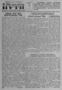 Пвд.Шпдрни всех стран, соединяйтесь/ 1и> Сь1&А1Ш/\ ЧЕТВЕРГ 20 ЯНВАРЯ 1955 г. № 6 (16109) Цена 10 коп. Орган Северно!о РК Коммунистической партии Советского Союза и районного Совета депутатов трудящихся Новосибирской области Трудящиеся района! Достойно встретим день выборов в Верховный Совет РСФСР и местные Советы депутатов трудящихся. Будем бороться за перевыполнение производственных планов. ЛЕНИНИЗМ— ВЕЧНО ЖИВОЕ, ЖИЗНЕУТВЕРЖДАЮЩЕЕ УЧЕНИЕ В нашей печати опубликовано Постановление Центрального Комитета КПСС «0 дне памяти В. И. Ленина». В этом документе подчеркивается, что в сознании народов нашей страны и трудящихся всего мира с именем Владимира Ильича Ленина, с его учением связываются великие победы советских людей в строительстве коммунистического общества. Поэтому теперь более целесообразно отмечать память В. И. Ленина не в день его смерти, что накладывает печать траура и скорби, а в день рождения В. И. Ленина— 22 апреля, придав этой дате значение праздника, что будет более соответствовать всему духу ленинизма как вечно живого, жизнеутверждающего учения. На всех этапах революционного движения в России, на всех этапах строительства социализма в нашей стране ленинские идеи озаряли и озаряют ныне ярким светом задачи н перспективы борьбы партии, ее стратегию и так тику. В жесточайшей борьбе с врагами Коммунистическая партия провела трудящихся через горнило трех революций. Организовав союз рабочего класса и трудового крестьянства, она добилась в октябре 1917 года свержения власти капиталистов и помещиков. После Октябрьской социалистической революции на плечи Коммунистической партии легли грандиозные задачи, беспримерные по своей сложности и трудности, масштабам н глубине. Руководствуясь бессмертным учением марксизма-ленинизма, Коммунистическая партия Советского Союза вдохновила и организовала советский народ на осуществление ленинского плана построения социализма в нашей стране. За короткий исторический срок наша Родина из отсталой аграрной страны превратилась в могущественную индустриальноколхозную социалистическую державу. Преодолевая огромные трудности, следуя по пути, указанному Лениным, партия под руководством Центрального Комитета во главе с И. В. Сталиным привела народы Советской страны к победе социализма. «Ленинизм, — указывается в Постановлении ЦК КПСС «О дне памяти В. И. Ленина»,— является великим жизнеутверждающим учением, освещающим путь строительства коммунизма. Ленин живет в великих делах Коммунистической партии Советского Союза, в новых успехах нашей советской Родины, уверенно идущей по пути к коммунизму». Претворяя предначертания В. И. Ленина, партия решает в настоящее время задачи дальнейшего мощного развития производительных сил социалистического общества, подъема материального н культурного уровня жизни советского народа, осуществляет мероприятия, направленные на постепенный переход от социализма к коммунизму. Осуществляется ленинская идея электрификации страны. Партия настойчиво проводит мероприятия по дальнейшему мощному подъему сельского хозяйства. Трудящиеся СССР осваивают миллионы гектаров целинных и за лежных земель, борются за увеличение урожайности всех сельскохозяйственных куль тур, за повышение продуктивности животноводства, за лучшее удовлетворение растущих потребнос