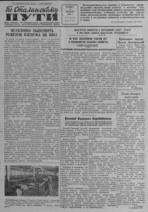 ПО СТАЛИНСКОМУ ПУТИ 10 февраля 1955 года. ПОВЫШАТЬ ПРОДУКТИВНОСТЬ ОБЩЕСТВЕННОГО ЖИВОТНОВОДСТВА Каждому колхозу — высокопродуктивный скот (Из выступления председателя колхоза им. Крупской П .С . Алексеева) По количеству закрепленной з г а ов н и ашим пас к т о б л и х щ озом мо з ж е н м о ли, б л ы у л о иметь прекрасную кормовую базу для имеющегося ства скота. Но как-то м к а о л л о ич о е б этом беспокоились, особенно в бывшем колхозе «Красный Ок т л я о бр о ь б » р , ащ -— ал т о е с п ь ерь вни б м ри ан га и д я е. и М н а а п т з о о р , о о т д ч е у т х к о н т б и и ы в ч н ес ы у к й и п й ас ск уч о б е т ы т . . л За в п ы у с щ о е к н о Отсюда и имеем мы низкую ц к п а а р б о р д — ь укт о н и к в а т н я о б с р ф т ь ь у , . ра З ж н а н о у я т ю б р р и ь к м о е п р с о д я в е у л н до о а й д к о а е . н до о Б в 3 н с 2 о е я г б о р л е и 1 т 4 п р 2 о о , н в 9 . из л и и л К т с о р я н а еч м н н о а о , хвалиться успехами нам еще рано, но все таки в январе у н р ч а а а с с на м за ы м ф е у т п р е р н а о ж я н в р у л о ю я с е т м к — о б р о о 6 л в 6 ь у ш , . 6 е С л з е и а й т боты о содержании, уходе и кормлении скота. С помощью р а а гр я он м о н м о а го т. у Д д и е т л я я т е ь т евой вн , им к а о н т и о я животноводству, начинаем внедрять правильное и твердое планирование использования имеющихся кормов. А главное вводим в рацион сочные корма и концентраты. Улучшаем кормоприготовлем н н п о ы п о м з е а . и п у Н а ч р а п а н у ст щ и п к к е е е р , н в ы о у м с о в н л п а о д с р м е о й о и с с з у т и в с в л о т и о д а е с с н о т о р в к в е е о л з н р е ка, корнерезка, корнеклубне- мойка, простейший ящик для запаривания грубых кормов. На днях пускаем водопровод в коровнике, где установлены автопоилки. с в у т а ч в н е а В н б , о а э и п т р р , о а о м б х е о о с г т т д о н е и д и с т у т к в о з е в у о н о н н ж т а о е и с , х в н о о и т н р ч н а г е м а о с н в н к о и о а д г з я о оулучшился уход за скотом. Отсюда и повышение надоя. Так за январь Антонина Три- б р у ов нал н о а ва фу н р а а д ж ои н л у а ю п к о оро 1 в 60 у, л Д и у т - с с и я нь Ш я ам Н ин ов а ет —кпиа но 1 — 01 н , о Еф 91 р , о 7 н в л е и и ч т О р е к с ч о а к . р е и н ов й ь п у у е ч т н е а т с . п з о а ч п О т у и щ бо е л н ь н ш з и о к и о а н т к с е и т х х д н а ы н , ны к х огд к а огд п а рек о р н а и ща б т ы ь ли д с о л ен уч и е е, к к о о т гд ор а ы о х тел к я о т р с о я в . По с э у т х о о м с у то у йн н ы е й п ся ер ц С и е о е в й д . ча п с ро м д ы олж ка а п е и тс т я аль д н о о 5 на м ч е и наем вести зоотехнический учет с тем, чтобы в и и з ть н л и у х чши п х лем ко е р н о н в о , е с с о т з а д д а о в . а в т ы ь И яможем уже сказать, что на первом участке у гое внедрено, р н а а б с отн м и н к о и животноводства поняли всю в п е о е л в ь а зу в . ед У ет четч еж ик едн Т е а в и н с ы и й я у М ч а е т т м за о т л е о л к ь а но от о к т а м ж еч д а о е й т к д о е р н о ь вы, от о ё б л я а , блучкн и прекращения доения коров, строго шиванием кормов с . ледит за взвеНараждающнеся телята у нас воспитываются пометоду Штей- мана. Телятница на первом участке Александра Яковлева с т в п е о п и сп е т р и ы ь т в а а н т и и ь н е . ач Х т е е о л р я о и т шо н и е по н х с а т о а ч в в е т л т о е р н о в о м о участке, где телятницей Ольга С н а я н ке ников о а б . еспе З ч а и б т ота в о буд м у о щ ло е д м высокопродуктивных коров. Овцы размещены на третьем н четвертом участках. Хорошо поставлен уход на четвертом, где начальником В. I!. Голубев Здесь правильно организовано кормление, в рацион введен