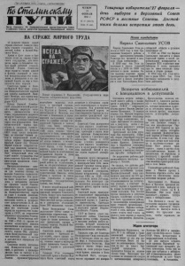 Пролетарий всех стран, соединпшпели\ 1й>úñüU iU tctíóJin Орган Северного РК Коммунистической партии Советского Союза и районного Совета депутатов трудящихся Новосибирской области Товарищи избиратели!27 февраля — день выборов в Верховный Совет Р СФ С Р и местные Советы. Достой- ными делами встретим этот день. •ш ....... ЧЕТВЕРГ 24 ФЕВРАЛЯ I955 г. № Iß (16119) Цена 10 коп. НА СТРАЖЕ МИРНОГО ТРУДА Наши кандидаты 23 февраля народы пашей страны отмечали славную тридцать седьмую годовщину Советской Армии и Военно-Морского Флота. Армия и флот зорко п бдительно стоят на страже Советского государства, его интересов, верно и беззаветно служат своей любимой социали- стческой Родине. Советские люди гордятся своими армией и флотом—надеждой п оплотом международных сил социализма и демократии в их священной борьбе за мир и безопасность всех народов Советская Армия и Военно-Морской Флот были созданы Коммунистической партией для защиты завоеваний Великого Октября, для охраны мирного созидательного труда народов СССР. Победа Великой Октябрьской социалистической революции вызвала звериную ненависть империалистов всех стран, стремившихся задушить молодую Советскую республику. В этих условиях советский народ под руководством Коммунистической партии приступил к созданию социалистической армии. 23 февраля 1918 года плохо вооруженные, но сильные' боевым духом и непреклонной волей к победе первые формирования Красной Армии под Псковом Нарвой нанесли сокрушительный удар немецким захватчикам, рвавшимся к Петрограду. Этот исторический день для судеб нашего государства стал днем рождения Красной Армии, ежегодным праздником советского народа. Империалистические хищники всех стран организовали три военных похода на молодое Советское социалистическое государство. Эти походы были полностью разгромлены, а интервенты изгнаны из пределов нашей Родины. Вдохновителем и организатором побед Красной Армии бы ла Коммунистическая партия во главе с великим Лениным. Коммунистическая партия, выполняя заветы и исторические предначертания В. И. Ленина, мобилизовала и направила все творческие усилия народа на строительство социализма в СССР, на укрепление оборонного могущества Родины Великая Отечественная война 1941—1945 гг. против немецких захватчиков явилась величайшим испытанием всех материальных и духовных сил нашего народа. Под руководством Коммунистической партии советские люди с честью и достоинством выдержали это испытание. Советские воины, воспитанные Коммунистической партией, в жестоких и кровопролитных боях за свободу и независимость социалистической Родины продемонстрировали 1 Плакат художника Е. Малолеткова. (Государственное издательство изобразительного искусства). величайшее мужество, стойкость н массовый героизм. ИодМосквой и Сталинградом, подКурском п Киевом, под Ленинградом п Минском, под Яссами п Кишиневом, в завершающем наступлении наших войск на главные центры гитлеровской Германии в начале 1945 года были одержаны блистательные победы. Советский народ показал чудеса храбрости в боях, невиданную самоотверженность в труде. Прогрессивное человечество будет всегда помнить о всемирно-историческом подвиге советского народа, о его больших жертвах, понесенных в священной борьбе за освобождение трудящихся Европы и Азии от фашистского рабства