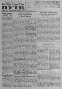 Пролетарии всех стран, соединяйтесь! 1ипСтаМимн&Щ П У Т И Орган Северною РК Коммунистической партии Советского Союза и районного Совета депутатов трудящихся Новосибирской области ЧЕТВЕРГ 7 АПРЕЛЯ 1955 г. № 28 (16131) Цена 10 коп. Трудящиеся района единодушно подписываются под Обращением Всемирного Совета Мира и трудовыми успехами скрепляют свои подписи. Приложим еще больше усилий к тому, чтобы в ближайшие дни закончить подготовку к полевым работам. Больше будем уделять внимания животноводству, в хорошем состоянии выведем его на пастбища. Больше внимание партийной учебе щ ст е и с В ч т е а в с ж л к е н о н е й и й я ш п и п а о м р л т и и т и и ус к я л и в о л в К я и о е е м т м с м я ун с о и и с у с н т о е - м те а о т р и е ч т е и ск ч о е е ск п о о го выш ур е о н в и н е я иде н й а тих кадров. Идеологическая зрелость, глубокое знание марксистско-ленинской науки д но ают ор н и а е м нт в и оз р м ов о а ж т н ь о с с я ть в п в р о а п в р и о л са ь х внутренней и внешней полати ки партии, мобилизовывать свои силы на выполнение н г в в р л ы о я а м х т н ь д с п и т е р о р р у з а е к н н д о ы ы в х о н , д ар с з т о а у в д д м о н а е ы ч л , м о хо п з о х я с о о й т с з а с у я т в щ в й л е е е с н н с т т н ст ы в м В ом и . ны к н у е л ш ь н т е у м рным уче с б т н р о о м ите г л о ь д у в системе партийного щения члены и кандид п а р т о ы свев р г ч р е л а ш е м н е м н а н и ы я п м ар я т н м и в а и т а е р р с н и к а о а р л г я о о д м у и П з л с у е ч н а у ю п м р т а о Ц хо К в Х н К о о р г П о о С ш С С о ов и ет р в а а т б о о р С т о а С й ю С с т Р ес . сии кр В уж ер к и при партийных организациях к б п а о а л га х з н о а д зо и м в с и т р « » т Н . о — в Н а и я к т ж о . л и а з е Г н в л ь , а » м — « а Б з п о д р р и о ь н , Северной МТС — т. Синкин и другие. Они систематически проводят занятия, готовятся к ним, увязывают преподаваемый материал с задачами района, колхоза, применяют наглядные пособия. Плохо организована учёба коммунистов и не налажен контроль за учебой я с т к е о л -л ьн е о ни у н з с у к ч у а ю ющ те и о х рию ма с р а в к м с о и п с с а т т р о тийиых организациях колхозов им. Ворошилова—секретарь т. Нервов, им. М. Горького—т. В я н в л и л а с д я т и е ам т м с и я р и о т в н р . е е б М ов а у л а д н о и и в з й и де т с е ь л к ьн к п о о р , м ед м ч ъ у т о с с ж р я е ед п и д р ал о к е п о к а л о г х а о н н з д е н а д и о к с р о т е в а ш то ен ч з н и д о й ес я ь в н е в т д а а е р т к ского Пленума ЦК КПСС. Партийной учебе должно б м ш ы а к н т о ь и л е а . у х д , е В л са ен м к о о р с - т ж о с я к е т а р е х ь л е ь з н н о и ое из п у о в ч л н а и и т ю н м и щ н з ы и м й м а т м н е а а о т д р е о и р ю и за а к л о , м н а ч р г и к л т с у ь и б з о м п к р о а о -л гр е и а н м з и у чить материалы январского Пленума ЦК КПСС и к ря у т ю ь п и р х оп в аг ж ан и д з у нь э , ти ве х ст р и еш п ш р е е н и т и р в й о о с з р а е т д о и ров к . олхозников и механи -----* — В райкоме и райисполкоме Итоги соревнования по надою молока к ч и и ес х д О к о о б я н г с р а о у о д д к о и с е о в з в р а е м и вн т о п о л о о г в о л и а к у н а ч , и е я н б со и ю ц к е р и о о л а х л в о и р ы з с о а с т й в о и к ве о т м а а К д П е С п С ута и тов испол т к р о у м дя р щ а и й х с с о я п н р о и ва з н н и а и ли ко п л о х б о ед з ителем в соревим. Калинина (председатель т. Тельный, ретарь парторганизации т. секБашков), получивший надой молока в марте по 144 литра на одну фуражную корову. н м и я н В а р р а у й п ч к е и р о т е м ь х а од к К я о щ П лх С е о е С зу к и