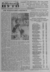 2 ПО СТАЛИНСКОМУ ПУТЛ 1 мая 1955 -года Ленинские дни в районе Широко отмочены ленинские дни в нашем районе. К Доме культуры состоялось заседание, посвященное 85-летию со дня рождения В. И. Лепина. С докладом выступил секретарь райкома КПСС т. Хват- ков. В заключение был дан концерт. Во всех библиотеках открыты выставки трудов Владимира Ильича и литературы о Ленине, сделаны монтажи о жизни и деятельности великого вождя. В районной и детской библиотеках прошли читательские конференции. Силами партийного актива н местной интеллигенции в колхозах, бригадах и животноводческих фермах проведены беседы на тему: В. И. Ленин- вождь трудящихся всего мира. Трудящиеся села Останинки и колхоза «7-й съезд Советов» отметили день рождения В.И. Ленина. С докладом о жизни и деятельности вождя выступил секретарь партийной организация т. Кириллов. Силами учащихся был дан Беседа о 85-й годовщине со дня рождения В. И. Ленина была проведена агитатором А. Н. Степановой на де- сятидворке. С большим вниматематическнй концерт. Хор исполнил несколько песен. Прочитан,ы отрывки из поэмы Маяковского о Ленине, о партии. Поставлена одноактная пьеса н рассказано несколько стихотворений. Т. Скороходов. нием слушали домохозяйки о светлой, прекрасной жизни и деятельности великого вождя. После беседы были показаны иллюстрации и фотоснимки. Районной детской библиотекой проведена читательская конференция с учащимися третьих и четвертых классов Северной средней школы, посвященная 85-й годовщине со дня рождения В.И. Ленина— великого руководителя-Комму- нпстической партии и Советского государства, вождя и учителя трудящихся всего мира. В подготовке к конференции активное участие принимали учителя Т. Д. Мартынова и А. 11. Гнутов. Они подготовили докладчиков, которые рассказывали о детских и школьных годах Ильича, особенно подчеркивая период школьного возраста. В помещении, где собрались учащиеся, был оформлен монтаж на тему: «Детские и школьные годы Ильича», книжная выставка. Учащиеся: Тамара Пепщрская, Галя Ма- ляревич, Алла Поджунас и Галя Коробейникова рассказали о жизни Володи Ульянова, который был мужественным, стойким, слово с делом у пего никогда не расходилось. В заключение рабопшкн библиотеки провели беседу о том. каким должен быть юный читатель. Он должен выполнять заветы Ильича, хорошо учиться, не нарушать дисциплины, любить книгу, бережно хранить её. А. Степанова, зав. детской библиотекой. На Совете Тартасской МТС Состоялся Совет Тартасской МТС, где обсуждался вопрос готовности к весеннему севу колхозов и тракторных бригад. Выявлено много ещё недостатков, которые должны немедленно быть устранены. Тракторные бригады обеспечены трактористами для двухсменной работы, а других членов бригад не везде достаточно. В колхозе «Новая жизнь» не закрепили повара, в нм. Ворошилова не найдут кого поставить на подвозку горючего. В артелях им. М. Горького и «Борьба за мир» нет вагончиков, Нельзя это считать мелочью. В некоторых колхозах зоны недостает семян, но мер к изысканию их не принимается. Не везде очищены семена. Не завезены ядохимикаты и минеральные удобрения. Недостаточно проводится воздушно-тепловой обогрев семян. Плохо готовятся к посадке кукурузы ка к МТС, так и колхозы. Не выкупают в рай- промкомбинате кукурузосажалки, только кое где начинают изготовлять конные II трак