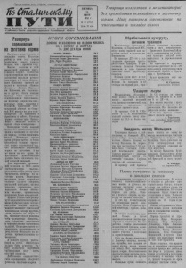 Пролетарии всех стран, соединяйтесь'. ШСшЛшмх&Щ П У Т И Орган Северного РК Коммунистической партии Советского Союза и районного Совета депутатов трудящихся Новосибирской области ПЯТНИЦА 24 июня 1955 г. № £0 (1753) Цена 10 коп. Товарища колхозники и механизаторы! Без промедления включайтесь в заготовку кормов. Шире развернем соревнование на сенокошении и закладке силоса Развернуть соернввонаеи на заоготкве кормов Наступает пора сенокоса и закладки сплоса. Колхозам района в этом году кормов необходимо иметь гораздо больше, чем в прошлом году. Многие колхозы к этой важнейшей кампании приготовились хорошо. Полностью отремонтировали все машины, достаточно поделали ручного инвентаря, к 1 июля заканчивают облицовку траншей для силоса в колхозах «Память Ленина», «Память Кирова», им. Калинина, им. Ворошилова и других. Здесь каждая бригада знает задание по сенокошению и силосованию, на машинах закреплены определенные люди, знакомые с техникой. Тракторный сенокосильный агрегат из Северной МТС выехал на луга сельхозартели им. Калинина н приступил к работе. Скошены первые гектары трав. Приступили к закладке сплоса в артели «Заря коммунизма». Необходимо, чтобы каждый колхоз без промедления включался в кампанию по заготовке кормов, с этим затягивать нельзя. Незаметно придет время уборки хлебов и тогда встретятся большие трудности, может получиться и так, что достаточного количества кормов не заготовим. А мы не имеем на это права. Общественное животноводство должно быть обеспечено тёплой II сытой зимовкой. Долг партийных организаций колхозов и МТС— вести систематическую массоворазъяснительную работу среди тружеников, занятых на заготовке кормов. Тракторные вагончики, места стоянок на сенокосе следует оформить наглядной агитацией, на всех участках обязательно надо выпускать «боевые листки» или «молнии», организовать агитщитки,Доски показателей. Широко должно быть развернуто социалистическое соревнование. Добиться такого положения,чтобы каждый агрегат, каждый машинист самоходной сенокосилки, косарь вручную, люди, занятые на уборке сена, закладке силоса взяли на себя конкретные обязательства, добивались выполнения и перевыполнения ежедневных заданий. Подводить итоги соревнования систематически и результаты обсуждать на коротких производственных совещаниях. В каждой группе, работающей на лугах, обязательно должен быть агитатор. Работу агитаторов партийным организациям надо взять под свой контроль. Действенное социалистическое соревнование обеспечит успех на заготовке кормов. ИТОГИ СОРЕВНОВАНИЯ ДОЯРОК И КОЛХОЗОВ ПО НАДОЮ МОЛОКА НА 1 КОРОВУ (В ЛИТРАХ) ЗА ДВЕ ДЕКАДЫ ИЮНЯ „ПАМЯТЬ ЛЕНИНА“ 134.2 Колмакова Екатерина Ивановна 168,0 Куликова Мария Демьяновна 154,0 Диль Лидия Ивановна 153,0 Вацпан Регина Игнатьевна 149,0 „ПУТЬ К КОММУНИЗМУ“ 127,0 Мокроусова Пелагея Петровна 166,0 Петрушенко Прасковья Власовна 151,3 Акатьева Мария Ильинична 147,1 Стейникова Александра Лаврентьевна 143,8 Дубоделова Варвара 140,1 Виноградова Зинаида Федоровна 139,5 Бритикова Нина Ивановка 134,7 Вяткина Таисья Михайловна 126,0 „ПАМЯТЬ КИРОВА“ 121,6 Станкевич Ксения Семеновна 146,0 Зырянова Евдокия Павловна 134,0 Пяйд Мая Эдуардовна 133,0 Осипова Аксинья Степановна 132,0 Боровских Федора Николаевна 132,0 Герлид Альвина Егоровна 131,0 Шумкина Мария Ефимовна 126,0 ИМ. МОЛОТОВА 111,6 Сотникова Лукерья