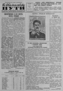 Пролетарии всех стран, соединяйтесь! ШССпаМишс^Лщ Орган Северного РК Коммунистической партии Советского Союза и районного Совета депутатов трудящихся Новосибирской области КОЛХОЗ „ЗАРЯ КОММУНИЗМА“ ПЕРВЫМ В НЫ Р Й АЙ Х О Л Н Е Е Б П Н О О Л В У О Ч Г И О Л У К РО ВИЖ Т А А Я Н . ЦИЮ НА СДАНВедут уборку и готовят зерно к сдаче колхозы: им. Калинина,„Путь к коммунизму“, „Память Ки р о в а им . Ворошилова, „Новая жизнь“, „Путь Сталина“ и другие. ПЯТНИЦА 5 АВГУСТА 1955 г. № 62 (1765) Цена 10 коп. СВОЕВРЕМЕННО И БЕЗ ПОТЕРЬ УБРАТЬ УРОЖАЙ! На нолях страны вес шире развертываются уборочные работы. Колхозники, работники МТС н совхозов, вдохновленные решениями июльского Пленума ЦК КПСС, соревнуются за проведение уборки урожая в сжатые сроки, за досрочное выполнение плана хлебозаготовок. Многие районы страны успешно ведут уборку н сдачу хлеба государству. Достижения передовиков на уборке — результат .умелого использования техники и всех производственных резервов колхозов, МТС и совхозов, результат целеустремленной организаторской н массово-политической работы партийных организаций. Январский Пленум ЦК КПСС признал совершенно нетерпимым такое положение, когда в результате затягивания уборки урожая допускаются большие потери зерна, и потребовал от Министерства сельского хозяйства СССР, Министерства совхозов СССР, местных партийных и советских органов развернуть настойчивую борьбу с потерями урожая. Решающим условием ликвидации потерь зерна является сокращение сроков уборки. Партия поставила задачу— организовать дело так, чтобы уборка зерновых колосовых культур в колхозах и совхозах началась своевременно по мере созревания и проводилась не более чем в десять рабочих дней. Важным средством борьбы с потерями урожая является раздельная уборка хлебов. Она позволяет начать косовицу в стадии высокой спелости, то есть на 4 — 5 дней раньше обычного, и сахранить на каждом гектаре, как минимум, 1,5— 2 центнера зерна. Хозяйственная целесообразность раздельной уборки никем не оспаривается. Сокращение сроков уборки немыслимо без высокопроизводительной работы комбайнов. Главное в социалистическом соревновании па уборке урожая — обеспечить высокую дневную выработку каждого комбайна. В прошлые годы, как известно, нередко об успехах той или иной МТС судили по сезонной выработке комбайнов. Это вело к тому, что недобросовестные руководители порой добивались увеличения выработки на комбайн за счёт растягивания сроков уборки. Нужно решительно пресекать подобную практику. Местные партийные организации призваны возглавить высокий патриотический подъем тружеников полей. Нужно умело использовать все многообразия испытанных средств политической и организаторской работы в массах, направить лучших организаторов и агитаторов к комбайновым агрегатам, на тока, в транспортные бригады. Партийным организациям следует шире использовать областную, районную и стенную печать. Июльский Пленум ЦК КПСС подчеркнул, что важнейшая задача партийных, советских и сельскохозяйственных органов, колхозов, МТС и совхозов в настоящее время состоит в том, чтобы своевременно и без потерь убрать урожай, досрочно выполнить план заготовок и закупок сельскохозяйственных продуктов, сполна засыпать семенные фонды, в достатке обеспечить животноводство кормами, добиться новых у
