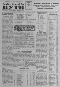 Пролетарии всех стран, соединяйтесь; ШСталинскими П У Т И Орган Северного ?К Коммунистической партии Советского Союза и районного Совета депутатов трудящихся Новосибирской области ЧЕТВЕРГ 22 СЕНТЯБРЯ 1955 г . № 7(5 (1779) Цена 10 коп. Колхозники сельхозартели им. Калинина первыми в районе выполнили план обязательных поставок и закупок хлеба. Завершена и уборка урожая. Не медлить суброной картофеля и овощйе ш ва ем Н п у ам п р о е а ч д з н а в я я и т т и м и ю ю еры е ж г и о п в о п от р н о д д о а в у л к о ь т д н и с е т в й ности, в своих постановлениях ЦК КПСС и Совет Министров СССР обязывают расширять п пл ос од ад ов ку на ка к р о т р о м ф о ел в я ые и цел к и о . рне В с с к я а о д л к х г а о о з д а к х арт о н т о а ф ш г е е о л г я д о а у . ве р л Н а и й е ч о к и н о в т а а о е р п т ы о е к ст о в л о х м оз , ы и за т н а и ко м й аютс к я ол о х в о о з щ , ево к д а к «Заря коммунизма» получает от продажи овощей большой н д е о п х л о о д д , о п в рои и звод к и а т рт з о а ф па е с л ы я ко д р л я корма скоту в зимний период. Намного увеличили посадку к ли ар н т и о н ф а ел и я у в же ко у л б х р о а з н е о и с м. п К ол а я н р 5 ся е и 0 й з ш о к п в о е р а й н о н ц н ы ы ен е т з о в п в е л . н у ь г Д я и л , . я ис э Д п т л о о я г л о ьз о б у р ыю г с т а т уборки картофеля здесь мобилизуются все силы, которые высвобождаются от ф уб е о л р ь ки и х д л а е ж б е ов. в К т о е па д л н и и, к к а о р г т д о а особое напряжение было на завершении уборки. Всё это з р а е ц з Н и у а л и ьт т а п р т л у о д щ п а р . а а д в и иль 1 но 5 й о ге р к г т а а н р и о в убрана картофель в колхозе в л л к и е у и и м т н н . о а в а в В , » и » о , к м , р о х . о л о и ш М т х м я о и о . з л л К е а о о щ р х т в у е о а п . в « т с а 7 е к В , - м й о е н й « д П , у ы с т ъ у и н т е м и ь з з . д у к С С б и т т о С е а а р о . А остальные колхозы медлят, чего-то ждут. Осенью нельзя располагать на погожие дни и надо сейчас пересмотреть ещё раз организацию труда на полях, уплотнить рабочий день и найти резервы рабочей силы специально для уборки картофеля. Затягивать с этим нельзя. Могут бытьморозы и тогда клубни подвергнутся порче. Чего никак не следует допускать. На будущий год с увеличением поголовья скота в р се я в т к ь о д л п р х у о о г с з и а а д х х к к у н о а р д к м о а о р в т б ы о уд ф х е е т л к я у р л а и ь с т ш у п р и о , к м о о рн б е о п л л ь о ш д о о е в. к З о н л а и ч ч и е т ст н во еоб се х м од я и н . Н ча а с до жи т в а о к т ж н е ов о о б д е с с т п в е о ч , ив о а с т о ь бе с н е н й о свиней, которые поставлены на откорм. Неубранного картофеля ещё н м зы ы н в о е а г е о т . о Т р п а г р к а а о н в е и л з е а п н ц о и л и я о и ж п ени к е п о а л р х т о о и з б о й я в принимать практические меры. Б н о ы ль о ш к у а ю зат п ь омо у щ ч ь ащ в и э е т с о я м д ш ол ко ж л . Р т н у ы яд е по ш д с н к л и о е . л У у в ч р е а о д щ к у о и т в ес т я и ак В в у е ю р в х о -К с р к р а р а б е с о с - т н е о л я ь р с с т к в о о й в шы к к о о л п ы ать взял ка и рт о о б ф я е з л а ь х с оз п Х е л о о р щ « о П ш а а д о м и я о т 1 р ь 0 га К г н и е и к р з т о о а в в р а а о » т в . ь в к тр о у л д п в ближайшие дни закончить эту работу. ние Об к е а с р п т е о ч ф и е т л ь я х и оро о ш во е щ е ей х . ранеВ соревновании на сдаче хлеба впереди идут колхозЫ: ИМ. КАЛИНИНА ЗАРЯ КОММУНИЗМА ПАМЯТЬ ЛЕНИНА ПАМЯТЬ КИРОВА ИМ. КРУПСКОЙ 100 процентов 9 7 7 1 0 9 . . . 1 1 5 67.5 Дали слабый прирост в сдаче хлеба за пятидневку колхозы: ИМ.КАГАНОВИЧА ПАМЯТЬ ЛЕНИНА ПУТЬ К КОММУНИЗМУ И другие. За успе