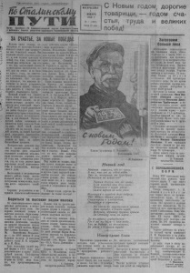 WC?j WV u ! ^ ^ v ^ L U f ? 4' ’ * * Пролетарии всех стран, соединяйтесь! I I У Т Р * * Орган Северною РК Коммунистической партии Советского Союза и районного Ссзета депутатов трудящихся Новосибирской области ЗА СЧАСТЬЕ, ЗА НОВЫЕ ПОВЕДУ! ЮСКРЕСЕНЬЕ 1 ЯНВАРЯ 1956 г. Лй 1 (1808) Цена 10 коп. С Новым годом, дорогие товарищи, — годом счастья, труда и великих ^Волока наша страна, необозримы её просторы.Рассвет каждого нового дня начинается над Советской землей. Мы первыми видим утреннее солнце, к нам первым приходит и новый год. Уже тридцать девятый раз встречаем мы его с тех пор, как великий Ленин провозгласил наступление новой эры на земле, и не было ни одного года, не отмеченного небывалыми, героическими событиями. Всё это время показало, что нпкакпе испытания не могут устрашить и остановить людей, познав- _ шпх радость и счастье свободного творческого труда. Каждый новый год ставит перед нами новые, всё более ответственные задачи, на решение которых должен подняться весь советский народ. Всей своей силой разрешали мы любое большое дело: создавали индустрию социализма, — решили задачу колдектнвпзйV ДНИ, в дни Великой Отечест- * венной войны защищали от фашистов нашу дорогую Родп- ну-мать. Всей своей силой взялись мы за подъем вековой целины, за новый быстрый рост народного благосостояния, п земля наша отблагодарила за труд, за заботу богатейшим урожаем. Исторические решения партии и правительства о крутом подъеме всех отраслей сельского хозяйства всколыхнули колхозную деревню, год от года она добивается успехов, год от года растут ряды передовых людей животноводства и полеводства, мастера своего дела. Колхозники и механизаторы нашего района также вносят большой вклад в общее дело построения коммунизма, подъёма всего народного хозяйства. Хороших результатов в минувшем сельскохозяйственном голу добились доярки колхоза «Заря коммунизма»: тт.Дем- чихпна, Мельникова, Дрючина, надоившие на каждую»фуражную корову больше чем но 20 центнеров молока, многие доярки колхозов: «Память Ле Нина», им. Кагановича, им. М. Горького и других. Высокой продуктивности скота добивались пастухи: тт. Агрыз- ков, Драган, Коль, чабан т. Атопкпна, свинарки: П. Шна кова, М. Симоненко и другие Наши славные механизаторы борются за повышение урожайности. В социалистическом соревновании первенство занимали тракторные бригады И. А. Буглееиа,Ф.Ф. Тарасенко, А. А. Штрауб, ко.чбаи новые агрегаты тт. Прокофьева, Смык, Усова, Аксентьева, Гергерта и многие другие! \ В новом, 1956 году, предстоят также большие задачи. И на выполнение их надо мобилизовывать все силы и средства, добиться ещё более высоких и лучших результатов во всей нашей хозяйственной деятельности! - 1955 год был годом больших достижений в ослаблении международной напряженности, укрепления великой дружбы между народами Советского Союза, Индии, Бирмы, Афганистана. Прошедший год был великим годом борьбы за мир и счастье. Новый, 1956 год во всех этих вопросах должен принести новые и большие успехи. Мир нужен не только, нам, мир нужен всем,кто верит ' в счастье на земле.Советские люди,трудящиеся великого Китая и других стран народной демократии создают это счастье своими руками. Все честные люди видят это, и с каждым годом ширятся ряды наших друзей и сторонников во всём мире. С Новым годом, дорогие товарищи! За новые победы! Бороться за высокие надои