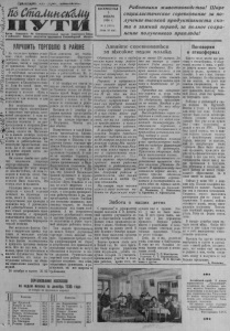 ПрФлетлржи всех стран, с&¿émHяШле с*/ Орган Северного РК и районного Совета Коммунистической партии Советского Союза депутатов трудящихся Новосибирской области ВОСКРЕСЕНЬЕ ! 8 ЯНВАРЯ 1956 г. № 3 ( 1810) Цена 10 коп. i Работники животноводства! Шире социалистическое соревнование за получение высокой продуктивности скота в зимний период, за полное сохранение полученного приплода! УЛУЧШИТЬ ТОРГОВЛИ) В РАЙОНЕ За последнее время в редакцию стало особенно много поступать жалоб на плохую Торговлю, писем о нарушении её принципов. Пишут трудя- Ш1Ь ся,руководители колхозов. ^0 серьёзных недостатках в обеспечении товарами первой необходимости пишут пз Иовс- 1'роицкого и Биазинского сельпо. Хотя бы такой факт, что несколько месяцев не было керосина в колхозе «Путь к коммунизму», затем дали один центнер и для колхоза и для Нет возможности купить колхозам сбрую, строительные п смазочные материалы, плотничий инструмент. А если поступают такие товары, то начинается волокита с их распределением и отпуском.Центнер смазочного материала,партнер, колхоз им. Кагановп- ( ча в начале декабря получал * , сутки и то потребовалось прив х о д и т ь в райпотребсоюз за- ^ меститедю председателя колхоза. Да и не один этот колхоз днями держит здесь людей и транспорт. На плохое снабжение рабочих жаловался. секретарь парторганизации Лячивского 1 лйСПримХиоа. По этот Вопрос не возник сейчас, об этом говорили и полгода назад. Вмешался в это дело зав. торг- отделом Надо полагать, что теперь дело ш правится. Редакция много писем трудящихся о плохой торговле печатает на страницах ш - зеты, много и цосылает непосредственно для проверки и принятия мер. У руководителей райпотребсоюза и некоторых сельпо укоренилась практика волокиты с проверкой, замалчивания фактов, или, хуже того, практика бюрократической отписки. Вот несколько фактов. Сигнал о нарушении правил торговли в магазине посёлка Касманка проверялся...43 дня. А ведь факты подтвердились и иришлось продавца наказывать. Кто же дал вам, т. Савельев, право так относиться к * жалобе трудящегося. Было бы вам известно, что после поступления сигнала вы обязаны немедленно заняться проверкой. 16 октября в газете № 83 были помещены две статьи, озаглавленные: «Нарушают принципы торговли» и «Обеспечить колхозы стройматериалами.» Обе корргспонденцш! были направлены в то-т ж< день в райпотребсоюз. Но до сих пор редакция ответа не получила. С 30 октября нет ответа на письмо учителей, которых Ново-Троицкое сельпо не обеспечивало мукой. Вопрос этот редакция разрешила иелокитель- но вместе с сельпо, а т. Савельев не соизволил и реагировать на это в какой-то мере. Письмом от 6 декабря редакция просила председателя райпотребсоюза обсудить жалобу на плохую торговлю в с. Федоровка. Ответа нет, как обычно. Возмутителен и такой факт, когда председатель Биазинского сельпо т. Фуфачев письмо селькора т. Павлова о нарушении правил торговли продавцом Ичкалинского магазина разбв(ал только с этим ж* продавцом Сорокиной. В ответе он оправдал Сорокину, а автора письма вычеркнул вз списка проживающих в Мало Карагаевском сельсовете. Было бы вам известно, т. Фуфачев, что Алексей Васильевич Павлов прошивает в деревне Бергуль, честно трудится i колхозе «Путь Сталина» и никак не хочет мириться с не допустимыми явлениями в торговле, с которыми примирился наш райпотреб