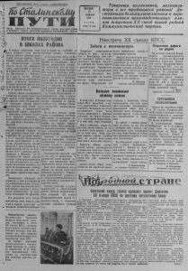 ПО СТАЛИНСКОМУ ПУТИ 19 января 1966 года Досрочным расчетом по всем денежным платежам встретим XX съезд нашей партии Ко всем колхозникам,рабочим и служащим района ОБРАЩЕНИЕ граждан села Гражданцево В решении задач, стоящих перед советским народом в деле строительства коммунизма, большое значение имеет успешное выполнение государственного бюджета СССР, принятого четвертой сессией Верховного Совета СССР на 1956 год. Досрочная уплата платежей в бюджет способствует не только выполнению, но и перевыполнению народно-хозяйственного плана 1956 года. Мы, граждане села Гражданцево, принимаем на себя следующие обязательства в честь XX съезда Коммунистической партии Советскоге Союза. Рассчитаться досрочно с- государством полностью за 1956 год: по сельхозналогу— к 1 февраля, по самообложению — к 14 февраля. Рекомендуем правлению колхоза «Заря коммунизма» к 14 февраля рассчитаться с государством но подоходному налогу с колхоза. Призываем последовать нашему примеру всех трудящихся района. Встретим XX съезд КПСС полным расчетом с государством по денежным платежам. Этим ещё больше укрепим могущество нашей социалистической Родины. По поручению граждан подписали: П. А. Алейников, А. И. Агрызков, П. К. Блохин, И. И. Драган, О. Р. Демчихина, М. М. Мельникова. В С. Устьянчик, М. М. Смык. Выполняют обязательства В ответ на заботу Коммунистической партии и Советского правительства о повышении материального благосостояния трудящихся, колхозники Сельхозартели «Заря коммунизма», рабочие и служащие села Гражданцево на общем сходе граждан единодушно решили досрочно рас на соревнование членов сельхозартели «Память Кирова», а также рабочих и служащих села Верх-Красноярки но досрочному расчету с государством. На следующий день этот вызов был принят на общем собрании членов колхоза «11а мять Ьирова» и граждан се считаться с государством ио ла Верх-Красноярки. Члены денежным платежам за 1956 год. Ко дню открытия XX съезда КПСС уплатить сельхозналог, самообложение и подоходный налог с колхоза. В обращении ко всем трудящимся района они призвали последовать их иримеру. Первым на этом собрании выступил один из старейших членов артели пастух нагульного гурта Илья Иванович Драган. «Я первым досрочно расчитаюсь с государством по всем денежным платежам и прошу последовать моему примеру всех колхозников»— сказал Илья Иванович.Тов.Драган является не только передовым членом колхоза,но и всегда досрочно рассчитывается с государством по платежам. Выступление т. И. И. Драган поддержали председатель артели П. К. Блохин, члены артели:А. И. Агрызков, С. И. Свиренков, П. А. Алейников, доярки М. М. Мельникова, О. Р. Демчихина и другие. На сходе граждан села Большие Кулики было единодушно поддержано обращение граждан села Гражданцево и в течение двух дней все налогоплательщики рассчитались за 1956 год по сельхозналогу и самообложению.Колхоз «Память Ленина» внёс подоходный налог. Здесь же было принято решение вызвать колхоза и работники Верх Красноярского сельпо уже внесли все причитающиеся с них денежные платежи. Полностью рассчиталась ио подоходному налш у и артель «Память Кирова». С большим иодъёмом проходили собрания по обсуждению обращения в коллективах Би- азинского сельпо и Биазин- ского маслозавода. Такой активный расчёт с государством по денежным платежам свидетельствует о хор