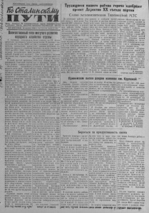 Пролетарии всех стран, соединяйтесь/ ЯеСш М иш &Щ П У Т И Орган Северного РК Коммунистической партии Советского Союза И оайонногп Совета депу татов трудящихся Новпсибиогко# области ВОСКРЕСЕНЬЕ, 22 января 1956 г № 7 (1М4) |цена |0 коп ВзличоБтвенный план могучего развития народного хозяйства страны будет доведен до 11 мпллпвстретили трудящиеся проект Директив XX съезда КПСС но шестому пятилетному плану развития народного хозяйства СССР на 195(1—1900 годы, в которых предусмотрен дальнейший бурный рост производительных сил страны социализма. В новой, шестой пятилетке трудящиеся Советской страны будут решать тлавную задачу —обеспечение дальнейшего мощного роста всех отрасли народного хозяйства на базе преимущ*ствонного развития тяжелей промышленности, непрорывною Технического про гресса и повышонпя производительности труда, осущест вление крутого подъема сельскохозяйственного производства с тем, чтобы на этой прочной осн'ве значительно Повысить материальное благосостояние п культурный уровень советского народа. В соответствии с мудрыми ленинскими указаниями о преимущественном развитии тяжелой промышленности проектом Директив иредусмо)рено, при общем росте промышленной продукции за пятилетие примерно на (55 процентов, уве лич'-ние ироп *во 1ства средств проп водства примерно на 70 Процентов II предметов Потребления—примерно на СО процентов. Больше Чем В НОЛЮ ра ра щ будет выпущено чугуна, стали, пр< ката, добыто угля, почти в 2 раза возрастет добыча нефти и производство электроэнергии. Для повышения удельного веса гидроэлектроэнергии предусмотрено широкое строительство гидр- электростанций.Особый размах иртбретает оно на реках Сибири. Проект Директив устанавливает также в качестве первоочередных задач развитие цветной металлурши, химической промышленности, быстрый рост машиностроения, особенно производство техники совершенных станков, кузнечно- прессовых машин/ средств автоматики и приборов. Значительное увеличение выпуска продукции должны дать действующие предприятия за счет повышения ир -пз- водптельности труда, лучшего использования имеющихся производственных мощностей, модернизации и замены устаревшего оборудования, ликвида- ции «узких м-ст», налаживания ритмичной работы, а также за счет других внутренних резервов. Огромные задачп стоят в новой пятилетке перед тружениками сельского хозяйства. Проектом Директив предусмотрен крутой подъем земле- Дешя н животноводства. В Щ О году валовой Соои зеоад ардов пудов. В полтора—два, два с половиной раза возрастет валовая продукция технических культур, картофеля, ОВоЩ-й и продуктов животноводства. Для дальнейшего подъема зернового хозяйства необходимо довести уже в текущем, 1950 гоау посевы на целин ных н залежных землях не менее чем до 30 миллионов гектаров й продолжать освоение новых земель Ь восточных и других районах страны. В целях резкого сокращения потерь зерна при уборке сроки ее должны быть резко сокращены. Для решения этих грандиозных задач колхозы, МТС и совхозы получат болыш-е количеств- совершенных тракто- р-'В. комбайнов, вин |р-уэров, автомашин и другой сельскохозяйственной техники. МНОЮ минеральных удобрений и химикат в. Долг тружеников; села—умело использовать эту! технику и на основе широко го использования досшжений науки и передового опыта до бпватьс