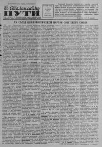 Пролетарии всех стран, соединяйтесь! fieСталинciCéMif П у I 1 и Орган Северного РК Коммунистической партии Советского Союза и районного Совета депутатов трудяшился Новосибирской области — ■маичв'-юч .:^_.-лд1!_к__иа;;__ ц -дя н и ш « " . 41. IJl■»l■^■^няцL^l^a ‘^лJaaaiiiL. ВОСКРЕСЕНЬЕ I 19 ФЕВРАЛЯ 1956 г. I № 15 (1822) I Í Цена 10 коп. • Товарищи! большой и славный путь прошел советский народ. Под руководством своей Коммунистической партии он добился великих исторических завоеваний. Наши победы достигнуты в суровой борьбе с внешними и внутренними врагами. На этом пути советский народ преодолел немало трудностей и невзгод. Он последовательно и твердо претворяет в жизнь планы преобразования страны, грандиозные планы развития социалистической экономики. (Из доклада тов. Н С. Хрущева). XX СЪЕЗД КОММУНИСТИЧЕСКОЙ ПАРТИИ СОВЕТСКОГО СОЮЗА XX съезд Коммунистической партии Советского Союза продолжает свою работу. На утреннем заседании 15 февраля, проходившем под председательством тов. И. В. Ка питонова,с отчетным докладом Центральной Ревизионной Комиссии КПСС выступил Председатель Ревизионной Комиссии тов. П. Г. Москатов. Затем началось обсуждение отчетных докладов Центрального Комитета КПСС и Центральной Ревизионной Комиссии. Слово предоставляется тов.- Е. А. Фурцевой (Московская городская партийная организация). Крупнейшие политические и экономические мероприятия, проведенные под руководством Центрального Комитета, говорит она, еще более укрепили строй, еще более упрочили Союз рабочего класса и крестьянства, дружбу между народами СССР. Тов.Фурцева приводит факты, характеризующие деятельность партийной организации Москвы. Промышленность города, выполнив досрочно задание пятой пятилетки, выпустила сверх плана более чем на 18 миллиардов рублей продукции. Значительное место в выступлении т. Фурцевой было уделено вопросам жилищного строительства. В шестой пятилетке намечается построить 9 миллионов квадратных метров жилой площади, большое колпчес;во школ, больниц, кинотеатров и т. д. На строителей,архитекторов и скульпторов столицы возлагается почетная задача— воздвигнуть в Москве величественный памятник основателю Советского государства и Коммунистической партии Владимиру Ильичу Ленину— Дворец Советов. В заключение т. Фурцева заявляет, что Московская партийная организация пришла к XX съезду как никогда сплоченной вокруг ленинского Центрального Комитета Коммунистической партии.что коммунисты п все трудящиеся столицы не пожалеют сил и энергии для решения задач, поставленных в шестой пятилетке. Затем выступил тов. А. И. Кириченко. Оценивая итоги работы, проделанной партией после XIX съезда, т. Кириченко отмечает, что за прошедший период еще более тесным стало единение партии и народа. Тов. Кириченко говорит об успехах трудящихся Советской Украины, которыми они встретили XX съезд КПСС. Намеченный пятым пятилетнпм планом уровень промышленного производства республика выполнила за 4 года. В минувшем году в республике планы производства зерна, подсолнечника, овощей и других культур ’ перевыполнены. Лучше чем когда-либо ..колхозы п совхозы Украины справились с производством сахарной свеклы. Увеличение валового сбора зерна дало возможность Украине; сдать сверх плана более 160 миллионов пудов хлеба. В течение пятилетки республика обого- тптся новыми крупными пре