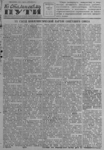 O l l лгтврии всех стран, соединяйтесь! ШСпшАша&Мц Орган Северного РК Коммунистической партии Советского Союз и районного Совета депутатов трудящихся Новосибирской облети j ВОСКРЕСЕНЬЕ I 26 | ФЕВРАЛЯ 1956 г. I № 17 (1824) j Цена 10 коп. Шире развернуть инициативу и творческую активность миллионов рабочих, колхозников, интеллигенции, по-боевому организовать и возглавить всенародное социалистическое соревнование за выполнение и перевыполнение шестого пятилетнего плана. XX СЪЕЗД КОММУНИСТИЧЕСКОЙ ПАРТИИ СОВЕТСКОГО СОЮЗА Утреннее заседание 20 февраля открылось под председательством тов. М. а . Ясно ва. Съезд продолжает -обсуждение отчетных докладов Центрального Комитета КПСС я Центральной Ревизионной Ко- ЛШ£Спи КПСС. Первым выступил тов. И.Д. Мустафаев (Азербайджанская .парторганизация]. За отчетный период, говорит он, Центральный Комитет смело выдвигал и творчески решал жизненно важные вопросы дальнейшего экономического и культурного развития нашей ’одины. Советский Союз стал .одной пз крупнейших индустриальных держав мира. Значительно укрепилось международное положение Советского Союза и всего социалистического лагеря. Тов. Мустафаев говорит затем о ленинской национальной политике партии, об экономическом п культурном развитии Азербайджана. За последние два года л республике выявлены новые богатые месторождения нефти и газа. Нефтяники республики обещают досрочно выполнить план добычи жидкого горючего,предусмотренный проектом Директив по шестой пятилетке. С приветствием от Коммунистической партии Индонезии выступил тов. Д. Н. Айдит, тепло встреченный присутствующими. Общность целей п совместная борьба за мир и свободу человечества, говорит тов. Айдит, сблизили народы Индонезии н Советского Союза. ЦК Коммунистической партии Индонезии получил тысячи писем от индонезийских рабочих, крестьян, интеллигенции и молодежи с просьбой передать от их имени привет XX съезду КПСС и народам Советского Союза. От имени Монгольской народно-революционной партии п трудящихся Монгольской Народной Республики с приветствием выступил тов. Ю. Цв- денбал, встреченный- продолжительными аплодисментами. Вся деятельность Коммунистической партии Советского Союза, сказал он, является ярчайшим примером беззаветного служения интересам народа, делу борьбы за демократию и социализм, образцом претворения в жизнь марксистско-ленинской теории. Монгольская народно-революционная партия неустанно воспитывает и впредь будет воспитывать трудящихся МНР в духе бессмертных идей марксизма-ленинизма, в духе нерушимой братской дружбы с народами Советского Союза, Китайской Народной Республики и стран народной демократии, в духе международной солидарности трудящихся в борьбе за мир, демократию Р социализм. Далее с речио выступил тов. К. Е Ворошилов Тов. 3. И. Муратов (Татарская парторганизация) говорит об огромной работе, проделанной Центральным Комитетом но дальнейшему повышению организующей и руководящей роли партии, укреплению единства и сплоченности её рядов. Главное внимание в своём выступлении тов. Муратов уделяет развитию нефтяной промышленности. В новой пятилетке, говорит оратор, почти половину прироста добычи нефти но стране должна дать Татария. Партийная организация, нефтяники республики сделают всё, чтобы успешно выполнить это ответственное задан