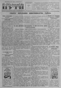 Пролетарии всех стран, соединяйтесь! Оргаь Северного РК Коммунистической, партии Советского,Союза ирайонного Совета депутатов трудящихся Новосибирской области ВОСКРЕСЕНЬЕ !| Ч* 1 О АПРЕЛЯ 1956 г. j № 30 (1837) I Цена 10 коп. ! Товарищи колхозники! Поддержим почин участников районного совещания, животноводов. Развернем борьбу за организованное завершение зимовки, за получение высокой продуктивности скота в течение всего сельскохозяйственного года. ГОВОРЯТ ПЕРЕДОВИКИ ЖИВОТНОВОДСТВА РАЙОНА I I )> > 1 ) ► Лучше использовать к о р м а (Из выступления М. М. ДРЮЧИНОЙ —доярки колхоза „Заря коммунизма") Дояркой работаю третйигод. н р В е а р ж п а н е у р м в ю о ы л й к ок о г р а .о . о д в З у а н т а п е д о м ои 1 л п 4 а р ,3 ио н б а ц ре е ф л н у а т о ч п ил ы а т п и о в 2 1 1 9 ,7 55 го ц д ен у т у н ж ер е а. пол А ув р э у т г о а м ми году по м р ы або со те своими в п з о я дл и обязательство надоить по 25 центнеров нафуражнуюкорову. Достичь этого можно при условии строгого выполнения р г б о а о с в п и но о с р г п я о о д л к ь о а з т о н в о д а ш н н я е и н , я и р я а к ц о и р к м он о с а в в л , о ь е л н м о ю у н с д д т я е о и й е л м м у , . н к е ст с Р ор к р а о о с м л п г и о ь о м : к р . о в я о д П - р о в о а к р и з е м м в я т м ё ы д д п е о н л и в ь о м ы . й , п ч Д в о и о а л ём сплос кукурузный. Солому задаём только в запаренном п с е д т об е р ё ен х н о о р м ош в о ид и е, да с ё к т от при п б о а е в д к а у молока.А если дадимсолому не сдобренную и не запаренную, я от своей группы в день не дополучаю 10 лптровмолока. П зо о в э а т н о и м е у, к р о а р ц м ио о н в а —л б ь о н л о ь е ш и ое сп д ол е ь л о в повышении продуктивности. По итогам за март наша ферма упустила первенство. Но мы заверяем,что по итогам за апрель знамя вернём. ЗА ВЫСОКИЙ НАГУЛ СКОТА (Из выступления А Т. КУЛИКОВА —пастуха колхоза „Память Ленина“) Семь лет пасу я скот. Год от года добиваюсь повышения н су а т г о у ч л н а ы . й В пр п и р в о е ш с л п ы а сйе г з о о л н ов е у же в м ви о л ё В м б э о н т л а о г е м е уль 7 г н о 0 о д 0 м у гр г с а у н м р о т в м е а ов. на со би с р та аю группу п постараюсь добиться более высокого нагула. Буду и са спо и ль в з о о д в о а п т о ь й. правильно выпа ■ V7’. ■ У/’.У Т -fjT.<S/~- % ------------ --------------- § V РОСТ » доходов колхозников Директивы XX съезда К ли П ч С е С ни о е пре д д е е н л е я ж ю н т ых уве и натуральных доходов колхозников в среднем не менее чем на 40 п т р и о е. центов за пятиле5 апреля состоялось районное совещание доярок и пастуков-скотников. С докладом выступил председатель райисполкома т. Стряпченко. Он рассказал о задачах, поставленных X X съездом КПСС перед животноводами, о наших возможностях для выполнения этих задач, о передовом опыте и недостатках в получении продуктивностискота. Участники совещания приняли обращение ко всем работникам животноводства района. На совещании были вручены Дипломы районного Совета депутатов трудящихся и подарки дояркам: О. Р. Демчихиной, М . М . Дрючиной, М . М. Мельниковой и М . Ф. Новиковой; пастухам: А.Т. Куликову и И. И. Драган. Ко всем работникам животноводства, ко всем колхозникал района О Б Р АЩ Е Н И Е районного совещания доярок, пастухов-скотников и зооветспециалистов Товарищи! В директивах XX съезда партии п р д д о ы о одн ш И н о а е г с м о т е м о ч х м и е о н у л з л о я и й п а о я с р б д т т е о в и с а л в п е е т п С ч н у С и е д С т м о ь Р в у н в п п а л р г а о о н 1 д и 9 у з 5 , в 6 о р д а а с — з т п в в р и о о т 1 и и 9 