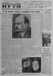 Пролетярии всех стран, соединяйтесь! Оргаь Северного РК Коммунистической партии Советского Союза и районного Совета депутатов трудящихся Новосибирской области : ВОСКРЕСЕНЬЕ | 22 АПРЕЛЯ 1956 г. I № 34-35 С1842 | Цена 20 коп. Владимир Ильич Ленин живет в великих делах Коммунистической партии Советского Союза, в новых успехах нашей Родины, уверенно идущей по пути к коммунизму. В. И. Ленин— вождь трудящихся всего мира i Сегодня исполняется 8G лет со дня рождения Владимира Ильича Ленина— величайшего Шь »' ' Щ гения человечества, основателя п руководителя Коммунистической партии, создателя первого в мире социалистического государства, вождя и учителя трудящихся всего лира. 1) Ленине воплатилось всё. что есть в пролетариате поистине великого и героического,— бесстрашный ум, железная, несгибаемая, всё преодолевающая воля, священная ненависть, к рабству и угнетению, революционная страсть, которая двигает горами, безграничная вера в творческие силы масс, громадный органирого и близко трудящимся Советского Союза и всех стран мира,с этим именем связаны великие победы нашего народа в строительстве социализма. С первых шагов своей деятельности, начавшейся в девяностых годах прошлого столетия, В. И. Ленин отдавал % все. свои силы, всю свою энергию великому делу освобождения людей труда от ига капиталистического рабства. Он выступал как верный последователь учения Маркса и Энгельса. Ему принадлежат громадные заслуги в дальнейшей разработке марксистской науки и законов развития общества. Ленин поставил вопрос о главной, решающей роли народа, как творца истории, как созидателя всех материальных и духовных благ. Ленину была присуща глубокая вера в народ, в его неиссякаемую энергию и инициативу, в его способность совершать гигантскую работу по переустройству общества. Величайшая заслуга Владимира Ильича состоит в том, что он указал на авангардную роль русского пролетариата в международном революционном движении, создал и * выпестовал партию, как великую преобразующую силу общества. Коммунистическая партия объединила рабочих и крестьян нашей страны, привела наш народ к победе Великой Октябрьской социалистической революции 1917 года, к построению социалистического общества. На многие десятилетия вперёд Ленин видел пути развития Советского государства, в своих трудах указал пути строительства соцнализма и коммунизма в нашей стране. Особое внимание уделял развитию тяжелой индустрии, огромное значение придавал электрификации страны. Глубоко и всесторонне разработал вопрос о путях перестройки деревни на новый лад. Следуя по пути, указанному Лениным, Коммунистическая партия привела наши народы к победе социализма. За короткий срок наша страна из отсталой аграрной превратилась в могучую индустриально-колхозную социалистическую державу. Уже к концу первой пятилетки Советский Союз обогнал все европейские страны но объему производства тракторов, автомобилей, комбайнов. В результате выполнения второго пятилетнего плана мы по общему объему промышленного производства вышли на первое место в Европе. В нынешних условиях, когда трудимся над выполнением исторических решений XX съезда КПСС, партия последовательно проводит политику преимущественного развития тяжелой промышленности. XX съезд партии определил главные задачи шестого пятилетнего плана