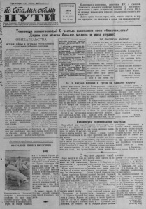 Пролетарии всех стран, соединяйтесь! П У Т И Оргаь Северного РК Коммунистической партии Советского Союза и районного Совета депутатов трудящихся Новосибирской области ВОСКРЕСЕНЬЕ 3 июня (956 г. № 46 (1853) Цена 10 коп. Колхозники и колхозницы, работники МТС и совхозов, специалисты сельского хозяйства! Боритесь за быстрейшее претворение в жизнь исторических решений XX съезда КПСС, за крупный подъём всех отраслей сельскохозяйственного производства! Дадим стране больше зерна, мяса, молока, шерсти и других продуктов для населения и сырья для промышленности! (Из призывов ЦК КПСС) Товарищи животноводы! С честью выполним свои обязательства! Дадим как можно больше молока и мяса стране! За высокие надои О Б Я З А Т Е Л Ь С Т В А пастухов дойных и нагульных гуртов колхозов — участников районного совещания молока и большого ежесуточного привеса скота нагульных гуртов. В директивах X X съезда партии по шестому пятилетнему плану поставлены большие задачи перед работниками жи- -вотноводства. Намечено производство молока и мяса увеличить в два раза. Эти задачи есть возможность в районе выполнить досрочно, в 2—3 года. Большая роль в этом принадлежит пастухам. Отмечаем, что за май месяц этого года — начало пастьбы. — неплохих результатов добились такие пастухи, как Мартын Егорович Келль, из колхоза „Заря коммунизма“ , получивший за 20 дней мая по 84,5 литра молока на фуражную корову своего гурта, Пётр Максимович Литвяков, из колхоза „Память Ленина“ , получивший по 91 литру на фуражную корову за этот же период, Ил ь я Иванович Драган, из колхоза „Заря коммунизма“ , добившийся надоя по 6 литров в сутки на корову закрепленного гурта. Но многие имеют пока неважные результаты, и нам ещё предстоит многое сделать, чтобы добиться высокого надоя Учитывая наши возможности, мы берём на себя обязательство в пастбищный период получать не менее 10 литров молока в сутки на каж- дую фуражную корову. Добиться надоя на фуражную корову: в июне не менее 300 литров, в июле и августе—по 350, в сентябре — 300 литров. Получить суточный привес на каждую голову крупного рогатого скота нагульных гуртов не менее 700 граммов. Подготовить нагульный скот для сдачи государству выше средней упитанности. Но надо, чтобы правления колхозов помогли нам в организации ночной пастьбы, водопоя, зелёного конвейера. Мы призываем всех пастухов района и других работников животноводства включиться в социалистическое соревнование и по примеру наших лучших товарищей добиваться хороших показателей по надою молока, бороться за досрочное выполнение задач,поставленных X X съездом нашей партии. 30 мая в районном центре проходило совещание пастухов дойных и нагульных гуртов кол хозов района. С докладом о повышении про дуктивности скота и задачи па стухов выступил председатель райисполкома т. Стряпченко. Многие пастухи поделились опытом и взяли на себя повышенные обязательства. Скотнику-пастуху колхоза „Заря коммунизма“ М. Е. Келль вручен диплом „Лучший пастух“ и наручные часы. Награждены грамотами райсо вета пастухи т. т. Лушов, Кре- стьянова, Арутюнов, Драган, Никитин. Грамоты и подарки вручены тт. Роговой, Литвякову, Климиной, Романюк. Участники совещания просмот- |рели два сельскохозяйственных фильма. С 1 октября по 1 мая доярки нашей фермы (д. Граж- данцево) надоили больше, чем по 11 центнеров на фуражную коров