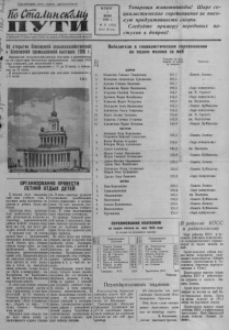 Пролетарки всех стран, соединяйтесь! VJ * / ВСтаЛшшОМй 0>^ТЧЙ1 Орган Северного РК Коммунистической партии Советского Союза и районного Совета депутатов трудящихся Новосибирской области Товарищи животноводы! Шире социалистическое соревнование за высокую продуктивность скота. Следуйте примеру передовых пастухов и доярок! ЧЕТВЕРГ 7 ИЮНЯ 19Г»в г. № 47 (1854) Цена 10 коп. 66 открытии Всесоюзной сельскохозяйственной и Всесоюзной промышленной выставок 1956 г. Победители в социалистическом соревновании по надою молока за май ^ Всесоюзная сельскохозяйственная выставка и размещенная ® па её территории Всесоюзная промышленная выставка 1956 * года открылись для посетителей 4 июня. £ Выставки работают ежедневно с 1 до 23 часов, а павлиь- ) оныдо 20 часов. В воскресные и праздничные дни выставки открываются с с 9 часов. ТАСС. ОРГАНИЗОВАННО ПРОВЕСТИ ЛЕТНИЙ ОТДЫХ ДЕТЕЙ щий В ш эт к а о п лах уч и е д б ё н т ого зав г е о р д ш а. аю В п б за о о м д л н о е в н ы и ы . не и ию р н е я бя з т а а кон б ч у а д т у ся т э св к о ц те и л й Д и , ир п п е р р к е о т д о ф с р е с а о д ю ат ш з е н к л ы о и х л, ко о л р р х у г о к а з о н о в и в о з д а и и секретари парторганизаций, м х р о а а й д т В к и ь о т м ь п н р а о л д В ш е Л т л т К н о е и С м м й М , г о о к т д а д д к у о ы л х ж б н у н д д ы е е е т т с е п о й о п в . д р с у е о м удачно было с организацией п ге и р о е н й е . рск В и м х ес м то ежк т о р л ё х х озны от х кр л ы а т ь сумели только один, да один профсоюзный. Много детей оказались предоставленными л л с з а о и а м в т , , и е в м а ы п н у с о т е п с ё б о и в е т л о . о и к м Пр р з а а е в н ш л е е е с н н ч и и ёт я я за о к с б о е л д о х а п о выполнили с з в ы ои « х Пу р т е ь ше к ни к й о . мм То у л н ь и к з о му к » о , л и х м о. Ворошилова, им. Кагановича, им. Крупской и им. Маленкова перечислили деньги. В этом году решено открыть один профсоюзный лагерь в к се о л л о хоз Г н р ы а й ждан н ц а ев 6 о 2 и ч о е д л н о и ве м к е а жв Северном. Деньги перечислены к м о у л » х , оз « а Б м о и рь : б « а Пу з т а ь к ми ко р м », мун « и 7 з - й съезд Советов.» Остальные пока медлят. ж га е н Ш из к о н о в а л а д а н о м но в г и о с м в о е о т т ю д ь ы о х ч а п е л р а у е н д ч ы ь ащ т и а х к о р ся. В июне намечено провести соревнование волейбольных команд семилетних и средних ш в го я к щ д о а е л . н , ны X К I й I о с э л к т ё о и т н м ча п н и и м о ю е н р е о у р п ч о р е в и б , я н т о п и г о я о с м надо тщательно готовиться. н ш е и й х По ш к к л п о р а л и с ы с м о е в с ру у о ч р а г С щ а е н и в и е м з р и о н с в о я а й ть с с т р а п е р о д ходы по изучению родного края. После чего провести слёт юных туристов. Не плохо будет при школах открыть лагери и разумно там проводить отдых. Увязывать это, может быть, с работой в колхозах, на пришкольных участках. д за о п в и , с э и кскур н с а и О б й л р , ю га с д н б е о и н р з и а й ц г , е и р я б р а п а р б о и о х я т о , а л к е р з у Р н ж а о к з . о н в ооб и ра т з . ны д м .—-в м с о ё ж э е т т о бы п т о ь отдых. Следует только хорошо продумать все его стороны и приложить желание к тому, чтобы он прошёл с пользой для будущего учебного года. На школы в этом ложится большая ответственность. В с д п в у у о м с и к а о х т в ь ко уч л и л о т е б е к л т е и о й в ч а е х р и е с д л н е п о д и с у т о е и н т ер п в о о о т ж за а ц т и ы и х, ра о б в ю о т з ы мо с жно у с ч т а я щ х и о м рг и а с н я ив летний период. Партийные и комсомольские организации в н I с у ё ю лах пом д о о щ лж ь н ш ы ко о л