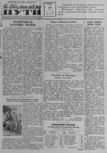Пролетарки всех стран, соединяйтесь} П У Т ргаь Северного РК Коммунистической партии Советского Союза районного Совета депутатов трудящихся Новосибирской области РАЗВЕРТЫВАТЬ ЗАГОТОВКУ КОРМОВ ш С большими трудностями в ряде колхозов района прошла зимовка общественного животноводства. Поэтому МТС. нрав- лениям и парторганизациям следует из этого извлечь уроки. Б наступающую кампанию заготовок кормов необходимо тщательно проверить всё ли готово к сенокосу и закладке силоса, принять срочные меры к завершению подготовки, довести задания,правильно распределить технику и людские силы. Предусмотреть всё до малейшего. 15 нюня к заготовкам кормов приступают в колхозе «Путь Сталина». II надо сказать, что здесь проделана большая подготовительная ра-1 бота. Вопрос этот был обсуждён на партийном собрании, разработан план массово-политической работы, утверждены агитаторы, готовится концертная программа. Намечено выпускать многотиражную стенную газету и боевые листки, освещать ход соревнования. Учреждены переходящие красные вымпелы, разработаны меры поощрения. До каждой бригады здесь доведено задание, утверждены рабочие планы на бригадных собраниях. Доведено задание до каждой бригады животноводов. Подготовлен весь ручной инвентарь: косы, вилы, грабли. Расчищены сенокосные уго- дия, готовятся сенокосилки и конные грабли. Для подвозки силосной массы решено использовать 50 пароконных подвод. Необходимо ещё поделать волокуши для подвозки массы на тракторах. Заготовку кормов надо начинать без промедления. Для силосования трава подросла. Через несколько дней она будет пригодна и для сена. Все силы необходимо мобилизовать в этот ответственный период и заготовить кормов вдостатке. Труженики Маслянинского района выступили с инициативой произвести полуторагодовой запас кормов. В наших колхозах такая возможность также есть. Следует только серьёзно придумать организацию труда и использование техники. Сейчас, наряду с закладкой силоса есть большая необходимость вести заготовку веточного корма. В этом у нас возможности неограниченные. Па эту работу можно организовать учащихся и престарелых колхозников. Не надо забывать и о том, чтобы создать бригады и с первых дней уборки урожая вести скирдование соломы. Партийные организации в период заготовки кормов должны стать подлинными организаторами колхозников, развернуть широкое социалистическое соревнование и помогать людям, создовать им условия для выполнения взятых обязательств. Товарищи колхозники! Выходите на луга! Заготовим как можно больше кормов для общественного животноводства. ---------------- -----□ --------------- ------- Материальная заинтересованность—мощный рычаг подъёма производительности труда Грозненская область. зыву партии работник Ки П зл о яр п с р к и о - г н о им рай и к з о п м е а р п в а ы р х ти и и зъД я .И ви .Г л оре ж л е о л в ан о и д е поехать на работу в деревню. Колхоз имени Ворошилова, где Д. И. Горелов стал председателем был отстающим, экономически слабым, Поднимать хозяйство оц решил с развития его основной отрасли—овцеводства. Чтобы до-: д б у и к т т ь и ся вн у о с с п т е и ха ск в ота п , овыну ш ж е н н о ии б п ы р л о о создать прочную кормовую базу и привлечь массу колхозников к энергичному творческому труду. д с з К е а у о я . р н п В м а о о с 1 в н е 9 о в а 5 й ы 4 12 в г 0 э о о т п д о г р у й