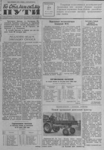 5 7 Пролетарии всех стран, соединяйтесь! В С т М и и ж Щ П ^ Т Г Ж * Оргаь Северного РК Коммунистической партии Советского Союза и районного Совета депутатов трудящихся Новосибирской области Тракторные бригады тт. Костюкова, Фу- лавкиной, Зарубина и Буглеева, из Тартасской машинно-тракторной станции, приступили к сенокошению в колхозах им. М. Горького, им. Крупской и им. Кагановича. В четырёх бригадах за первые два дня скошено более 90 гектаров трав. МЕДЛЕННО ВЕДЕМ ЗАКЛАДКУ СИЛОСА ш о н н о о е е С д и в м о л с й е е о н с х с т ы о д х ж о л и к в ж в о о е р н к т о о н в з р . ы а м х н о Э , и т во м о а м ат м о ь о с л б р о о о б а к л ц ен о ь и г р о о н ш н о ый у к с о в р о м ил . и Пол р ь у з к у ов е о г д о ите х л о и к о л х о з о в и работники ф л хо е е н з р о н м в ы . м р И и ай в т о е с н м ё а - п т а а в м к е и и де в т о с ч я р ен яд ь з е ак к л м о а е л д д ка силоса. Состоялось решение бюро р в т а а а т й , ь ком в о с а б е яз и ы си в и л а с ыю п щ о н л е а к е ом эт а у м р о в а б а й и ж с л о н и в у з е ю о и неотложную работу, до к в д а л е ж е но н д и о з я й ад в а с н е с и в л е о ь . и х х о Д з а а р р а т и б е о л ч с и и ам х и д п п о л р в а е а н ку ах си п л р о ед са усма и т з рив д а и л к и ора з с а т к у л щ ад и х трав и кукурузы. Но кое-где несерьёзно готовились к столь в т л ы а и ж ку н н е о е м й р к с а в д а о м у д ю п к а т у н . и Н и п иж и о е р з м е а з ы к у л л а ь п д т у к а б е силоса по состоянию на 20 июня. Из 17 колхозов только 8 начали эту работу. II то н то у л л О ь и д к и о к н а н к к о а л ч сл х а о л е з д и у , « е П т у . а ть не Ста р л а и зв н е а р » имеет 500 тонн. А «Новая жизнь» . . . 15 тонн. В плохих х у о сл за о р в т и е я л х и зи и м м о . ва К л а с л к и о н т ин в а, сель н о и сейчас бригадиры тт. Луне- гов и Баталов не проявляют хозяйской заботы. дневку силоса залож За ено пят 3 и 5 тонн. Большое животноводство в артели «Память Кирова», а корма заготовляются слишком медленными темпами. 30 тон н с д т е л о н я ию н т и ак ч с о ег г з о о а н д к а е о н л с и х о е о с м т з ) а а — ( в и л э я п т е о т о . с О р п с р а о о в бого ничего не прибавилось в этих колхозах и за три дня последней пятидневки. лож Ч е е н м ие ж , е ко о г б д ъ а ясни з т а ь т п а р к о о ш е л п у о ю пятидневку не вела совершенн хо о з П о с в р и . е л д о с с е о д в а а т н е и л я ь п к о о л л о х в о и з н а а к « о П л а мять Куйбышева» т. Дитять- ева много говорит о подъёме продуктивности скота, много н че а с м к е и чаю не т в т с а е м гд м а ор, по н д о кр п е р п а л к я т ю и т намеченное. С 15 по 20 июня не заложено было ни одного килограмма силоса. Когда же думает правление выполнять задание почти в три тысячи т о о б н хо н д ? им Б о ол и ь м ш е е ть 330 к 0 ол т х о о н зу и н м е. Молотова, но пока графа в сводке остаётся пустой. дею Н т е с к я от н ор а ые кук п у р р е у д з с у еда и те р л е и ш н аю а т из естественных трав не закладывать. Это ошибочное и бом паг х у о б р н ош ое ем ре у ш р е о н ж и а е е . у Пр н и ас лю не хватит кукурузы на закладку требуемого количества силоса. Несколько колхозов с 23 и н п и а ю т ю н ь . я в С п п р л 2 и о 5 с т т н у ч у п и ю и с л л в и а се к м над с к е о о н л о п х к р о о и з ш с а т м е у . Но закладка силоса должна б р е ы т е . д ть ь Пр б о а р р в и г л г а е а н н д и и и з р я о м а в м , а , н о в а со п б к е е а р н к в н у о с ю л т е щ о д ч а у е тельно надо вести органи зацию труда, распределение людей. Создать специальные звенья по закладке силоса в б н о е т П ы о р . т и ры л в ю а б т ы ь х их об н с