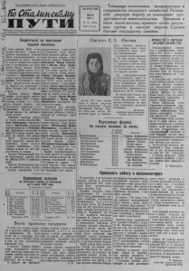 Пролетарии всех стран, соединяйтесь! СшМишОЛш ^ЖПКТ'И "^О р гаь Северного РК Коммунистической партии Советского Союза районного Совета депутатов трудящихся Новосибирской области ВОСКРЕСЕНЬЕ 8 ИЮЛЯ 1956 г. № 56 (1863) Пена 10. коп. Товарищи колхозники, механизаторы и специалисты сельского хозяйства! Развернём упорную борьбу за повышение продуктивности животноводства. Увеличим в июле надои молока, привесы скота нагульных гуртов и настриг шерсти. Сдадим больше государству свинины. Бороться за высокие надои молока & и п п т о у о л Б т г к а ю и о т м р о о в с р о р а ц т а й р й и о у а к н д л о н м я и о а г щ с о т и и К х ч С П с е о я С в с п С к е о о т д а г и ве о д с л и о е и сревнования по надою молока ш с з т а е в н о и и ю е в нь с н и ор ад е с в о ч н и я о т в а а ю м н т и о , л и ч о т к о з а а пер п с в о р е в е н ыд и колхозов района заняласель- хозартель«Новая жпзнь»(нред- седатель т. Лесковский, сек- , ретарь парторганизации т. Ни- о!_нолаев), получившая в июне в 2 у 4 . 0, П 6 рир л о и с т т р , о ; в по мол ср ок а а вн н е а ни к ю ор '' о с маемсоставил 148 литров на —к оро В в р у у . чить колхозу «Новая жизнь» переходящеекрасное п з о н л а к м о я ма р , а о й т к о о б м рав КПС его п р у а к йи ол с - лйоза «Память Ленина», как Упустившего первенство в со- - Уревнованип. Занести колхоз «Новая жизнь» на районную доскупочёта. Отметить хорошую работу по надою молока колхоза «Память Куйбышева» тель т. (председаДитятьева, секретарь партогранизации т. Степаненко), подучившего на корову в и ро ю с н т е 23 за 7,4 л м и е т с р я а ц мо 1 л 0 о 6 ка л . и П т р р и о в. Среди молочно-товарных ферм первенство заняла Мед- вежинекая ферма колхоза м ч « р е о и П в в В а п ш р м м е а у р о я я ч л и е т о з т х ь к ь а о а К д и М у юн я й е а н щ б д ь в ы е к е ш о е ж п к р о е и р о в н а в а с с у » н . к 2 , о о 5 й е 5 п з ф л о н л е и а р у т м м к я у о З м н р а а а н а . й е к р с о т а м й и о а н Мн К у е П ю дв С е д ж о и с и к н у р ск а п у й ю о ис чё ф по т е а р л . Лучших результатов в соцяалптснческом соревновании за повышение надоя молока с л р и е с д ь и п п а а с с т т у у х х и ов д р ой ай н о о н го а - с д т о а б д и а колхоза «Память Куйбышева» Илихмстов Фёдор Степана внч и Петров Иван Трофимович, получившие в июне по 254 литра молока на ко рову; колхоза «Новая жизнь» Комков Григорий Иванович п Комкова Мария, н ш ка и и ж е з д м у 2 а ю5 » 0, к 8 оров л у и ; тр « а За м ря ол к о о к м а п м о н у л а учивКелль Мартын Егорович и Федоров Федор Алексе евич, м л я о т к ь ап Л а е п н о и л к н у о ч а р и » о в в ш у; ие ко 2 л 5 х 1 о л з и а т « р П м а о Лушов Михаил Харламович и Лушов Иван Михайлович, получившие 246 литров на корову. г з з р а а а н н м Н н ес о а ы т т г и а х р м а т и д н о и а в р т а а р ь й и р о щн а в й е н с о й о е н г х н о п у о ю С ч в о е ы в т е шн д т ы е а о м у с к и ку и а по О чёт т а м . ечаетсхяорошая работа н д и оя зм ро а к » колхоза «Зарякомму Мельниковой Марии Максимовны, надоевшей за июнь на одну корову 293,3 литра молока, Демчихиной Ольги Романовны, надоившей 280 литров молока и доярки колхоза «Память Ленина» Нескоровой Александры Ермо лаввны. надоившей на одну корову 271,7 литра молока. н л но е а н д К в к о р е о л я а в й и м а н о , е р л п о а о к б л а н у от е ч к у у и о д в п л о ш х о в о и л п й з е о ы т в в ы :и о в р шм и . е и т н Мю е и л н а ю е ь 110 литров на корову, «7-й съезд Советов»—140 литров, «ПамятьКирова»—165 литров, им. Калинина—168 литров. Пастух Е. 3. Рогова Более 20 лет пасёт скот в своем- ко