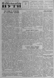Пролетарии всех стран, соединяйтесь! ПвСшЛшшОЛщ П У Т И Орган Северного РК Коммунистической партии Советского Союза и районного Совета депутатов трудящихся Новосибирской области I ВОСКРЕСЕНЬЕ 22 ИЮЛЯ 1956 г. | № 60 (1867) | Цена 10 коп. Труженики колхозов, механизаторы М Т С ! Все силы и средства на заготовку кормов. Выполним план сенокошения и закладки силоса. Обеспечим сытую зимовку общественному животноводству. ВСЕ СИЛЫ И СРЕДСТВА НА ЗАГОТОВКУ КОРМОВ Соревнование бригад В колхозе «Путь Сталина» развернулось социалистическое соревнование на заготов ке кормов.За последние дни— впереди четвёртая бригада (бригадир А И. Армапчев). На 120—130 процентов выполняет задание группа иол- хозников, которую возглавляет Василий Юдин. Члены этой группы А. Арманчева, Т. Со колова и другие на косьбе, копнении, и сгребании сена систематически выполняют норму на 130 процентов. На помощь колхозникам в сеноуборке пришли и престарелые колхозники, из них А. Сорокина ежедневно выходит на сенокос и честно трудится. Колхозники четвёртой бригаД. Белов, секретарь парторганизации колхоза „ПутьСтзлина*. Стогуют сено из валков В тракторной бригаде А. В. Костюкова, обслуживающей колхоз им. М. Горького, хорошо работает сенокосильный агрегат, где трактористами Юрий Савин и Фёдор Хотулев. При задании в 9(Ю гектаров, они скосили к половине июля болше 700 гектаров. В отдельные дни агрегат скашивает до 35—40 гектаров трав. Бригада не допускает разрыва между косовпцей и сгребанием. А после того как сено собрано в валки, тракторные грабли ещё раз проходят весь массив поперёк кошенного и чисто сгребают остатки. В колхозе „Память Куйбышева" плохо заготавливают корка Сейчас, когда XX съезд нашей партии поставил большие и ответственные задачи в области развития животноводства и поднятия его продуктивности, когда в колхозах развернуто социалистическое соревнование за высокие надои молока и увеличение производства мяса, заготовка кормов приобретает первостепенное значение. Половину всех кормов в балансе составляет сено, поэтому сенокосная пора — пора больших и важных работ. Не менее важна и закладка силоса. Сказать о том, что все руководители колхозов района учли важность этой кампании н организованно^ использованием всех сил и средств ведут сенокос и закладку силоса, никак нельзя. Если три колхоза: им. Кагановича, «Путь Сталина» и им. М. Горького н занимают первые места в соревновании, то это совсем не значит, что дело там поставлено образцово. Нет. Проценты говорят за себя. В каж дом из них заготовлена десятая часть сена к потребному количеству, закладку же силоса почти прекратили. А ряд руководителей колхозов вообще не спешат и не дают отчёта в своей безответственности. Уроки прошедшей зимовки ничему не научили правления колхозов: им. Маленкова, «7-й съезд Советов», «Память Куйбышева», им. Калинина и других. Председатели этих артелей, зав. производственными участками не принимают нужных мер к ускорению заготовок кормов. На 15 июля здесь застоговано по 0,4 — 2—6 процентов к плану. Плохо закладывается силос. Всё дело в том, что нет настоящей мобилизации людей. В колхозе «7-й съезд Советов» работают на сенокосе 50—60 человек из 250. А как работают? В 10—11 часов выходят, в 5 часов вечера бросают работу, да за это время ухитряются ещё на отдых использовать несколько часов. Разве можно так работ