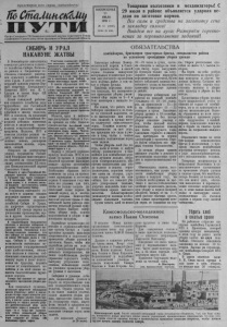 Пролетарии всех стран, соединяйтесь! Ш СпшЛшснйЛщ П У Т И Орган Северного РК Коммунистической партии Советского Союза и районного Совета депутатов трудящихся Новосибирской области ВОСКРЕСЕНЬЕ 29 ИЮЛЯ 1956 г. № 62 (1869) Цена 10 коп. Товарищи колхозники и механизаторы! С 29 июля в районе объявляется ударная неделя по заготовке кормов. Все силы и средства на заготовку сена и закладку силоса! Выйдем все на луга! Развернём соревнование за перевыполнение заданий! СИБИРЬ И УРАЛ НАКАНУНЕ ЖАТВЫ 1 ) В Новосибирске законичлось * с г к о о о ве х р щ о а а н з н я ь и й ш е с е т р в а в а бо С т и н С б в и и к е р р о и д в . л с о Н е в е л с с ь к к е с о к л о с ь о - 1 стоялось совещание работнп- * > ‘ в в к о ы е о н щ в й ов ан с У с и е й е р л к а ь р л п с е к р а т и о . г а н о В я р л ь и х р о а Ц у б з ч е я о н т й ас е т с р т т и э а в л е т а и ь П н х р е о с р а г о - й - о ^ Комитета КПСС тов. Н. С. > Хрущев и члены Бюро ЦК КПССпо РСФСР. Созыв совещаний работни- 1 ков сельского хозяйства двух ¡г—крупнейших зон Российской 5 Федерации является важным п событием в жизни колхозов, * МТС и совхозов. За последние два—три года Российская Фе- ~ дерация добиалсь известных X успехов в увеличении произ2 водствасельскохозяйственных продуктов. Колхозы, МТС и ' совхозы успешнорешили за- I I дачу освоения целинных и за- '-^лежных земель, расширили производство молока, зерна, мяса, овощей. Опираясь на достигнутые н у с о с ко пе б й х о Фр п ю , ед т е с т р я а р ц з у и а д и я с о щи а с е м у о ся щ от е в с Р т е о в р сс л ж и е е й н н и е з д С о а о м д в а ет ч К , с о к м п о м о г у с о н та и С в с о т ю ле и з ч н а н е . с ы ко х й XX пар съ ти е и зОбласти и края Российский Федерации приняли обязательство в текущем году сдать государству 2 миллиарда 200 миллионов пудов зерна, т. е. столько, сколько недавно заготовлялось хлеба по всему Советскому Союзу. да Р м е о з г у у л т ьт и аты до н л ыж н н е ы шне о г к о аза г т о ь н ре е шй а шю ее щее ра в з л в и и я т н и и е е н с а ель д ск ал ог ь о хозяйства Сибири и Урала, на досрочное осуществление заданий XX съезда партии по в н у е в а н ел и н и ы ч д х е р п ни у р г ю о и ду х п кт р с о ои е в л . зв ь о с д к с о т х в о а зя з й е с р т В подавляющем большинстве колхозов и совхозов сибирских и уралских областей выращен высокий урожай. Колхозники и работники совхозов заявляют, что они соберут на целинных землях не менее 100 пудов зе^на с гектара. Сибирь и Урал имеют возможности значительно пе- к ревыполнить государствненый п с ч т л и в т а е н ь нн к х ы л о м е л и б х о с зо з е ы а м го е и н т а о с м в о о и к в , , хо у з в ы е о л б и е с с ч о п и б е т ь в н ыик д ам ачу н з а ерн т а ру и дод д н е и н , ег п к о о д л н хо ят зь в н з д ыи я о й к х с о и о с д в т тв ы ь а де б о р и т л е а в н о н г а б и о . щ с э е о т с с о т й т в о ен о я с н н н о о и г т о в ер е уж х п е о о Теперь всё зависит от организованного проведения уборки урожая. Как покаыз вает практика, реальным средством сокращения сроков уборочных работ и ликвидации потерь зерна является раздельная уборка хлебов. Если принять в расчет даже минимальную прибавку от нового способа убор ки—дополнительный сбор двух центнеров зерна с каждого гектара,—то и тогда при выполнении плана раздельной уборки колхозы и совхозы Урала и Си- ~ бири сохранят от потерь 100 миллионов пудов зерна. Участники совещания работников сельского хозяйства Сибири призвали всех хлеборобов Сибири развернуть соревнование з