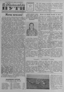 Пролетарии всех стран, соединяйтесь! Орган Северного РК Коммунистической партии Советского Союза и районного Совета депутатов трудящихся Новосибирской области По 321 литру молока от каждой коровы за июль надоили доярка Варвара Степановна Васильева из колхоза „Новая жизнь“ и Мария Петровна Илихметова из колхоза „Память Куйбышева“ . Следуйте примеру передовых! ВОС А К В Р Г Е У С 5 С Е Т Н А ЬЕ 1956 г. ! № 64 (1871) ) Цена 10 коп. Жатва началась! На полях колхозов нынче зреют прекрасные хлеба. Но определению колхозников на м ж ду н е . ог л О и у т х ч р ш а м д е а н , с о с ч и е т в м а а к х б о ы е у л р я о в в ж л 1 а е 9 й н 5 и 4 е. д го а т т ы а—И бо п н л р а е о е ш ве а ст о о и р б г щ а у н б а и о я р зо о т ч в е н а п н ы е н р е о ь , р з а а б з б о а о с к т к ч е и о р и н е ь т ч а и с т т з р ь ь е о с р к я н ж и а , а с , т н в с е г у в о о с е в у д в д о р с а п е а р у м м с с е т ы т н в и е н о т о м ь ко р р а о п п с т о о хлебопоставкам и как можно н бо а л . ьш Тр е уж сд ен ат и ь ки хл Н еб о а во с с в и е б р и х рс п к л о а й н об и л ко ас в ти н с а ель с с о к в о ещ го ании хозя р й аб ст о в та Сибири взяли обязательство сдать сверх плана не менее 12 миллионов пудов зерна. С уборкой хлебов нельзя медлить ни одного дня и часа. Особое внимание надо обратить н б с о о а м ба у . б В о д р ы о к к г у о а д з р н а а н о з с а д т е ь л п ь р н т а ы а к м к т о и г к о о с й по с с п о в о о многих колхозах страны. У н р а я с етс ж я е п в ерв р ы а й йоне год. она Поэ в т н ом ед у а д д г у и р е р о т а н м о с м тр а п а м е к р , т в о м ы р е х н х ы а д х н н и е б к й р а и м к г , а а д к бр м с и л о г е ж а но больше время находиться р з б ы я а д й в о н а м т ер ь ам с п и ом тр о н а щ а к ь т п о в р о и л о с о т р с а а г м а х н и и и и за к ц о о и к м и а работы, в правильном и более п у т о э а л р м н о и о в , м , п п о и д р с б и п о с о р п л щ о ь с и з о о к б в о л а в е н н и и и и й т. в с д и . н л К д а о ф р м о е в б е а т й у н е е м ра в м ни и ма т т р е а л к ь т н о о ри п с р т о ам чита с т о ь статью директора Петровской МТС Ставропольского края Я. Бичевого, помещённую в районной газете за 3 августа. н В из н а е ц й и р и асс р к а а з з д ы е в л а ь е н т о с й я о у б б о о р рк га и , об использовании машин и высокой выработке в дневные и ночные смены на жатве. зов В п р р а и й ст о у н п е ил у и н к ас уб р о я р д ке ко о л з х и о - ‘ м со ы б х ом п . ячменя раздельным спо Тракторист Василий Волков с комбайнером т. До- голевым 2 августа скосили первые гектары ржи виндроуэром в колхозе им. Молотова.Приступили к раздельной уборке в артелях (Путь Сталина» «7-й съезд Советов», и в ряде других. к м а я Н . е о В щ в ё к н о м е л к е х о д о т л з о я е р т ы , х у и п м к у . о с л к К х а а о ю г з а т а н х в о п р в е о и т ч н е а ы ль м мо х ж о н д в о о м м е в , с е т н с е т о п п с о у к б а о б р п р к р и у е га д д с и е п р д о о а л м тракторной бригады в плену зелёных настроений. в м о е й д У л б с е о п н р е н к л о у ос н т а ь н ю а у д ч х о л ас е н т б а к о ч в а и . х н У а с т с в ь т о а с н к о н о е вить повседневный контроль за созреванием хлебов. жна С пе б р ы в т ы ь х д о н р е г й ани у з б о о в р а к н и но д с о т л ь при отвозке зерна, при его взвешивании на току, сушке н ч и к а о о н с с т и д с и е е а м й ч ч е к а э с г т о о п с м у о у д сп а е е р с ш т ст ь и в . т у ь Н . ад В с о оз т о м о к о л о ж ь н ремонта сушилок, иметь достаточно тары. ям Маш сл и е н д н у о ет -тр п а о к д то у р м н а ы ть м н с а т д ан т ц е и м , ч н са т о . о е б В у ы м ча е с п с т т р и е и 