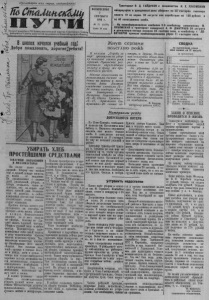 Пролетарии всех стран, соединяйтесь! ^_СтаЛшия7бЛш П У Т И Орган Северного РК Коммунистической партии Советского Союза Х / - ^ районного Совета депутатов трудящихся Новосибирской области ВОСКРЕСЕНЬЕ 2 СЕНТЯБРЯ 1956 г. № 72 (1879) Цена 10 коп. j : ........ ........... ..... j Тракгорист В. Д. ГАЙДУКОВ с машинистом И. X. ЛУКОМСКИМ виндроуэром в дождливый день убирают по 30 гектаров пшеницы вместо 10 по норме. 30 августа они заработали по 120 рублей и по 40 килограммов хлеба. п Л 8г , и Й орудов8нном комбайне 0-6 комбайнер комсомолец М. ЛУКОМСКИИ и тракторист коммунист А. Ф. ДМИТРИЕВ 30 августа вот°^>пЛпоВую погоду скосили 23 гектара овса, а комбайнер т ДЕ- ВЯТИЯР0В прямым комбайнированием убрал 11 гектаров овса. ^ В школах начался учебный год! Добро пожаловать, дорогие|ребята! Жнут серпами полеглую роЖЬ В колхозе „Борьба за мир“ организовали уборку полеглой озимой ржи серпами. Правление разработало определённую оплату и сразу же производился расчёт. Многие колхозники перевыполняли дневное задание на жатве и вязке снопов. Анна Лахтюк ежедневно сжинала 15— 24 сотых гектара, Евдокия Бондаренко — 20, Матрена Харламович — 18—20, Ольга Трепова— 15—17, Христинья Са- мушкина—20 сотых гектара, и другие. 70-летний колхозник Илья Акимович Филиппчук убирал в день по 0,10 гектара. За убранные 0,10 гектара ржи выдаётся 5 килограммов муки и начисляется 3 трудодня. В колхозе было 40 гектаров полеглого хлеба. Все они убраны с корня за несколько дней. На поля выходило по 40 человек. Сейчас просушенные снопы обмолачиваются комбайном. В. Багров, инструктор райкома К П С С . СВОДКА по выполнению плана сева озимых на 31 августа (в процентах) %о * (V) колхозы Материалы рейда ДОПУСКАЮТСЯ ПОТЕРИ У Б И Р А Т Ь Х Л Е Б П Р О С Т Е ЙШ И М И С Р Е Д С ТВ А М И ТОВАРИЩИ КОЛХОЗНИКИ И МЕХАНИЗАТОРЫ! На полях давно созрел урожай. Уборку мы начали ещё в первой декаде августа, но ведём её медленно. Не организовали с первых дней раздельной уборки, а теперь создалось такое по ложение, что на корню ещё с м т н в о о го е о ё зим п о о й лег р л ж о и , . Б а оль с ш ей и ч н а с дождливая погода ещё больше ш с с т п и в о т П у с е р е о л т о б ь г с н н т о о о в с г з ы у о е п т п ан о н г и о а э ю д т . ы ом се н у н , и т ч я е б с г р п о ь о у со т н б е е обещает—весь месяц облачно и дожди . Нежелательное явление, но от него никуда н д ¿ у б е е и т у р й а ж т д ь ё д ш а у т ь р ь . ож х а о П й р о о э н ш т а о е д м й о у в н п е о л г ю о б с д у л ы ю е . к п к о о м г д о е е д н л у д у . ов п а р П л а о к л с т е о и б ж ч я е и с т т к е а и л к м ь о н й о п о о п д з ы а х т о р о д м е многих колхозов страны. Так, ц за у ко О н к ч т и я л б а рь п с о к л а н я ост М ью ТС ко н с а о ш ви ей области. Они скосилн весь х ли леб в — д я о р ж о д в ь ы , е д и нё о м зи и мы н е о . ч К ью ос . и А теперь как только выбирается с х о о в рош м а е я хан п и ог з о а д то а ры неск с о т л а ь р к а о ют ч с а я обмолачивать комбайнами с с подборщиками. Там, где н ж е у о т б Б х х о л н д е а и б ш мо и в , х сн к у о с о п л л ы о х . в о и зн я и х ки н в а я д о сейчас незамедлительно с у п т б р в и и а р с м а п и т о ь . са ‘М б у е л р х и о а в ж н а а и т й з ь ато в р с ы е к м о и д м о б л а ж с й р н н е ы ы д , пускать жатки и виндроуэры. сте Н йш ел и ь м з и я п ср р е е д н с е т б в р а е м га и т . ь и У п н р а о с с х в и о л р з о а а й к х о . . н Е е с В т 1 ь 46 о б н к о и о л н ь н в ш о ы и х н в ст с в е с е е х но к к о о л по 6—8, а в «Путь Сталина»— 18, в «Память Куйбышева»— с 1 и 3 л , ок бол в 