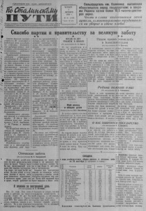 Прулет&рии всех (трек, соединяйтесь} ШСтЛинасШ П У Т И Орган Северного РК Коммунистической партии Советского Союза и районного Совета депутатов трудящихся Новосибирской области ЧЕТВЕРГ 4 ОКТЯБРЯ 1956 г. № 81 (1888- I Пена 10 коп. j 1 Сельхозартель им. Калинина выполнила обязательство перед государством: в закрома Родины сдано более 10.5 тысячи центнеров зерна. Честь и слава колхозникам этой артели, самоотверженно трудившимся на уборке и сдаче хлеба! Спасибо Свыше двухсот человек собралось 30 сентября в районный Дом культуры на собрание, посвященное вручению новых пенсионных удостоверений и чествованию работающих пенсионеров. Заведующий районным отделом социального обеспечения В. Е. Шаламов рассказал собравшимся, что вступление в силу нового Закона о государственных пенсиях— ^ большое событие в жиз- советских людей.Толь- ко в нашей стране стало возможным обеспечивать У будущее трудящегося че- ловека. На примерах многих пенсионеров В . Е. Шаламов показал на сколько возросли разме- \ ры получаемых ими пенсий. Так, инвалиды Orne- явственной войны Н . И . Соколик и М . Г1. Михайлов получали по старому закону по 36 рублей, а по новому Закону пенсия Н. И . Соколик соста- вляет 295 рублей и М .П . Михайлова — 321 рубль. На 176 рублей увеличилась пенсия инвалида Д .Д . Колмакова. Значительное увеличение пенсий и у инвалидов труда. В два и два с лишним раза она увеличилась у И . Н. Зырянова, Г. М . Гавана и многих других. По 56 рублей пенсии получали за умершего кормильца семьи М . Кузнецовой и П. Криковой. С 1 октября каждая из них будет получать по 253 и 230 рублей. Позаботилось государство и о престарелых, кто десятки лет трупартии и правительству * # * дился на производстве, а теперь, уйдя на пенсию, может спокойно отдыхать. Их старость обеспечена. Почти 99 процентов пенсионеров трудятся на производстве. Многим из них давно пора пойти на отдых, но они. считают нужным работать пока есть здоровье. Активное участие принимают они в общественной жизни района, являясь депутатами сельского и районного Советов депутатов трудящихся. Это их ответ на заботу государства. За долголетнюю и безупречную работу исполком районного Совета наградил Почётными грамотами группу пенсионеров. Среди них И . Н. Кравчук, К. С. Блохин, А. И . Кухта, проработавшие по 35—40 лет. Получили грамоты, инвалиды войны и труда Г. М . Коваленко, М . П. Михайлов, Е. А. Скоробогатов, И. И. ЗШр4Иде, М . И . Колегин, А . П. Виттих, С. В. Ковалевский и другие. Дружными аплодисментами сопровождали собравшиеся пенсионеры вручение грамот ветеранам труда. До глубины души доходили ответные слова получающих награды. На этом же собрании пенсионеры организовали кассу взаимопомощи. Из брали правление и ревизионную комиссию. Председателем кассы взаимопомощи избран Н.И.Кравчук. ПОСЛЕ 35 ЛЕТ РАБОТЫ В ШКОЛЕ (Из выступления А. И. Кухта) 35 лет проработала я в школе. В настоящее время ухожу на пенсию. До новому З л н а о я к с . т о ь ну Э ж т и о б т у ь д д у а в п с п о т о л л у н ч м е а н т о ь е б 5 е 6 с в п 3 о е з ч р м е у о н б ж н ж о н . ы М с ы т , оя п т е ь нс в ион с е т р о ы ро , не не от д т о е л х з ш ад е ач г , ос к у о д т а о р ры ст е во р . азр С еш во а и е м т наПОСИЛЬНЫМ с р т а в й е он и а в буд о е б м т щ р е у с д т о о в т м е в н е н н ч о а а й ть п ж р н о и а и з з н в т и о у дзаботу, которую проявляет партия и правительство о нас. Считаю, что главная наша обязанность—помочь Роди