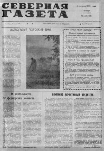 С Е В Е Р Н А Я Д З Е Т А 3 свгуста 1995 года четверг № 62(7381) Основана 20 июля 1035 г Ф Ф В ЫХ О Д И Т Д В А Р А З А В Н Е Д Е Л Ю. ф Цена 160 рублей. ИСПОЛЬЗУЯ ПОГОЖИЕ д н и Пошел крестьянян ни сено- кзс. И' дождь тут как тут, нс терпятся eMiy испортить людям «астроеише, полить скошенную праву, задержать заготовку кормов. Но и земледелец не лыком шит. Он доли;он уметь работать юл поде, то есть в погожие «одна» собрать сена как можно больше. И гыдо отмстить, что ныяче томны этот важнейшей страды в.ы- ше, чем были в пропгл.'м году. За две декоры иола меха- кнзл.|рьг iFUiftcaa заготнвлд» более '20 цроцемав сена к плановому келючестлу. Для срик-шеная: в 199 1 гду на дан ный период было зачтасено 1 2 . 1 процента грубого корма. Выше других темпы работ в л .так обеспечивают меха- низ 1Т0ЮЫ акционерного общества «Наша Родила». Они вьшал--мти уже пелончну сезонного задания. Правда, план у ни.х меньше, чем у соседей и колхозе «Память Ленина». В последнем хаяйстве нынче должны заготовить к зимовке 1300 тс,ни седа. И дело идет неплохое живецпоподы могут р.!¿налагать уже 451 центнера ЬЛ сена. Значит, работа сде- лвшг»1 н'а 34.6 процента. Почти одинаковымю темпами ведут заготовку сена механизаторы акцидифноа’о общества имени Калинина, имени М. Горького и « V I I съезд Советов». В этих хозяйствах план нынешнего года выполнен таз- 28— 30 процентов. V a a o i o i О ■ О ■ о ш О ы О о и О м О и О ■ О ЧТО? ГДЕ? К О Г Д А ? iBOBOarg Вышли новые документы q Булочки с маком не б у д е т В администрации района вышли следующие ностановле- п пня. и № 103 от 7.06.95— «Об открытии центра социального п обе лужи ванн I». ^ № 121 от 28.06.95 о районной программе «Социальная защита инвалидов». № 125 — ,.0 дополнительных мерах по обеспечению полного охвата молодежи допризывного возраста по подготовке к взвитой службе». № 129 от 12.07.95 — «Социальная поддержка». № 130 от 14.07.95— «Открытие районного детского дома на базе кэб. кордон:,некой участковой больницы». п и ■ о ■ о Я о о в о в о в о » о я о » о Л и ■ о в о № в Две палаты для инвалидов Великой Отечественной О ванны открыты в Северной Ц Р Б — в терапевтическом и • хирургическом отделениях. Все здесь располагает к ле 0 чению н отдыху: обстановка приближена к домашней. • Телевизор, холодильник, дорожка на полу, плед на крова 0 ти, красивые шторы на окнах, тумбочка и на ней свети- # льник. О В ближайшее время в палатах будут установлены ра- ■ дно и, возможно, телефоны, если возникнет такай необ- I) ходимость. ■ ^ ■ С Э 1 С Э Ю 1 С Э * С Э 1 С Э 1 С Э Ю 1 С Э Ш С Э 1 С Э Н С Э Ю Ш С Э * С = Щ С Э ! Продолжается операция по борьбе с наркоманией. Старшим оперуполномоченным уголовного розыска М. В. Тома- 0 шенко совместно с участковыми иыспектрами обследуются ■ приусадебные участки но незаконному выращиванию мака. 0 Составлено более 50 административных протоколов. О ■ о ■ о ■ о ■ о ■ о ■ о ■ о ■ о о ■ о ■ о ■ 0. Есть о чем тревожиться Большие сложности с ремонтом учреждений обстоят в отделе культуры. В бназинском Доме культуры необходимо сделать отопление. В Новотронцке крайне обязательно подлатать крышу в библиотеке. Нужен ремонт и в Федоровском Доме культуры. Пока дела неплохо обстоят лишь в Остяцке. Со всеми этими заботами поделился заведующий отделом культуры К). Г. Гламаздин на планерке у заместителя главы районной администрации но соцвоиросам Г. Д. Багровой. Для участников войны О деятельности ^ фермерских хозяйств II к 1 январи 1995 года на терр