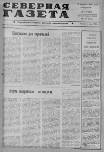 С Е В Е Р Н А Я У ч р е д и т е л ь —С е в е р н а я р а й о н н а я а д м и н и с т р а ц и я 12 февраля 1996 года понедельник № 1 3 ( 7 4 3 6 ) Выходит 2 раза в неделю Цена 175 рублей. Издается с июля 1935 г . Официально Программа для строителей С о с т о я л а с ь очередная л егия , на которой были смотрены вопросы: 1, П р о г к р р о а а л с м -. ма капитального л ст е в н а ии на ква 1 р 9 т 9 и 6 р го и д; по 2 с с . т т а Ор н о о и в т в к е ы е л д н ь е а с м о в т е ч и и н е н н р и е о Ч с д у т ь в р ; а а ф шц 6 и и . и н и н О а . с н к с Л р о о е й в в х о и о й с з д е и е л и д ь е о с я х б к т о с о е з у й л я ж ь й д н а с о д т о - 'н и я первого вопроса были в н н ом есе в н а ы ри и ан змте ен о е н ни з я в , уч и а л в кон та е к ч : «-Программа намерений тального строительства ил к ! а 9 п 9 и 6 го д» . С докладом выступил з м т а р и м а н н е и с с с т п т и о р т р а е т ц л у и ь и и г п л с о а в в я с ы з т и р р о а Ви й т . о е н Пл н ь . о с й т Жв а у о д , рой Он « х а р а к т е р и з о в а л итоги строительства з а 1995 год. Г, б те о л к е с й е п , р р о ч а ш е й м о л н о н а м а б г 3ыо 0 д л у и о с б р и ъ а л с е ып к ыт с а л т х е р , н о ыи и з которых на иболее важными и д л к о ыр р у , о п г н р а ыай м о и Ч н у н я в ы в а й л ш я и юД о тс м я - Д к д у л в л с е ь ш т и у ш н р к ык а о , . п д о ст л в ик н л а ин эт и и ка ц . е Б л юи д б ж ы е л т о ны х .вы с д р е е - - Я е и а один м и л л и а р д ' 8 4 9 мил- дк и д 'и о т о в е . н ля о Т мв а и к р и б у м о б л л о е е б е н р , а д з в о о у с м в х , ое з н м а о д и о л л с л ж т и р е а о н р н б та л о в е ст и й ь л , а в пе м т р и о е л м д л и п ч а о и р д с д л ря е с д М ч л и иП к шМ амн К ии м с р о у с 2 8 6 . 4 миллиона , кооперативу « М о л н и я » — 1 6 2 ,8 миллиона и т. д. Р а сп ы л е н н о ст ь сред ств по многочисленным объектам и н н а е н до си ст р а о т в о а ч н н и о е е п б р ю и д в ж ел е и тно к е т о ф м и у . ЧТО строители района нщ а у н т с и ов иый о щ го ущло а д ю , т в ост р р е ы зу й л ь о т щф а т и у е * которого многие объекты пались н езавершенными . Т о а к к а . б л ыьк л о о д с в д е а н н а о дц в ат з ь к еп к л ва у р ат т а и ц р и , ю хо т т о я по расчетам эта ц ифра могла быть больше. Из-за отсу тст вия с р е д ст в не начато строите шет- в к о от У о г ч а р и ры т а х ы ж в д а а р я у в ги у О р х с о т з к а д и н а 1 ни м ин й и к . н е ув и ше н го ел н г и о ч д ч е а е , с н т е с в к о о б а з х с а о т л д р и о Вм я о , щ и П с х о с к Ж я ра о о т р б и о ъ т в е ь , кт н о к ы в о , чтобы бы л а во зможност ь вести и х до за вершении , т д е о м н б ли о ов л ть ее р , в у с б ч е л т г е о о й н . 6 а 0 В м 0 - с о п б и е 8 щ с 0 к 0 а е ют мна и и л в в л ы а и ж д о е - нейпшх новостроек В , П . Ж о - роа у к а з а л би азинск ую школу- и н в ны ер т й ш е р е д н н о а и м т е , , с о т т с а р т м о я и ц ж т к е е у л ю д ь в с шт у в х к а к о в л а у р , д т о и з м р а а в В е р х -К р а с н о я р к е и несколь- л г ч к о и т о . л я б д н ы р н е у о г б в п и х л р х о о о д ж д о и о и б м л т ъ о ь ж е а к п с л т р р о о и е с в д л ь . с о т ж К д в е и р а л т о о ь м в е у т т с о н о и , а р л а и й к о л н и н н о и м ке Д , о н м ес е ко к л у ь л к ь и т х у рыж , и л п ы о х д т о ах м П а р в х и ч , м ер с е л а ч шо а в т н о е е л м г ь о , н н д а а н -i я. все о х со о б б е ъ нн е к о- (л ь 1996 года ото щение количества ст роящ с о и к х р с а я точек почти в два раза по сравнению с прошлым голом причем, приоритет должен быть 0 1 д а н ' д о м у для престарелых и школе в О с т я ц к о , где склады- нш гея критическ ая ка и может случить ся обстан т о ак в . что начать сл е дующ и й н р ыий й но г г о о д бС уО дС еТ тО Я нН еИ гд Яе ния, где с е й ч а с у