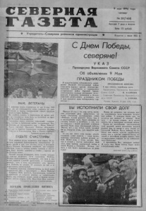 С Е В Е Р Н А Я Г А З Е Т А 9 м а я 1996 год а ч е т в е р г № 3 8 ( 7 4 6 1 ) Выходит 2 раза в неделю Цена 175 рублей. т Учредитель—С е в е р н а я районная администрация Издается с июля 1935 г. ВАМ, ВЕТЕРАНЫ С каждым годом отдаляется от нас 9 мая 1945 года ,но не уменьшается наша гордость за свое Отечество и народ:, одержавший самую трудную в своей истории Победу. Не слабеет память о -пережитом во время войны, не становится тише боль за погибших на фронтах Великой Отечественной. Склоняясь перед памятью поколений, сложивших головы в священной войне, поздравляем Вас , | доживших до сегодняшнего дня, с Днем Победы! Пусть _ светлый Праздник Победы объединяет всех нас в горячем стремлении возродить Россию. Счастья и благополучия Вам и Вашим близким. Администрация района. ' БУДЬТЕ СЧАСТЛИВЫ 51-ю мирную весну встречает наш народ. И чу- ' яством огромной благодарности наполняются сердца людей к тем, кто отстоял честь и независимость Родины. Вспоминая погибших, мы говорим: | «Вечная слава и вечная память павшим в жестоком бою! Били с ь отважно и стойко с врагом вы за Отчизну свою». Низкий поклон ветеранам, кому судьба подарила счастье встречать 51-ю годовщину Победы. Особая благодарность женщинам, что шли в шинелях дорогой длинной фронтовой, и солдатским вдовам, день и ночь трудившимся для фронта, для Победы, нс доедая, не досыпая, но так и не дождь вит ись своих мужей. Северная сельская администрация от всей души поздравляет Вас с праздником — Днем Победы! Здоровья В ам , радости, благополучия, чуткости и внимания со стороны родных и односельчан. Пусть над головами ваших детей и внуков всегда будет чистое мирное небо. Всех благ Вам земных! Северная сельская администрация. ПОРЯДОК ПРОВЕДЕНИЯ МИТИНГА 1. Т р а н с л я ц и я песен военных лет с 10 часов . 2. Почетный к араул школьников с 9 ч ас ов . 3 . О ткрытие митинга в ! 1 час 4 ов, Вы ст у пле н и е главы районной администрации. 5. В ы с т у п л е н и е. ветеранов. ни 6к 7 о . . в В Мт ыыи с л н т а у у . т п а лен м и о е лча в н д и о я в . , т р у ж е й . Гр аж д а н с к ая панихида . 9 . Во зл ож ени е венков. Ц ) . З акры ти е митинга. . 1 1 . Пригл ашение на концерт- посвящение . 12. Народное гулянье с 22 часов. С Д н е м Победы, северяне! У К А З Президиума Верховного С ове та С С С Р Об объявлении 9 Мая П Р А З Д Н И КО М ПОБЕДЫ В ознаменование победоносного завершения Великой Отечественной войны советского народа против немецко-фашистских захватчиков и одержанных исторических побед Красной Армии, увенчавшихся полным разгромом гитлеровской Германии, заявившей о безоговорочной капитуляции, установить, что 9 мая является днем всенародною торжества — П Р А З Д Н И К О М П О Б Е Д Ы . 9 мая считать нерабочим днем. П редседатель Пре зи ди ума Верховного Совета С С С Р М. К А Л И Н И Н . ве С та екр С е С т С ар Р ь Президиума Верховного С о А. Г О Р К И Н . М о ск в а , Кремль . 8 мая 1945 года . ВЫ И С П О Л Н И Л И СВОЙ Д О Л Г Минуло 51 год с тех пор, когда весенним солнечным днем прокатилось по всему Отечеству долгожданное слово «П о б ед а» , Слезы радости тогда, как и в последующие годы, были смешаны со слезами печали о погибших, о тех, кто не вернулся с полей сражений: слишком высокой была цена завоеванной победы. Посему нет у нас семьи такой, которой бы не коснулся огонь той страшной войны. 51 год мы свято чтим подвиг людей, отдавших самое дорогое — свою жизнь, защищая священные рубежи родной зе мли. Наши деды 