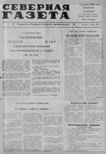 С Е В Е Р Н А Я ИЛ Ж Ж Л ' Л Op JC# Л / т ® У ч р е д и т е л ь — С е в е р н а я р а й о н н а я а д м и н и с т р а ц и я • 12 августа 1996 года понедельник № 6 5 ( 7 4 8 8 ) Выходиг 2 раза в неделю Цена 175 рублей. И зд а е т ся с июля 1935 г . Слово главе сельской администрации И М БЫЛО МНОГО НЕДОДАНО В администрации района Р А С П О Р Я Ж Е Н И Е О т 2 2 . 0 7 . 9 6 № 2 5 9 - Р О ПОДВЕДЕНИИ ИТОГОВ СОРЕВНОВАНИЯ СРЕДИ ТОВАРОПРОИЗВОДИТЕЛЕЙ НА ВЕСЕННЕМ СЕВЕ 1996 ГОДА Сельхозтоваропроизводители района в опти мяльные сроки завершили несение - полевые работы. Площади посева яровых зерновых превышают прошлогодние на 0 процентов, у в е личен посев силосных культур. Выполнили план посева зерновых коллективное хозяй ство «Память Ленина», коллективное предприятие «Восход», акционерные общества «Наша Родина», «Луч», « З а в е т ы Ильича» , и м е н и М. Горького, «Россия» и имени Калинина. Но основании условий соревнования, объявленных постановление^ администрации р а й она от 0 5 , 0 5 . 9 6 года № 6 8 «О подготовке и проведении весенне-полевых работ в районе» и итогов весеннего сева . 1. Победителем в соревновании признать коллективное хо зяйство «Память Ленина», которое в лучшие агротехнические сроки провело посев яр овых зерновых с хорошим к а чеством. Засоренность нолей минимальная. Присудить победителю 1-ое место с вручением денежной премии 2 , 0 млн. рублей. И з у к а занной суммы премировать председателя хозяйства Шрейдера В. М. —5 0 0 тыс. рублей. 2. Второе и трет ье классные места не присуждать, т а к к а к хозяйства, выполнившие план ярового сева , не соблюдали все агротехнические приемы, полностью не использовали закрепленную пашню, есть фак т б р ак а (огрехи) и посевах, отдельные участки имеют сильную засоренность. 3 . Среди крестьянских хозяйств победителям и иризн ать: « С о р т »—первое место «Л ю б а в а »—вт орое место «С т и м у л »— трет ье место с вручением д е нежных премий руководителям (Шаламов Н. Е ., Андреев С. М., Курцев Г. Г.) соответственно по 4 0 0 , 3 0 0 , 2 0 0 тыс. рублей. 4. Выделить на премирование со сиецсчета главы администрации района 2 ,9 млн. рублен. 5. .Вручение денежных премий произв ести на районном совещании передовиков с е л ь скохозяйственного хозяйства по итогам 1996 года. 6. Контроль за исполнением данного р а с поряжения возложить на главного б ухгалтера администрации района Павлову 3 . Я . и на пальника управлени я сельского хозяй ства Козубца Л, И. Г л а в а администрации Г. Г, ЗЫ Р Я Н О В . Иа коллегии районной администрации О кормах, нефти и прочем На заседании коллегии рай- адмииистрации, которое состоялось в последних числах июля, были рассмотрены с л е дующие вопросы: О ходе заготовки кормов. У — и санитарно - гигиенических условиях обучения н воспитания детей в биазин сКой школе-интернате. — О правилах вывоза м я са и коже венного сырья за пределы района. О согласов ании м атериалов по проведению конкурса на право эксплуатации ВоСт> чн т - Таркского месторождения нефти. Из -доклада главного агро-' н- ).яа сель хозу правления Г. Н. Ак ат ь е в а ясно, что обстановк а с заготовкой кормов у коллективных сельхозтоваропроизводителей довольно сложная. Н а зймовку необходимо за готовить сенач 8.5 тысячи тонн, еёнажа —- 7 ,5 . сил о с а —22 , зернофур аж а — о ты сяч тони, что обеспечит 16.5 цетнера Кормовых единиц. Но на конец месяца по району было заготовлено 1 2 0 0 тонн сена, или 11 процентов к плану. В прошлом году н