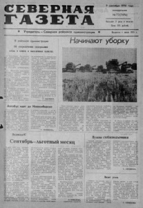 С Е В Е Р Н А Я 1 ч М О т \ /Ш \ а Л А Ор ж/ Л А 9 сентября 1996 года понедельник № 7 3(7 496) Выходит 2 раза в неделю Цена 2 2 5 рублей. ® Учредитель — Северная районная администрация ® И з д а е т ся с июля 1935 г. В районной администрации Об упорядочении содержания собак и кошек в населенных пунктах в * исполнение ния администрации П о о б с л т а а с н т о и вл о е т д 1 о 2 ч 0 ен 7 и . 9 и 6 с г о . д №ерж 4 а (1 н -1 ия « 0 с 5 о б у а п к о р я и с к ск е з ло ш 1 йе . с н п о С н б е ы в л л х а ь г с с о пт к р иу и о н» м д . к а т х а а х д и м и Н д н р о и в у о г ст и си р х а б н ц и и а р ям1 . 1 . О бесп ечить выполнение оси ж п ы х положений правил содерж ания с о б а к и к >шен в насе денных п у н к т а х . 1 .2 . С о вм е ст н о с районным центром го ссанэпиднадзора до 01 1 0 .9 6 г. определи ть д л л е ь е л н н и н о т мы ь е п з п о е р у м н я е д к л к т ь ы е н , ы т е г р д е е у б ч у а в е с т т о с к я б и я н з а а д в т с л ы е е я выгула со б ак . 2 . Ре д а к ц и и «Се в е рн ой л з н & е ии т и к 0 ыа . ц » с П и о р и б П о а о и к д п з г о в и о о т д о в к с в о о т и п ш в т р е ь е о н к с н . с у е о р м с и у о ю д е п р п р ж у г е б а а д приятию « Ж и л к о м х о з » : тав 3 и . т 1 ь . Д в о ад 0 м 1 и . 1 н 1 и . с 9 т 6 рац г. ию п р р е а д й о о с на мероприятия по организации о ч т и л х 0 о . 2 в с . о а б Д а и о к иу 0 н 1 ки . 1 о ч 0 шт . о е 9 жк 6 , ен X- и . я р а б з р р о а д б я о тать с т р у к т у р у , до лжностные о т к и ц б я я и з и а и н к н р о о а м с с м т ч и у е н т с а ы а л н ь и п н т о о а г р с о о н д о п е й р р е жд и п а н р н с и и п я е ю отой с л у ж б ы . 4. Обратить внимание се л ь с ки х с а т д в м е и н н н и о с й тр б ац ез и о й п , ас м н и о л с и т ц и и , и ц о е б н щтр е а г н о о с й сан с э л г у г жид б ны а , дз М - > П ра, в « еЖте и р л и к на >мр - д х з о а е з ц н - и и > ию па р и а н б п е о р о т е б ы с х е о ч д П е и о н м и о ю с п т р а ь е д д м а у к и п т н р и и е в с ж и т ра тивных "правонарушен ий . Связанных с благо устройст вом гол 11 содержанием домашних животных. ^ ■5. Контрол ь за исполнением дж ст а и р н т а н ь ц о и н т и а п р з о а а с й м т о е а н с н а т о и в тЖ л е е и л н е р и й о я на ад в мВ о и . з н л Пи о и Б а гр о в у Г . Д Г . , З Ы Р Я Н О В глава администрации. Начинают уб о р к у А в т о б у с идет до Новосибирска I С е м ь а втобу сов работают па внутрирайонных доро гах, ков автопарк « А гр о п р о м т р а Т н а - ж с а и * ш . ь И с я , осо ч б то е б н ыно у т л ут учшне ит р ь а з а б б е - т ж е р в н с для жителей сел . Но н трансплртн ш предприятии все-таки посчитали возможным выпустить на линию автобус, в м а а л рш м р п ут )ги к х о : то о р н ого бу з д а е и т нт х е о р д е и с т о ь от С е в е р н о г о д» ск а, где еде лает три Но о в с о н с о и в б н и ы р х и н у ж н ы х остановки щ е в о м , центральном ры н н к а а х в е и около железнодорожного з а л П а р . обный рейс автобу са п в р о о к шел благополучно , при полном с а л о н е пасс ажиро в . причем е ст м о л и е мм о а с я ть — би 7 л 0 ета ты в с п яч олн р е уб п л р е и й , так что сельчане надеются ¡ха продолжение этого благого начинания. С . С Е М Е Н О В А . Поля постеют нынче ленно . хотя готовность низ аторских кадров к тру м д м е н х е о а д й страдной поре по- сравнению е прошлыми годами значительно н н в и а ы » и ше х в . о ы Т р д е о а х шю н е т и й с к я а п р о с е т го д о д и к ыт о , , в п н о о о ж эт и « о о д м к а у пока самый большой рывок с р в д шн е о и л г х а о ’ л в и о с бю з щ е е о м с з л т и е в м д а у е ю л « ь З ц а р ы р ожя а » ь к , . ци у о б н ра е Попробовали вы ехат ь на ж а т в у н механиза торы кол- I л ек т м ш о г о пр еприяти