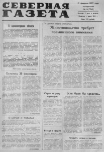 С Е В Е Р Н А Я 17 ф е в р а л я 1997 года п о н е д е л ь н и к № 14(7541) В ы х о д и т 2 раза в неделю Издается с июля 1935 г. Цена 225 рублей. В администрации области В ц е л я х р а з в и т и я прямых взаимовы годных н аучно-технических, торгово-экономических и к у л ь т урны х связей гл ав а областной исполнительной власти Виталий П е т ро вич Муха прин ял пр едложение пр а ви т ел ь с т в а Республики Ингушетия, согласованное с комитетом по внешнеэкономическим и м ежрегиональным с в я з я м об открытии предс т а ви т ель ст в а Р еспублики Ингуш етия н а территории Новосибирской области. В целях оперативног о решения вопросов бюджетного финансирования крестьянских хозяйств и ко нтроля за использованием средств , г л а в а администрации области В. П. Муха р аспорядился со зд ат ь финансово-кредитную комиссию, председателем которой н а значен зам ести т ел ь директора д еп ар т ам ен та сельского хозяй ств а и продовольственного обеспечения Владимир Константинович З а х а ров. С первого м арт а с 5 0 - процентного до трехкратного р а з м е р а будет увеличена еж е месячная до таци я на пи тание детям с онко- гематологическими заболеваниями . Об этом р аспорядился гл ава администрации области Виталий Петрович Муха. Он поручил департаменту здравоохранения и социальной защиты , управлению финансов и налоговой политики обеспечить своевременное выделение средств на вы платы дотаций на питание в счет областной программы «Социа л ь н а я под д ерж к а» . (Пресс-служба администрации области). Осталось 38 П о д а н н ы м о т д е л а с т а т и с т и к и Ж ивотноводство требует повышенного внимания На ферм ах района уж е нет Бурное приумножение числ а ф ерм е р ск и х хозяйств в нашем районе началось в 1991- 9 2 году, а уже дальш е стал намечаться спад, поскольку без конкретной многогранной помощи государства невозмож но было одолеть все препоны, стоящие на пути крестьянских хозяйств. Им нужна была нс тольк о з е м л я , но и все прилагаемые к ней: средств а , техника, семена 1и т. д. Всего этого не хват ало , и, побившись в одиночку, многие ферм еры отступили от з а д у м а нной цели, оставив на «поле боя» долги по кредитам, да и разочарование. С 19 9 2 года и по нынешнее время прекратили существование 59 хозяйств, которые могли бы вносить свою долю в общее сель скохо зяй ственное производство района. Но на 'с е г о д н я у нас действуют только 3 8 самостоят ельных крестьянских хозя йств , имеющих в общей сложности 2 0 9 5 гектаров зе м е л ь , из которых под пашней находится 1491 гектар. фермеров В среднем каждый ф ерм е р я в л я е т с я вл адельцем 70 ,9 гек таро в земли и волен р а б о та т ь на ней, создавая себе крепкую м атериальную базу и про-, д а в а я излишки продукции. Однако пока этой продукции идет немного. Выбрав зерноводческое направление, большинство самостоятельных х о з я е в | о к а з а л и сь по д двойным прессом: экономической зависимости и погодных условий. Они едва справились с уборкой прошлого года и смогли внести н е з н а чительную долю в общие пока- | за т е л и района . Удельный вес их продукции (в основном з е рна, поскольку животноводством почти никто не за ним ается ) составил за 1996 год в объеме сельхозпроизводства всего три процента. Фермеры собрали 4 1 1 4 центнеров зерн а при с р е дней урожайности 3 , 9 центнера с гек тар а , и многие на п ечал ьном опыте убедились, что тол ь ко огромное упорство и н а стойчивость по