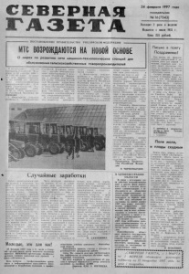 С Е В Е Р Н А Я 2 4 ф е в р а л я 1997 года понедельник № 1 6 ( 7 5 4 3 ) В ы х о д и т 2 раза в неделю Издается с июля 1935 г . Цена 225 рублей. П О С Т А Н О В Л Е Н И Е П Р А В И Т Е Л Ь С Т В А Р О С С И Й С К О Й Ф Е Д Е Р А Ц И И МТС ВОЗРОЖДАЮТСЯ НА НОВОЙ ОСНОВЕ О мерах по развитию сети машинно-технологических станций для обслуживания сельскохозяйственных товаропроизводителей В соответствии с У к а з о м рП а р ц е и з и иде о н т та 10 Р о се с с н и т й яб с к ря и! 19 Ф96 е д е г. Л 1, 1641 « О м е р а х т ч в и а е н ю ск и и я с х ет с и т с а е н л мц ь и а с шй к и о д н х л о ы я з .) я - й т п е с о о т х б н в с е р л ( н а Л у н з о ж в ы г и и и х товаропроизводителей» с р и а й н с и к е ой закФ о е н д о е д р а а т ц е и л и ь , ст в а 1 ( 9 С Р 9 о о 6 б с , Л ” 6 8 , с т . 4 4 1 6 ) П р а в и т е л ь с г - с в т о а 1 н . Р о о в с л с я и М е й т и с : н к и о й сте Ф рс е т д в е у рац с и е и льс п к о о г о хо зя й ств» и продовольствия с Р н т о ы н с м о с и и с й с м д к и р о н у й и г с и т Фм е и е р д ст е з в р а а а и м ц н и и т и ер и е с с о в о в е в д м а о н е мст вам и Р о сси й ск о й ц н и ой и в и ла о ст р и ган с а у м б и ъ ек и т с о п в ол Ф Р н о е и с д т с е е и р л и а ь * ской Федерации о сущ ествить меры по организации ежегодно г н и е ч м ес е к н и е х е 1 с 0 та 0 нц м и а йшинн р о а - з т л е и хн ч о н л ы о х фо рм собс твенности для с л уж и в ан и я с е л ь с к о х о з я й с т в о е н б - ных това ропроизводителей. чит В ь 2 р - а м з е р с а я б ч о н т ы к у й сро п к рим о е б р е н с о п г е о у с т а в а чес 2 к . ой с М т м а и а н н шц и ии с н т и н е . р о ст - ву техн с о е л л о ь г с и ко го хо зяйства и продовольствия с Р т о е с р с с и т й в с у к о ф й ин Ф а е н д с е о р в а ц Р и о и с , си Мй с и к н о и й Ф едерации выделять в новленном порядке из ф у о с н т д а а льготного кредитования или лизингового фонда ср ед ства на пробретение в н е о нн - ой тех т н е о х л н о и г к и и ч с е е д с л л к ь я и с х к о с х т мо а з а н яш ц й и и с н й т . Ра сп р о с т р а н и т ь с 1 января 199 7 г. на машиино-технологи. -— — - .- а - _ г — - f - f ' - Г- ' - - ‘ ^ л С л у ч а й н ы е заработки она Р а ц б е о л т и а ко т м ра и нс п п о о л р н тн ос и т к ь о юв р з а а й - * висит от деятельности всех ост а л ь н ы х л л п и ь р з и с у ь я юти д т о й с я , , о н к р е в о г д е т а а р о н в н р и н ые з е е а е г , о ци о й бып и о чнл о ьз п о р в е п а д о времени , у с л у г а м и а в т о п а р к а , доставляя нужны е гр узы . Т еп ер ь поток этих грузов и с с я к , и машины иногда требуются для вывозки у гля или го рючего , поэтому с осени <■Д г р о п р а м т р а н с * помог к омм ун альном у хо зя й ст в у и п н е а р ч е е п н р и а ю ви к л в к е о с т ь ел у ь г н о ы л м ь . по н Т а з е -, л л б п о ь а е й р с с к ь ь а в я н т ы а о в а л е д ь п з м к р т о и е и д н п и Ф о р с к и е т о д р я л т о а о и ц р е и о в я 1 с с 0 к 0 о а б п я р р т а о о с т с н е и ь н у г л я , а потом для автопарка р к а о б л о ь т к ы о м н а е ши б н удет з . аде Л й и с шт в ь ов н ан е ы с л Т н о а ю г м о п в е е н р с и е к з в у о юС зк е е в о е б р и л н м а о с у г т щ о ь е , с р т к а в у й а д о а на гео в пер еб ази р ую тся . они Ч а ст ь автопарка находится т н е а ль р н е о мо .в н е т д е ь . И изн э о т с о т н е е хн у и д к и и ви с каждым годом у в е л и ч и в а е т ся , в то ж е вр емя ничего нового не приобретается — лищь на запчасти р азбираются жившие свой век машо т и с н л ы у . Чтобы обновить и х , нужны день ги , которых ц ет, так как зак азчики очень часто живают расчеты с тием, Н а п р и м е р , д п о р р е о д ж з п а н р д и и е к р я и с б к е л а й м е ч й а . о с к О о д с л т о о а л е ж т 3 а с 0 ю я (Т т в 