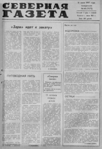 2 стр. « С Е В Е Р Н А Я Г А З Е Т А » 16 нюня 1997 года, ф № 4 8 ( 7 5 7 5 ) . С Е Л О М О Е Р О Д Н О Е Чистейшей пробы снегом деревенским П о л я , дома, дер ев ья з а м е л о . М о р о з о м обжигающим в с е л е н с к и м Н а с в стретило сибирское с е л о . Райцентр имеет зв у чн о е н а зв ан ье . Пр оизнести ег о — д о х н е т зимой. .. За Северным — б о л о т а В а сю ган ья , За Северным — на с е в е р п у т ь прямой. З д е с ь каждый ден ь н еим о в ерн о труден — Ве сною, л е т о м , осенью , зимой; Н е потому л ь н а д е л е н ы з д е с ь л ю ди Особенною щедрой т е п л о т о й . А . С О Р О К И Н . Здравствуйте , ув аж а ем ы е о д н о с е л ь ч а н е ' В этом г о д у нашему С е в е р н о м у — 2 7 0 л е т ! М ы п о зд р а в л я ем всех с этим славным юбил е е м и приглашаем приня ть у ч а сти е в викторине « С е л о м о е р о д н о е » . П о б е д и т е л е й и участников викторины ждут призы . Ответы на вопросы викторины присыл а й т е по а др есу : Ц е н т р а л ь н а я би бли отек а, у л Ра д ищ ев а , 9, т ел . 21-3 46 , 21-236 . У д а ч и вам! 1. К а к ранее н а зы в а л о сь наше с е л о ? С како го года оно с т а л о называться Северным и кто д а л е м у это звучно е название? 2. П е р ечи сли те названия первых у л и ц села . 3. П ервоначально е название у л и ц Ленина и Октябрьской. 4. К о гда о бра з о в ал ся Северный район? 5. В какой район в х о д и л о ранее наше село ? 6. С к о л ь к о с е л ь с к и х приходских шкот был о в нашем районе до 1917 года? 7. В каком году в с е л е о тк ры л а сь первая нач а льн а я школа? 8. В каком году б ы л образован отдел кул ь т у р ы ? 9. Н а з ови те д а т у открытия районной б и б ли отеки . 10. В^ каком г од у в нашем с е л е образова л о с ь С И Т У , кто тогда б ы л его директором? 11. С какого года налажена тел еф онная с в я з ь с сел ьским и Советами? 12. В каком г о д у б ы л а завершена э л е к т р и фикация с е л в районе? 13. В каком г од у начали сущ ес тв о в а т ь я с ли-сад? На какой у л и ц е н а х о д и л о с ь первое здание? 14. Д о 1924 года на территории района б ы л о 6 административных в о ло стей . Перечисл и т е их. 15. В каком г о д у б ы л а обра зо в ан а амбу л а т о р и я в райцентре? 16. Назовите дату образования районной б о л ь н и цы . 17. В каком г од у бы л впервые создан пункт ликвидации неграмотности? 18. В каком г од у б ы л впервые создан о т д е л н ародн о го образования ? 19. В каком году территория Северного района вошла в ук рупненный Куйбышев ский район и когда он б ы л образован вновь? 20. С к о л ь к о сел ь с о в е т ов в х о д и л о в состав С е в е р н о го района в 1965 г о д у ? 21. В каком г о д у в нашем с е л е по явился первый вел осипед? 22 . К о гд а в Северном появи ли сь первые т е л е в и з ор ы ? 23. Назовите количество у л и ц нашег о села . 24. Назовите первых р у к ов о д ящ и х ли ц села . За ли те ра ту р о й и оправками обращ айте сь в ц е н т р а л ь н ую би б л и о т е к у и районный архив. Б у дем крайне признательны всем, кто приш л е т нам ответы, поделится с нами воспоминаниями, архивными ма тери а лам и , историческими сведениями о родном с е л е . Мнение КАЖДОМУ ХОЧЕТСЯ ИМЕТЬ ПОДДЕРЖКУ Девятиклассники сдают переводные экзамены. К о н т р о л ь ная работа по а л г е б р е показа л а , что они достаточно прочно у с в ои ли курс школьной п р о г раммы. Методом дев ятилетних проб и ошибок большинство девчонок и мальчишек полю би ли то чные науки, поэтому хорошо справились не т о л ь к о с у ч е б ной программой, но и с эк за менационной контрольной . Отрадно отметить, что двоек н ы нче нет ни у кого. Т р о е к много, но ес