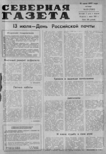 С ЕВЕ РНА Я Г А З Е Т А 10 июля 1997 года четверг № 5 5 (7 5 8 2 ) В ы х о д и т 2 раза в неделю Издается с июля 1935 г . Цена 380 рублей. 13 июля—День Российской почты И с к р е н н е е поздравление У ч и т ы в а я в а ж н ую роль р о сси й ск о й почты в истории развития Р о с с и й с к о г о г о с у д а р с т в а , П р е з и д е н т Р о с с и й с к о й Фнм о е е в ч д и а е л е р т а с ц п я и р а и в з о д с н в в и о т и к о м р —о У е к а Д в з о е о с н м к ь р е №р с о ен с 9 с ь 4 и е 4 й с и о к ю т о й л 1 я 6 , по в м ч а т э я ыто , 1 м 9 ко 9 г т 4 о о д р г у . ый у с т о — а т тринадцатого ч и с л а . У в а ж а е м ы е работники районного у з л а федеральной почтовой с в я з и , примите наши ис кр енни е поздр авления и п ль о шже и л х ан у и с п я е х з о д в ор н о а в ь с я т , ол с ь ч а т с р т у ь д я н , о с м ве и та н у и ж н т о е п м л а д , ля а н т а а с к е ж л е ен б и о я района поприще ! льн В о а г шо , а н с о л в у о ж г б о а , о н б а л х е о г д ч и а т ю с щя е п г о о ст т о р я у н д но по в чт п о о в иы с х к ах раб р о а т ц н и и о к н о а в и р а спр о ст р ани т ел е й печати , общение с клиентами . И пу ст ь вам с о п у т ст в ую т радо сть и у д а ч а ! Т е р р и т ор и а л ь н а я адми ни страц ия С е в е р н о г о района ^ ^ Т е р р и т о р и а л ь н ы й С о в е т депутатов С е в е р н о г о р а й о н а . Ямочный ремонт асфальта В с е и з н аш и в а е т с я , в том числе и а с ф а л ь т на д о р о г а х . Причины , к о н е чно , р а зн ы е , а итог один день ото дня п ва р н о н е ы зж х ая у л ч и а ц сть пок з р а а ы с в ф а а е л т ь с я т и р о о с- } нами я м , вы боин , которые и I приходи тся время от времени ремонтиров ать . ц а х В з С т е и в е д р н н и о г н о а м о с о н ж о н в о ны в х ид у е л т и ь ^ небо льш ую бр и га д у от к о м х о з а , к о т о р а я , перекрыж в и а л я на ж про до лж ит ель но е время ч ги ас . Н ти е с к у о л л и ь ц к , о р е д м не о й н ти н р а у з е а т д до о р н о а р а б о т а л а на С о в е т с к о й , теперь вот м а л о - п о м а л у двигается по у л и ц е Л е н и н а , а там пе рейдет на О к т я б р ь с к у ю и К а л и н и н а . П р а в д а , многое при хо ди т ся д с с я к ел , о а л д т ь е ь к д у о в вс р н к у е и ч т мн у н ю с е п о , о б с х к о о а б д к о и м м г , о о й н во о р т п и е о т х жни е к н Я и и м я к и и не м по в е д ы х а л й н а д т и е ы з шм в ь а о . ю в , т, и з до п р о о л г о и с т а н у т ровнее , - но их-то надо б да уд е г т л ав б н еры е е чь у . ли В ц о ы т то р л а ь й к ц о ен т т о р г а б у д ут в х о р ош ем со стояни и . А . А Р К А Д Ь Е В . Летние заботы Летом ст и х а е т ш ум н а я жшчи и н т з о н т ь д р е е т в л с ь к ш о з к г в о о о л н а с к м х а , е , х м з а о ен в и у ь ш ш н . е е е го с з л в ы н у а у ет р : ок в и . не Нй о н п ач н и ; н >л н а 'те н я е з а мпя и т р а а я т р удовая ч етвер ть , во время К О Т О Р О Й Н У Ж Н ) П О Д Г О Т О В И Т ! здание к п ри ем у маленьких хозяев* В Ч у в .и г и н с к о й сель ской адми ни страции чем т гу а т я , , . ч п т о о м . о х г о а т ю я т бы у ч и т е н л е я б м ол , ьш с м ч о и о й р ч е а м с П о о р н н е т д и п н д о у е л ж т а . н г а о е т с с д я е л з а а т н ь я . ть И ся с е й и п ер еус трой ств ом зд ания с с р к т о о у я е г т о т н . о с , а К д р а а с , з е м к н е о т с т я т о б и р р т о юс е я с з и е д й е ч с и ь а с , н д т п е в е у т р е нат, з а н и м а я половину поме- жщ и ен т и ел я7 ь ~но Э м тот ре в шар е и н а и н и т п с р о и кр п а о т л и о т р а с х о д на с о д е р ж а н и е детей. ми В нис б т л р и а жци а я й ш п е л м ани б у р д у е у т щ е и м п а е д - ремены в отоплении венных зд аний. П риш ло о б в щр е е м с т я пост епенно о т к азы ватьс я от э л е к т р о к о т л о в , а их н ем а л о на терр