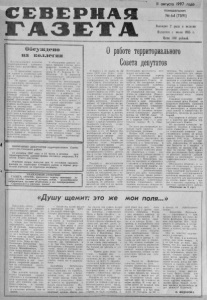 С Е В Е Р Н А Я Г А З Е Т 1 а в г у с т а 1997 года понедельник № 6 4 (7591) В ы х о д и т 2 раза в неделю И з д а с т с я с июля 1935 г . Цена 380 рублей. V , Обсуждено на коллегии Н а с о с т о я вш е й с я коллегии тер р и т о р и а л ьн о й рации бы л о р а с с м о т а р д е м н и о ни д с в т а во прос а : • о ки на —к и ор О м п о о п в д р г о о в в т е х о д о в е з к н я е и й и с к т в з а а у х г б о о т р р о а к в й е у р о ж а я ; — О б о х р а н е охотугоднй и у к р е п л е н и и материально - т е х н и ч ес к ой базы с л у ж б ы о х о т н а д з о р а . С о снов ным докладом по Первому в о п р о с у выст упил главны й агро ном н н О а и н д я и о й с т е м л е Н ь т и с и к к л о о , г л к о а а е к в х о о и е з ч я к й о с А у л т п к и в а р ч а т а е ь в с Г е л т е в в е н . о кормов н е об х од и м о л т в а и о т в ь ь в е х н о к а з р я п у й п л с н а т н о в и г а о р х у р е р о м а г о й а е т о о н г з а о а г и п о с о к т к г о о а о к идут д е л а в отдельно в з яты х . П р о а н а л и з и р о в а л со стоя- ни е^дел с подготовкой н оуборочной техники . с з т в и а л н п о р р и м ч а и л н ь ын о , м р е а шбо а т юы щ , и е з Н е в а р е вные из к оторы х : о тсутст г в л и а е н Д о е с н т е ь ж н м ы аш х и с н р е и д с т в м , е х и а з н н и о з шм е о н в , н едо статок го рю ч е - с м а з о ч - ’ ных м а т е р и а л о в . п во р д о В и с а т о е б л п с и р у и ж н д я х е о л н з и и я и й у с ч д т а а в с н ; т н и о е г Г о н р у у т к в о о о в Т . Т . , Б ол ды р е в А . М . . Ды - диков В . Р . , К о р ж о в П . В . , Ш р е й д е р В . ¡VI., директор хлебоприем ного предприятия И в аш к е ви ч Г . И . К а ж д ы й из в ы с т у п аю щ и х н а зы в а л св ои объективные и с м у о б з ъ я е щк и т и е в д н е ы л е о , пр н и о ч в и с н е ы , с т о о шр- . л и сь во мнении, что главн ая пр и ч и н а — в п е р е к о с е п о шл и е т н й и к юи к г о д с е у р д е а в р н с е т . в а « Н п е о б о у т д н е о т х о з я й с т в а , не будет н и ч е г о . . . » , — с д е л а л за к лю ч е ни е один из в ы с т у п а ю щ и х . П о второму в о п р о с у кл ады в ал А л е к с а н д р л с р т ь а у е й п в о и и н л ч а . Х В С и о л й о к н б о о с в в ужД д— . е н А и о . е х м— от В о и в г в д л е т ыд о а а р ва а ц и Н и о , в о Х т р р а о ми у ц п к шо й н А а . дм Е и . ни с —т ди р ек тор м еж х о з я й ст в ен н о го л е с х о з а « С е в е р н ы й » . В е л к оллегию и вы ступил в за к лю ч е н и е о б с уж д е н и я о бои х вопросов гл а в а ритори ал ьной ции Г . Г . З ы р я н о а в д . м и н и с т т р е а р В Н И М А Н И Ю Д Е П У Т А Т О В т ерритори ал ьно го С о в е т а де п у т а т ов С е в е р н о г о района 10 с е н т я б р я 1 9 9 7 го да , в 11 ч а с о в , в актовом за л е т е рриториальной адм и н и ст р а ц и и с о с т о и т с я о ч е р е д н а я . 5 я с е с с и я С о в е т а д е п у т а т о в . г рл а ь нт О а е с т н н ыи о я в п н е н о р а й е х т о в е о д р п а р р и о н т с а ор с п и т о и р в а е х С с о т е в к в у и е юр н д мо н г е я о д ; и О р ц а и й н с о у о н . с а то и ян п и е и рв з ыд е р а в р о е о з у х У В А Ж А Е М Ы Е . С Е В Е Р Я Н Е ! I Д З Е Т А « В Е С Т И » п р е д л а г а е т в аш ем у вниманию у с - с л У'Коы зн а к ом с т в , истории лю бви , р а зн о о б р а зн ую и н ф о р м а ц и ю , ч ас т н ы е о б ъ я вл е н и я и все т е ле п ро гр ам м ы . С п р а ш и в а й т е в торговых т о ч к а х ! О работе территориального Совета депутатов В период с 25 м ар т а по 20 июня 199 7 го да С о в е т т т а а л тов в С со е о в т е в р е н т о с г т о ви р и ай с он а пл р а д а н е б о п о м у , у с п с т р и в о и е с р ы жС ; о д о в е б н е т н и а ы с . п м о Р л а н с н с а е мн о и т т и р р е е т б н ь ю е ыд й же в с т о е а Се в е р н о г о района за 1996 год; в о е б рн у о т г в о ер р ж а д й е о н н и а и на бю 1 д 9 ж