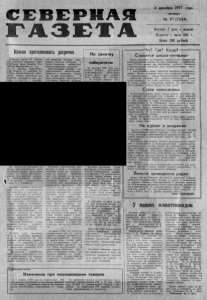 С Е В Е Р Н А Я Г А З Е Т А 4 декабря 1997 года четверг № 9 7 ( 7 6 2 4 ) Выходит 2 раза в неделю Издается с июля 1935 г. Цена 380 рублей Можно пролгоосвтаь досрочно С о г л а с н о статье 5 3 Закона « О б основных гарантиях избирательных прав граждан Р о с сийской Ф еде ра ц и и » и с та тье 55 З а к о н а Новосибир ской области « О выборах депутатов Новосибир ского областного С о в е т а депутатов» избиратель, который в день выборов. то есть 21 декабря ной комис сии, которые заве ряются печатью комиссии, а также подписью избирателя , проголосовавшего досрочно. Запечатанный конверт с и з бирательными бюллетенями хранится у секретаря комиссии до дня голосования. В день голосования пред седатель участковой комиссии вскрыва На очередном заседании коллегии территориальной администрации района рассмотрен вопрос « О работе производственного предприятия жилищ- но - коммунального хозяйства по началу отопительного :езона в с. С е в е р н о м » . Отдавая должное проделанному, коллегия акцентировала свое внимание на наиболее важных проблемах по обеспечению устойчивой подачи тепловой энергии потребителям. К ним относятся: состояние тепловых сетей и котельных, перевод котельных на жидкое топливо, организация автономного электроснабжения котельных, контроль з а качеством пос тавля ем о г о у г л я , организация эффективной работы аварийной бригады. Уч итывая важнос ть темы, редакция считает необходимым донести до читателя основные итоги обсуждения . В 1997 году котельная № 2 (у гостиницы) р аз гр уж е на на 5 0 процентов. В бл и жайшей перспективе ставится вопрос о ее закрытии за счет реконструкции тепловых сетей и увеличении мощности остальных котел ьных. Пр актически выработала свой р е с у р с котельная в поселке нефтяников, что вызывает необходимость ее капитального ремонта в 1998 году. На з ам е т ку избирателю 21 декабря 1997 года сос тоятся выборы депутатов Новосибирского областного С о в е т а . В с е г о в него должно быть избрано 49 человек, на столько округов разБольшая озабоченность п р о звуч а ла в связи с состоянием тепловых сетей. З а последние годы по разным причинам мало что сделано по их ремонту и реконструкции. Н е вы держивает критики состояние утепления труб , вынесенных на по верхност ь. З а ч а с т у ю обо гревается белый свет. С одной с тороны, очевидна вина к ом м у нального предприятия, которое допускает такое положение дел, а с другой стороны п о р а ж ае т варварское отношение к коммуникациям потребителей тепла. П р я м о но трубам о с у щ ествляется проезд тран спор та к дом ам , имеют м е с т о ф а к ты хищения жести. М е ж д у тем владелец сетей никак • не мож ет решить вопрос о нал а живании договорных отн ошений с клиентами и применении к ним санкций за порчу теплотрас сы , вплоть до отключения. В связи с тем, что качество поставляемого угля не всегда отвечает данным сертификатов, перед предприятием поставлена задача более тесной работы с поставщиками угл я и Куйбышевским гортопом, где этот уголь р аз гр уж ае тся . В перспективе предстоит по с т роить в Северном с к л а д для жидкого топлива, что по зв о лит улучшить условия работы и повысить т емп ератур у т еп лон осителя. Большие претензии были высказаны в отношении технической оснащенности аварийной бригады. Э т а осн ащенность сегодня крайне низкая , что не позволяет быстро и эфф ективно устранять поломки. О т м е чалс