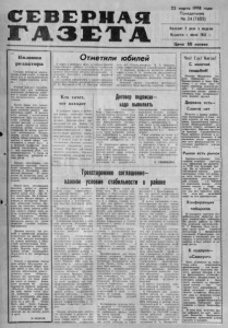 2 3 м а р т а 1998 г о д а П о н е д е л ь н и к № 2 4 ( 7 6 5 5 ) С Е В Е Р Н А Я ■ Л Выходит 2 раза в неделю Издается с июля 1935 г. Ц е н а 5 5 к о п е е к К о л о н к а р е д а к т о р а Сегодня четвертая полоса отдана и жой газете, которую будут раз в месяц выпускать юные корреспонденты района. Раньше р-!Йэнка ограничивалась тем, что помещала отдельные материалы юнкоров о жизни школы. Сейчас это представляется недостаточным. Крэме новых тем, св еж его взгляда юношеская редакция позволит решить еще несколько задач. В школах есть немало талантливых подростков. Они находятся в гуще событий, наблюдают, делают выв >ды, а изложить их порой просто не могут, поскольку рамки школьных сочинений не всегда дают такую возможность. Вторая задача состоит в том, чтобы помочь юным талантам раск- рыться в новой сф ере д ея тельности, а может быть, и и будущей профессии. Ведь выпуск юнкоровско^ газеты — это серьезное дело, это ответственность, а часто ли мы. взрослые, доверяем нашим детям. Вполне естественно, что коллектив взрослой газеты будет оказывать всяческую помощь и поддержку юношеской редакции. И здесь важно не испортить дела, не давить своим авторитетом и годами. Может быть, искушенный читатель найдет в первых выпусках пробелы. Как в любом новом деле, они б у дут неизбежны. Но я уверен, что очень быстро придет и умение, и мастерство. Редакция «Северной газеты» просила бы взрослых, особенно учителей школ, помочь ребятам сделать первые шаги на пути журналистской профессии, поддержать советом, помочь выбрать тему, просто прочитать иногда на уроке наиболее удачные публикации районки. Должен сказать, что дет ские н юношеские редакции существуют во многих г а з е тах. Они находят поддержку на уровне районных и областной администрации. Р е г у лярно проводятся конкурсы, учеба. Поэтому надо дать нашим детям возможность окунуться в эту интересную работу. Теперь о названии. Когда этот вопрос обсуждался, то было высказано общее мнение ребят о том, что в нем должно обязательно присутствовать слово «Юность». Однако его настолько часто используют, что было решено взять за основу латинское звучание. Из разных вариантов воннкло название «Ювснта». Есть версия, что на кебе светит такая з в е з да. Любители астрономии могут подтвердить или опровергнуть этот факт. Д аж е если ее и нет, то, может быть, еще будет. Главное, что она взошла на страницах «Северной газеты». По- жел 1ем же ей светить долго и ярко. В. ЖОРОВ. v v ^ v v w v v w w W \ Л / V \ Л Л Л Л Л Л Л Л Л Л Л Л Л Л Л / W W \ Л / \ Л Л Л Л Л Л / W W W W W V О тметили юбилей 6 марта в районном Доме ку льтуры прошло торжественное собрание трудового к о л л ек т и в а и акционеров АО «С е в с р н о ен сф т е г а з » , п о с вя щенное 10-летнему юбилею предп риятия . С докладом выступил генеральный д и р ек т ор В. В. Попов Со словами при ветствия к присутствующим обратились бывшие руководители пр е дп р и я т и я И. К. Высоцкий и Н. А. Ипатьев, п р е д с та ви т ел ь АО « Т р ан сси бнеф ть » В. П. Микулик, | г л ав а т ер ритори ал ьн ой администрации р ай он а> Г. Г. З ы р я н о в , п р оф е ссор института г е о л о г и н | нефти и г а за Н. Н. З а п и в а л о в , предс та витель^ АО «Н о в о ск б и р ск н еф т е г а з » А. Н. П а в л о в , | за в е дую щ а я Северным филиалом Сбербанка? Т. И. Н а з а р о в а . Большой группе старейши х работников | предприятия были вруч ены памятные подарки ? w \ / w w v л л / w w w w w w \ л / w w \ / v w w \ л / v w w w w w w w w w w w w w