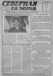 г У Ч Р Е Д И Т Е Л И Г А З Е Т Ы : КОМИТЕТ ПО П Е Ч А Т И И ИНФОРМАЦИИ АДМИНИСТРАЦИИ Н О В О С И БИ Р С К О Й О Б Л А С Т И , Т Е Р Р И Т О Р И А Л Ь Н А Я АДМИНИСТРАЦИЯ И Т Е Р Р И Т О Р И А Л Ь Н Ы Й С О В Е Т Д Е П У Т А Т О В С Е В Е Р Н О Г О Р АЙ О Н А ПЯТНИЦА 18 февраля 2000 года № 7 ( 7 8 1 4 ) Выходит 1 раз в неделю С ПРАЗДНИКОМ, ЗАЩИТНИКИ ОТЕЧЕСТВА! С е р г е й С т е п а н е н к о - б у д у щ и й з а щ и т н и к О т е ч е с т в а . Ф о т о Т . Ш а л а г и н а . Ч е р е з н е с к о л ь к о д н е й мы б у д е м о т м е ч а т ь Д е н ь з а щ и т н и к а О т е ч е с т в а . В э т о м г о д у д в а с о б ы т и я з а с т а в л я ю т с о с о б ы м в н и м а н и е м г о в о р и т ь о б э т о м п р а з д н и к е . Э т о п р и б л и ж а ю щ е е с я 5 5 - л е т и е П о б е д ы и в о й н а н а С е в е р н о м К а в к а з е . И у ж е н е н а д о д о к а з ы в а т ь , ч т о з а щ и т а Р о д и ны н у ж н а ; ч т о к э т о м у н а д о г о т о в и т ь с я , ч т о а р м и и т р е б у е т с я с о в р е м е н н а я т е х н и к а . Н о п р е ж д е в с е г о т р е б у е т с я г р а ж д а н и н , г о т о в ы й с т а т ь з а щ и т н и к о м . И в с е г д а п о д э т и м п о н и м а л о с ь о д н о - г о т о в н о с т ь н е щ а д и т ь . ж и в о т а с в о е г о р а д и Р о с с и и , р а д и с в о и х р о д н ы х и б л и з к и х . Х о ч е т с я н а д е я т ь с я , ч т о м и р н а с т у п и т с к о р о и н е п р и д е т с я в с е м н а м с л е д и т ь з а б о е в ы м и с в о д к а м и , д а ж е и п о б е д н ы м и . П о з д р а в л я е м ж и т е л е й р а й о н а с г о с у д а р с т в е н н ы м п р а з д н и к о м - Д н е м з а щ и т н и к а О т е ч е с т в а , ж е л а е м в с е м м и р а , з д о р о в ь я , б л а г о п о л у ч и я , у л ы б о к и с ч а с т ь я . Г л а в а т е р р и т о р и а л ь н о й а д м и н и с т р а ц и и Г . З Ы Р Я Н О В . П р е д с е д а т е л ь т е р р и т о р и а л ь н о г о С о в е т а д е п у т а т о в А . А К И Л И Н . г К О М У - Т О П О К А З А Л О С Ь . Ч Т О Р А Й О Н Р У Х Н У Л П о во до в п о г о в о р и т ь на эту тему оказалось два. Первый дали те , кто обходит дворы и собирает подписи под письмом, в котором утв ерждается, что район доведен до ручки. Второй возник в связи с тем, что 4 февраля глава администрации области В. А. Толоконский провел радиосовещание с районами по бюджету на 2 0 0 0 год и платежному календарю. 7 февраля скорректированный проект бюджета внесен в областной С о в е т . П р и е г о п од гот ов ке главное внимание было обращено на р е а л ь н о с т ь дохо д но й ч асти . Поэтому он будет сложный и ж е с ткий. ■ Э то о зн ачает , что предполагается усилить социальную направленность бюджета, то есть обеспечить выплаты работникам бюджетной сферы заработной платы и н а к о п и в ш и х ся по ней дол гов, компенсаций учителям з а п ечатную продукцию, восстановить нормативные выплаты детских пособий. Но при этом вряд ли возможен рост расходов на содержание и разв и ти е м а т е ри а л ь но й базы. Так что по областному календарю 2000 -й год будет годом реального бюджета. Губернатор отметил, что решение поставленной задачи зависит и от трансфертов из Москвы и от собственных налоговых сборов. Невыполнение задания по последним сразу влечет снижение поступлений из федерального бюджета Поэтому выход один, четкое выполнение обязательств каждым районом. Январь оказался в этом плане не самым лучшим. Консолидированный бюджет области выполнен только на 84 процента. Плохо то, что часть районов не собрали з апланированную часть “живыми” деньгами и, значит , не смогли направить на выплату заработной платы необходимые ресурсы (не менее 4 0 % ) . В их числе Усть-Таркский,- Барабинский сельский