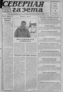 |С Е В Е РН А Я га з е т а УЧРЕДИТЕЛИ ГА З Е ТЫ :К О М И Т Е Т ПО ПЕЧАТИ И ИНФОРМАЦИИ АДМИНИСТРАЦИИ НОВОСИБИРСКОЙ ОБЛАСТИ ТЕРРИТОРИАЛЬНАЯ АДМИНИСТРАЦИЯ И ТЕРРИТОРИАЛЬНЫЙ СО ВЕТ ДЕП УТАТОВ СЕ ВЕ Р Н О Г О РАЙОНА Г П ЯТ НИЦ А 14 апреля 2000 года № 15 ( 7 8 2 2 ) Выходит 1 раз в неделю Что заботит с е ль ско го ж и тел я ? П о д в о д и м и т о г и с х о д о в и личных п р и е м о в г раж дан . В первом к в а р т а л е 2 0 0 0 года главой т е р р и т о р и а л ь н о й а д м и н и с т р а ц и и р а й о н а и его з а м е с т и т е л я м и по л ич ны м вопросам было п р и н я т о 9 8 п о с е т и т е л е й . За этот ж е п е р и о д поступило 81 п и с ь м е н н о е о б р а щ е н и е . Н а и б о л е е ч а с т о людей волновали вопросы с о циал ьной з а щиты - 5 3 о б р а щ е н и я . Как п р а вило, это вы п л а т а д е т с к о го пособия , о к а з а н и е натур аль но й и д е н е ж н о й п о м о щ и . Н а втором м е с т е п р о б л е м ы , с в я з а н н ы е с выплатой з а р а б о тн о й п л а т ы - 4 0 о б р а щ е н и й . Р е м о н т ж и л ь я и б л а г о у с т р о й с т в о з а н и м а е т т р е тье м е с т о - 16 о б р а щ е н и й . Т а к же м о ж н о вы дели ть жи лищ ны е , к о м м у н а л ь н о -б ы т о в ы е п р о б л е мы ( 1 2 ) , а т а к ж е р а б от у связи, т р а н с п о р т а и с т р о и т е л ь с т в о д о рог ( 5 ) . О д н о о б р а щ е н и е было пов торным и 5 коллект ивных. С л е д у е т о т м е т и т ь , что за 3 м е с я ц а э т о г о г од а о б р а щ е н и й с т а л о б о л ь ш е на 4 8 по с р а в н е нию с т е м ж е периодом п рошло го года. И н т е р е с п р е д с т а в л я е т т а к же а н а л и з вопросов, поднятых в э т ом году н а с х о да х граж да н . П р а к т и ч е с к и во всех с е л а х л ю д е й б е с п о к о и т о р г а н и з а ц и я в о д о с н а б ж е н и я . Т р е б у е т с я р е м о н т во допроводов , р е м о н т и с тр о и т е л ь с т в о колодцев. О с т а е т с я на п о в е с т к е д н я стр о и т е л ь с т в о жилья, объектов с о ц ку л ь т бы та , дорог. Ж и т е л и Н о в о т р о и ц к а п р е д л а гаю т раз в м е с я ц организовы вать выезд с п е ц и а л и с т а по р е монту бытовой техники. Биазин - цы хо т е л и бы иметь в с е л е ф и л и а л д е т с к о й 'ш к о л ы искусств, а н а с е л е н и е Г р а ж д а н ц е в о про с и т и н ф о р м и р о в а т ь о каж д о м п а д е н и и о т д е л я ю щ и х с я ч а с т е й р а ке т . Д л я т е х , кто ж и в е т не в р а й ц е н т р е н е т а к п р о с т о п о пасть н а п ри ем к вр ану или д о е х а т ь д о С е в е р н о г о . В свя зи с этим п ре д с та в и те л и Федоровки с т а в я т в о п р о с о п р о в е д е н и и п р е д в а р и т е л ь н о й з а п и с и на прием к с п е ц и а л и с т а м пол и кл и ники и покупке д ля сельской а д м и н и с т р а ц и и м и к р о а в т о б у с а п овыш енно й п ро ходимости . Н а д о о т м е т и т ь , ч т о ч а с т ь в о п р о с о в у ж е р е ш а е т с я ил и п р и ня та к исп о лн ен ию . В ч а с т н о с т и , э т о к а с а е т с я вы платы у ч и т е л я м з а п еч атн ую продукцию и к о м м у н а л ь н ы е у с л у г и , з а к у п а молока у н а с е л е н и я . Е с т ь п р о б л е м ы , к о т о р ы е с е й ч а с м о гут быть р а с с м о т р е ны то л ь ко на о б л а с т н о м у р ов не. К ним н а д о о т н е с т и с т р о и те л ь с т в о д ор о г до Федоров ки и В и ти нс ка , с т р о и т е л ь с т в о шко л, выплату к ом п енсац ий на приобр е т е н и е д р о в г р а ж д а н а м , н е и м е ю щ и м л ь г о т . В р а й о н н о м б ю д ж е т е э т и х с т а т е й р а с х о д а не п р е д у с м о т р е н о , а они очень велики . _____________ :____________ / Район в лицах О Н И З А Щ И Щ А Л И Л Е Н И Н Г Р А Д Н е д а в н о в р е д а к ц и ю “С е в е р ной газеты" позвонил о д и н из в е т е р а н о в В О В . И з м а т е р и а л о в о К. А . О л ь х о в и к е и Л