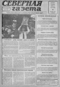 "СЕВЕРНАЯ ГАЗЕТА" 1 с е н т я б р я 2 0 0 0 г о д а • № 35 (7 8 4 2 ) 3 сентября - День нефтяной и газовой промышленности О т в с е й д у ш и п о з д р а в л я е м к о л л е к т и в ы О А О « Н о в о с и б и р с к - н е ф т е г а з » и г е н е р а л ь н о г о д и р е к т о р а В. Ф Е ф р е м о в а , О А О « С е - в е р н о е н е ф т е г а з » и г е н е р а л ь н о г о д и р е к т о р а В В. П о п о в а , в с е х р а б о т н и к о в , ч е й т р у д с в я з а н с р а з в и т и е м н е ф т е д о б ы в а ю щ е й о т р а с л и е С е в е р н о м р а й о н е , с п р а з д н и к о м , Д н е м н е ф т я н о й и г а з о в о й п р о м ы ш л е н н о с т и ! П р и м и т е и с к р е н н и е , с е р д е ч н ы е п о з д р а в л е н и я , п о ж е л а н и я б л а г о п о л у ч и я в а м и в а ш и м б л и з к и м . Н а д е е м с я , ч т о и в п р е д ь н а ш е д о б р о е с о т р у д н и ч е с т в о п о з в о л и т в ы п о л н я т ь н а м е ч е н н ы е п р о г р а м м ы , в е д у щ и е к д а л ь н е й ш е м у р а з в и т и ю С е в е р н о г о р а й о н а , ч т о в а ш и у с п е х и л я г у т в о с н о в а н и е н а ш е г о о б щ е г о б л а г о п о л у ч и я . У в а ж а е м н е л е г к и й в а ш т р у д и ж е л а е м с ч а с т ь я и з д о р о в ь я ! Глава т е р р и т о р и а л ь н о й админ ис т р а ци и Г.ЗЫРЯНОВ. П редседатель т е р р и т о р и а л ь н о го Совета А. АКИЛИН. С лож н ая о б ст ан о в ка в Г р а ж д а н ц е в с к о й школе Н е з а м е т н о п о д к р а л а с ь о с е н ь , а с н е й и п р о б л е м ы , с в я з а н н ы е с н а ч а л о м о т о п и т е л ь н о г о с е з о н а . Е с л и р а с с м а т р и в а т ь о б с т а н о в к у в ш к о л а х р а й о н а , т о т р е в о г у в ы з ы в а е т Г р а ж - д а н ц е в с к а я с р е д н я я . Наш к р а т к и й р а з г о в о р с е е д и р е к т о р о м М. Д . К у з н е ц о в о й с о с т о я л с я п о т е л е ф о н у . О н а , к а к р у к о в о д и т е л ь , с е т о в а л а на о т с у т с т в и е д е н е г , ч т о п р и в е л о к н е в о з м о ж н о с т и в о в р е м я п р о и з в е с т и р е м о н т ш к о л ь н о й к о т е л ь н о й . В д е н ь н а ш е й б е с е д ы , а о на б ы л а 23 а в г у с т а , с т о я л и р а з о б р а н н ы е д в а к о т л а . В о д н о м и з н и х с д е л а л и о б м у р о в к у , у с т а н о в и л и т о п к у , п р и с т у п и л и к с б о р к е с а м о г о к о т л а , г д е т р е б у ю т с я с в а р о ч н ы е р а б о т ы , н о о п я т ь ж е в с е с д е р ж и в а е т о т с у т с т в и е р а д и а т о р о в . К 15 с е н т я б р я б у д у т с т а р а т ь с я е г о з а п у с т и т ь . С л о ж н е е о б с т о я т д е л а с о в т о р ы м к о т л о м . На с ч е т ш к о л ы п о с т у п и л и д е н ь г и в о в т о р о й д е к а д е а в г у с т а в с у м м е 1 1 4 т ы с я ч р у б л е й н а е г о п р и о б р е т е н и е . К а к т о л ь к о о н б у д е т п р и в е з е н и з Н о в о с и б и р с к а , с р а з у н а ч н у т с я м о н т а ж н ы е р а б о т ы , н о и н а э т о у й д е т н е м а л о в р е м е н и , а х о л о д н о е д ы х а н и е о с е н и т о р о п и т . Е. ХАРЧЕНКО. Высокая оценка труда учителя У к а з о м П р е з и д е н т а Р о с с и и В л а д и м и р а П у т и н а 10 п е д а г о г а м и з р а й о н о в Н о в о с и б и р с к о й о б л а с т и за з а с л у г и в о б у ч е н и и и в о с п и т а н и и уча» щ и х с я и м н о г о л е т н и й д о б р о с о в е с т н ы й т р у д п р и с в о е н о п о ч е т н о е з в а н и е « З а с л у ж е н н ы й у ч и т е л ь Р о с с и й с к о й Ф е д е р а ц и и » . В и х ч и с л е и у ч и т е л ь Ф е д о р о в с к о й н е п о л н о й с р е д н е й ш к о л ы С е в е р н о г о р а й о н а П. Ф. Т и м к и н . П о з д р а в л я е м П е т р а Ф е д о р о в и ч а с э т о й н а г р а д о й и ж е л а е м е м у н о в ы х т в о р ч е с к и х д о с т и ж е н и й . ь Ш КОЛА ИСКУССТВ Ж Д Е Т НОВ Г Выходить и з дома вез денег опасно для ж и з н и Д а ж е е с л и в ы с л о м а л и н о г у , т о в б о л ь н и ц е б е з д е н е г н е о 