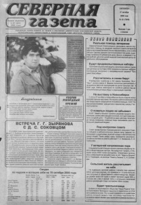 ■■ СЕВЕРНАЯ га зета У Ч Р Е Д И Т Е Л И Г А З Е Т Ы : КОМИТЕТ ПО П Е Ч А Т И И ИНФОРМАЦИИ АДМИНИСТРАЦИИ Н О В О С И БИ Р С К О Й О Б Л А С Т И , Т Е Р Р И Т О Р И А Л Ь Н А Я АДМИНИС ТРАЦИЯ И Т Е Р Р И Т О Р И А Л Ь Н Ы Й С О В Е Т Д Е П У Т А Т О В С Е В Е Р Н О Г О РАЙОНА П Я Т Н И Ц А 27 октября 2000 годя № 43 (7 850 ) Выходит 1 раз в неделю У i ( Г ко лле ктив и пенсионеров АООТ “Сееерноеагропромтранс" с проф ессионал ьным праздником - Днем работнико в автомобильного транс порта. Ж е л ае м крепкого здоровья, благополучия , радости в жизни. Пусть небо будет ясным в жизни вашей, Пус ть с о л н це светит и душа поет. Пус ть до м ваш будет полной чашей, Здоровья вам на много лет вперед. А д м и н и с т р а ц и я . ^ Н и к о л а й В л а д и м и р о в и ч Т а р а к а н о в у ж е б о л е е 2 0 л е т т р у д и т с я в А О З Т и м е н и М . Г о р ь к о г о ш о ф е р о м В о к т я б р е у н е г о , к а к и у м н о г и х е г о с о б р а т ь е в - д и т е л е й , с р а з / п р о ф е с с и о н а л ь н ы х п р а з д н и к а . П е р в ы й - Д е н ь р а б о т н и к о в с е л ь с к о г о х о з я й с т в а , а в т о р о й - Д е н ь р а б о т н и к о в а в т о м о б и л ь н о г о т р а н с п о р т а , к о т о р ы й в ы п а д а е т н ы н ч е н а 2 9 о к т я б р я . С п р а з д н и к о м в а с , Н и к о л а й В л а д и м и р о в и ч , и в с е х , к т о в ы б р а л н е п р о с т у ю ш о ф е р с к у ю с у д ь б у СОБРАН РСНОРДНЫЙ УРОЖАЙ 17 октября Новосибирская область завершила уборку урожая. Он оказался рекордным, в закрома засыпано более 3 млн т зерна. Сегодня в Новосибирск приглашены делегации всех районов области для участия в празднике, пос в я щ е н н о м б о л ь ш о й тр у д о в о й победе. В С Т Р Е Ч А Г . Г . З Ы Р Я Н О В А С Д . С . С О К О В Ц О М 19 о к т я б р я г л а в а т е р р и т о р и а л ь н о й а д м и н и с т р а ц и и Г. Г. З ы р я н о в в с т р е т и л с я с в и ц е - п р е з и д е н т о м О А О “ С И Д А Н К О ” Д. С. С о к о в ц о м . Ц е л ь ю ее б ы л о о б с у ж д е н и е в о п р о с о в , с в я з а н н ы х с о б у с т р о й с т в о м В е р х - Т а р с к о г о н е ф т я н о г о м е с т о р о ж д е н и я в 2001 г о д у . Д м и т р и й С е р г е е в и ч о т м е т и л , ч т о п о с л е к о р р е к т и р о в к и л и ц е н з и о н н о г о с о г л а ш е н и я и п о л у ч е н и я о б н а д е ж и в а ю щ и х р е з у л ь т а т о в н а п е р в о й п р о м ы ш л е н н о й с к в а ж и н е , б у р е н и е к о т о р о й н е д а в но б ы л о з а к о н ч е н о , м е с т о р о ж д е н и е с т а л о з н а ч и т е л ь н о п р и в л е к а т е л ь н е е д л я и н в е с т о р о в . Д о к о н ца г о д а б у д е т п р о б у р е н а е щ е о д н а с к в а ж и н а и с д а н в э к с п л у а т а ц и ю ж е л е з о б е т о н н ы й м о с т ч е р е з Т а р у в р а й о н е б ы в ш е й д е р е в н и П л а т о н о в к и . На 2 0 0 1 - й го д , к р о м е б у р о в ы х р а б о т , п р е д с т о и т п р о д о л ж и т ь с т р о и т е л ь с т в о д о р о г и о т В е р х - Т а р к и д о С е в е р н о го, п у с т и т ь в э к с п л у а т а ц и ю н е ф т е п р о в о д , п о д г о т о в и т ь п р о е к т о с в о е н и я с е в е р н о й ч а с т и м е с т о р о ж д е н и я , р а с п о л о ж е н н о й в ц е н т р е В а с ю г а н с к и х б о л о т . В с в о ю о ч е р е д ь Г е н н а д и й Г е о р г и е в и ч а к ц е н т и р о в а л в н и м а н и е н а у ч а с т и и н е ф т я н и к о в в р е ш е н и и н е к о т о р ы х с о ц и а л ь н ы х п р о б л е м . В ч а с т н о с т и д о с т и г н у т а д о г о в о р е н н о с т ь о в л о ж е н и и 3 м л н р у б л е й в р а з в и т и е к у л ь т у р ы р а й о н а . П р и з н а н о ц е л е с о о б р а з н ы м н а ч а л о ж и л и щ н о г о с т р о и т е л ь с т в а д л я н у ж д н е ф т я н и к о в . П о к а о н и т о л ь к о п о к у п а л и ж и л ь е , ч т о п р и в е л о к р о с т у ц е н на н е го . П о д н и м а л с я в