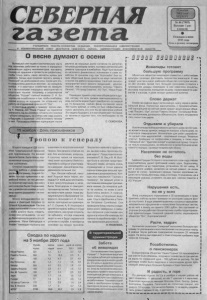 УЧРЕДИТЕЛИ Г А З Е Т Ы : КОЛЛЕКТИВ Р Е Д А К Ц И И , Т Е Р Р И Т О Р И А Л Ь Н А Я АДМИНИСТРАЦИЯ И ТЕРРИТОРИАЛЬНЫЙ С О В Е Т ДЕПУ Т А Т О В С Е В Е Р Н О Г О Р А Й О Н А , АДМИНИСТРАЦИЯ НОВОСИБИРСКОЙ ОБЛАСТИ ' " " " И ' ' '■ 9 1 ' " ' ' ........ .. ' ....... —.............. ■■!■■■! ■ ■■■■ Г 15 н о я б р я \ 2001 года I V Ч Е ТВ Е Р Г J № 46 (7 9 0 5 ) Вы х о д и т 1 раз в неделю Основана в июне 1935 года Цена в розницу договорная О весне думают с осени В ы п а в ш и й с н е г п о д в е л о к о н ч а т е л ь н у ю ч е р т у под о с е н н и м и р а б о т а м и на по лях и о п р е д е л и л д а л ь н е й ш у ю з а д а ч у м е х а н и з а т о р о в : п о с т а в и т ь те хнику на х р а н е н и е и п р о в е с т и ее д е ф е к т о в к у , ч то б ы т о ч н о з н а т ь , к а к и е з а п ч а с т и н у ж н ы д л я ремонта . З а тем н а д о в о в р е м я с д е л а т ь з а я в к у в “А г ро с наб " на н е о б х о д и м ы е узлы. С ро ки д л я э то го о п р е д е л е н ы д о в о л ь н о ж е с т к и е - д о с е р е д и н ы ноября И в н е к о т о р ы х х о з я й с т в а х не з а м е д л и ли с в ы п о л н е н и е м о ч е р е д н ы х м е р о п р и я т и й по п о д го т о в ке т е х н и к и . Н а п р им е р , в а к ц и о н е р н о м о бщ е с т в е “ Р о с с и я " г л а в н ы й и н ж е н е р О. И. Ко- чер гин у ж е п о з а б о т и л с я о том, ч т о б ы к о м б а й н ы , сея л ки с т о я л и н а х р а н е н и и . Не о с т а в л я ю т эту работу на о т д а л е н н ы й с р о к и в АО “Луч ". А н е к о т о р ы е д р у г и е , к пр им ер у , к о л х о з и м е ни К. М ар кс а , А О "Н аш а Р о д и н а ” не т о р о п я т с я з а в е рш и т ь г о д п о - х о з я й с к и . О тч а с ти это п о н я т н о - у б о р к а з а т я н у л а с ь , но с е й ч а с уж е на д о д у м а т ь о б у д ущ е м , о п о с е в н о й - 200 2 и г о то в и т ь т е х н и к у к ней. П р о д о в о л ь с т в е н н а я к о р п о р а ц и я п о с л е р а с ч е т а за п р о ш л ы е д о л г и с о г л а с н а по д о п о л н и те л ь н ы м д о г о в о р а м н а ч а т ь п о с т а в к у з а п ч а с т е й д л я р е м он та т р а к т о р о в и к о м б а й н о в . Ищ у т п у т и в ы х о д а из н е л е г к о г о ф и н а н с о в о г о п о л о ж е н и я и с а м и х о з я й с т в а . В п р о ш л о м г о д у пр и “А г р о с н а б е ” был с о з д ан о б о р о т н ы й ф о н д с р е д с т в на за куп з а п ч а с т е й , а ны нч е эта р а б о т а пр од о л ж е н а . С в о й пай с е л ь з о х - п р е д п р и я т и я м о г у т в н о с и т ь п р о д у кц и е й - м а с л ом , з е р н о м , ч е м и в о с п о л ь з о в а л и с ь к о л х о з ы “ П а м я т ь Л е н и н а ” , “ VII с ъ е з д С ов е тов " , АО “Луч ", “ Н аш а Р о д и на". П л а н и р у ю т п р и н я т ь у ч а с ти е в о бщ е м д е л е и д р у гие, п о т о м у ч то е с т ь п р ям а я з а и н т е р е с о в а н н о с т ь , вед ь з а п ч а с т и м о ж н о б у д е т пр и о б р е та т ь с о скид кой д о 15 п р о ц е н т о в . С е й ч а с ф о н д с о с т а в л я е т о коло 300 т ы с я ч р у б л е й , а ч т о б ы он б ы л эф ф е к ти в ны м , нуж но у в е л и ч и т ь его х о т я бы д о м и л л и о н а рублей. Э то з а д а ч а б у д ущ е г о , а в н а с то я щ е м и де т п о с т а н о в ка те х н и к и и п о д с ч е т т о го , что н е о б х о д и м о на ее р е м о н т . С. С Е М Е Н О В А . 15 ноября - День призывников Т р о п о ю к г е н е р а л у В т о р о г о н о я б р я в Р Д К с о с т о я л с я т р а д и ц и о н н ы й п р а з д н и к д л я п р и з ы в н и к о в Н а в е ч е р е з ву ч а л и п е с н и , б ы л и т а н ц ы , в с е в о з м о ж н ы е к о н к у р с ы и с п о р т и в н ы е с о с т я з а н и я . О т л и ч н о с п р а в л я ю т с я с е в е - р я н с к и е р е б я т а с д о м а ш н и м и д е л а м Ц н а п р и м е р , А н д р е й О с - ттрнин б ы с т р о п р и в ы к н е т к а р м е й с к о й ж и з н и : о н т а к д е л о в и то п о ч и с т и л к а р т о ш к у , п р и ч е м у н е г о к о ж у р к и 