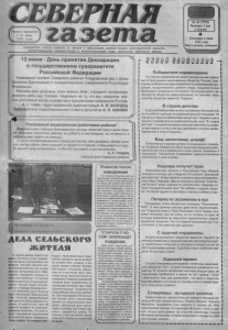 газета. У Ч Р Е Д И Т Е Л И Г А З Е Т Ы : КОМИ ТЕТ ПО П Е Ч А Т И И ИНФОРМАЦИИ А ДМИНИС ТРАЦИИ Н О В О С И Б И Р С К О Й О Б Л А С Т И , Т Е Р Р И Т О Р И А Л Ь Н А Я АДМИНИСТРАЦИЯ И Т Е Р Р И Т О Р И А Л Ь Н Ы Й С О В Е Т Д Е П У Т А Т О В С Е В Е Р Н О Г О Р А Й О Н А 13 июня 2002 года Ч Е Т В Е Р Г № 24 ( 7 9 3 5 ) Вы ходит 1 раз в неделю Основана в июне 1935 года Ц е н а в р о з н и ц у д о г о в о р н а я V _________________У 12 июня - День принятия Декларации о государственном суверенитете Российской Федерации Уваж аемы е жи те ли Северно го района! Поздравляем вас с Днем принятия Д е кл а р а ц и и о государственном с у ве ре ни тете Российской Федерации. Ж е л а ем вам здоровья, всех земных благ, х о рош е го настроения, мирного неба над головой. Надеемся на то, ч то мы, северяне, в н е сем д о с т о й н ы й вклад в разви тие и пр оцве та ние суверенной России. И. о. главы терр и то р иал ьно й а д м ин истр аци и А . И. КОЗУБЕЦ. П ред сед атель т е рр и то р иал ь но го Совета д е п у т а т о в А. П. А КИ ЛИН . Уважаемые медицинские работники района! В ы р а ж а ю в а м г л у б о к у ю б л а г о д а р н о с т ь з а в а ш н е л е г к и й т р у д в д е л е о х р а н ы з д о р о в ь я н а с е л е н и я р а й о н а , з а д о б р о т у и м и л о с е р д и е , з а г о т о в н о с т ь в л ю б о е в р е м я п р и й т и н а п о м о щ ь . В к а н у н п р о ф е с с и о н а л ь н о г о п р а з д н и к а ж е л а ю в а м з д о р о в ь я , ж е л а ю у с п е х о в , ж е л а ю у д а ч и , л е г к о о т д ы х а т ь и т р у д и т с я с о т д а ч е й , ч т о б ы р а д о с т ь в с у д ь б е в а ш е й ч а щ е в с т р е ч а л а с ь , ч т о б ы в с е в ы х о д и л о и в с е п о л у ч а л о с ь . А . А . ГЛАДУН , <г• г л а в н ы й в р а ч С е в е р н о г о р а й о н а . т [ На с н и м к е : А. Макаров. И н т е р в ь ю с н и м ч и т а й т е н а с т р . 4. Помогли после наводнения О т с т и х и й н о г о б е д с т в и я ни кто не гар а н т и р о в а н . И о б ы ч н о в с т а р и н у , когд а б е д а с т у п а л а на пор ог о д н о г о д ом а , на п о м о щ ь ем у с п е ш и л и в с е с о с е д и и о д н о с е л ь ч а н е . К о гд а с т и х и я р а з г у л я л а с ь п о с е л у Г р а ж д а нц е во , т о под во д о й о к а з а л и с ь п о с т р о й к и и ж и л ы е д о м а . Т р и се м ь и д а ж е п о л н о с т ь ю п е р е с е л и л и с ь в д р у г и е д в о р ы . П о т о м во д а у ш л а , п р е д о с т а в и в л ю д я м пр а во р а з б и р а т ь с я с п о с л е д с т в и я м и с в о е г о в т о р ж е н и я . Т о г д а - т о и п р и ш л а на п о м о щ ь с о ц и а л ь н а я с л у ж б а р а йо на . П о с т р а д а в ш и м п о м е р е во зм о ж н о с т и в ы д е л и л и то , ч т о м ог л и : п р е д м е ты б ы т о в о г о о б и х о д а , п я т ь м еш к о в м у к и , вещи и ко е - ч т о д ру г о е . В с ем о б е с п е ч и т ь , ко не ч но , н е во з м о ж н о , но г л а в н о е - л ю д и п о ч у в с т в о в а л и , ч т о о н и не о д и н о к и и м о г у т р а с с ч и т ы в а т ь на к о н к р е т н у ю м а т е р и а л ь н у ю п о м о щ ь . . Д Е Л А С Е Л Ь С К О Г О Ж И Т Е Л Я В первой декаде июня в Чувашах состоялся сход граждан. На нем были рассмотрены три вопроса: пастьба частного скота, благоустройства сел на тёр- ритории муниципального образования, наведение порядка на сельском кладбище. По первому вопросу вынесли следующее решение: пастьба будет производиться в порядке очередности. Но ж и т е л е й с е л а б о л ьш е всего волновало благоустройство Сельская администрация уже сделала обход дворов в Чувашах. В р е з у л ь т а т е чего 45 сельчан вызваны на административную комиссию. Все они получат письменное предписание за антисанитарное содержание своих усадеб. На очереди Коб - Кордон. Населению было предлож