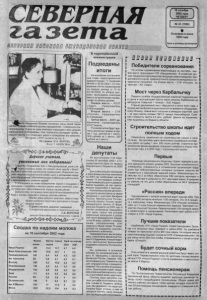 СЕВЕРНАЯ еваваааа В П И в ю ш Ш в а Ф е д о р о в н а М о р е в а о с н о в н у ю ч а с т ь с в о е й т р у д о - ? вой о и о г р а ф и и п о с в я т и л а о д н о м у п р е д п р и я т и ю - С е в е р н о м у х л е б о п р и е м н о м у . Ч е р е з ее руки е ж е г о д н о « п ро х одит» ве с ь у р о ж а й , ', в ы р а щ е н н ы й х л е б о р о б а м и . О н а тщ а т е л ь н о и с с л е д у е т пр обы , с 1 к а ж д о й п а р т и и п о с т у п а ю щ е г о зер н а и оп р е д е л я е т его к а ч е с т в о . М а т е р и а л о Х П П ч и т а й т е на стр . 3. к ф ф й ? На с н и м к е : М .Ф . М О РЕВА . Ф о т о Т. Ш А Л А Г И Н А . - Я У Д о р о г и е уч ит ел я, у в а ж а е м ы е м о и и з б и р а т е л и ! С е р д е ч н о п о з д р а в л я ю В а с с М е ж д у н а р о д н ы м д н е м учи- ' ' т Н и з к о к л а н я ю с ь всем , кто с в я з а л с в о ю с у д ь б у с б л а г о р од н ой и п о ч е т н о й у ч и т е л ь с к о й п р о ф е с с и е й . И с к р е н н е е с п а с и б о п е д а г о г и ч е с к и м к о л л е к т и в а м школ и в е теран ам на р о д н о го о б р а з о в а н и я , о б е с п е ч и в а ю щ и м с т а б и л ь н у ю рабо т у ш кол в и с к л ю ч и т е л ь н о с л о ж н о е время! Я о б р а щ а ю с ь ко всем и з б и р а т е л я м о кр у га и у ч а щ и м с я с п р и з ы в о м —г о р д и т е с ь и в ы с о к о ц е н и т е с в о и х у чи т е л е й , спол - . на о тд а ю щ и х с в о и п л а м е н н ы е с е р д ц а на ш им д е т ям ! З а в е р я ю Вас, ч т о в м ер у с в о и х д е п у т а т с к и х в о з м о ж н о с т е й б у д у и в п р е д ь о к а з ы в а т ь п о м о щ ь ш к о л а м района. ч ^ Ж е л а ю в с ем д о б р о г о з д о р о в ь я , м ира и тв ор- — ч ес к их у с пе х о в в п о д го т о в ке м о л о д е ж и к с о з и д а - . ¿ Ч * ^ т е л ь н о й ж и зн и ! ^ ж С Д н е м у ч и т е л я , д о р о г и е т о в а р и щ и ! с и с к р е н н и м у в а ж е н и е м и п р и з н а т е л ь н о с т ь ю V А .В . М О Р О З О В д е п у т а т Н о в о с и б и р с к о г о о б л а с т н о г о С о в е та 7\ Сводка по надоям молока н а 1 0 с е н т я б р я 2 0 0 2 г о д а Ф у р а ж . В а л о в . С д а н о Удой на к о р о в у к о р о в н а д о й 200 2 2001 Наша Р о д и н а 200 1 3 ,3 1 2,7 6,7 6,5 В е р х - К р а с н о я р с к и й 4 9 0 1 9 ,8 2 3 ,7 4 5,8 Г р а ж д а н ц е в с к и й 148 6 , 4 6 ,8 4 ,3 5,5 и м . К а л и н и н а 85 3 ,8 4,1 4 ,3 5,1 В о с х о д 2 20 9 , 2 1 0,9 4 ,2 5,2 Н о в о т р о и ц к и й 136 4 , 5 5 ,4 3,3 4.5 Ф е д о р о в с к и й 1 60 6 , 8 8 ,6 4,3 5,6 З аря 111 6 , 4 6 ,6 5,8 5,5 Р о с с и я 85 3 , 4 3,8 4 4,9 О с т а н и н с к и й 156 8 9 ,5 5,1 3,5 им . К .М а р к с а 220 11 11,9 5 4,5 И т о г о 2011 9 2 , 6 104 4 ,6 5,3 В территориальной администрации Подведены итоги На о с н о в а н и и п о с т а н о в л е н и я г л а в ы т е р р и т о р и а л ь н о й а д м и н и с т р а ц и и Г .Г .З ы р я н о в а № 6 4 3 о т 2 6 . 0 9 2 0 0 2 г. «О п о д в е д е н и и ито гов с о р е в н о в а н и я з а п е р в у ю д е к а д у ( с 13 п о 2 2 . 0 9 . 2 0 0 2 ) п о у б о р к е у р о ж а я » п р и с у ж д е н ы к л а с с н ы е м е с т а за в ы п о л н е н и е п о к а з а т е л е й по у б о р к е у р о ж а я . П е р в о е м е с т о - А О З Т « З а р я » ( п р е д с е д а т е л ь А . М .Б о л д ы р е в ) В т о р о е м е с т о - С П К « Р о с с и я » ( п р е д с е д а т е л ь А Н Б и р ю к о в ) Т р е т ь е м е с т о - А О З Т им К а л и н и н а ( п р е д с е д а т е л ь Ю .В . Г р и ш к о ) . Р у к о в о д и т е л я м б у д у т в р у ч е н ы д е н е ж н ы е п р е м и и в с у м м е 1 ты с. р у б л е й з а 1 м е с то , 5 0 0 р у б л е й за 2 м е с т о , 3 0 0 р у б л е й за 3 м е с то . Наши депутаты И з в ы с т у п л е н и я Н . М . Х а р и т о н о в а 25 с е н т я б р я 200 2 г. в Гос у д а р с т в е н н о й Д у м е по п р о е к т у ф е д е р а л ь н о г о б ю д ж е та на 2 0 0 3 год. Д л я с та б и л и з а ц и и по ложения в а г р о п р о м ы ш л е н н о м к ом пл е кс е на 200 3 год н е об х одим о как м и н и м у м 75 м и л л и а р д о в р у б л е й . Пор а в озвращат ь д о л г и дер е в н е . Х в а т и т выезжат ь за сч