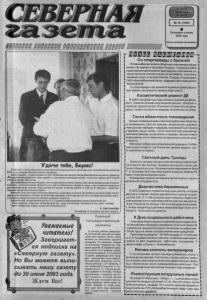 г 26 июня 2003 года Ч ЕТВЕРГ № 26 (7988) Основана в июне 1935 года Цена в розницу д о гов орна я " тпв в з твзизиБШИЗЕ!ш> Со спартакиады с бронзой В Новосибирске прошла областная спартакиада под д е визом «За единую и здоровую Россию». Северный район представляла делегация из одиннадцати спортсменов, кот о р ы е приняли участие в играх по волейболу, стритболу, гиревому спорту и легкой атлетике. Поездку спонсировало ОАО «Новосибирскнефтегаз», выделив участникам десять тысяч рублей. Со спартакиады наш земляк В.Корняков привез бронзовую медаль за успехи в гиревом виде спорта. Косметический ремонт ДК В районном Доме культуры начался косметический ре монт, поменян козы рек над входной дверью , обновлен и покрашен ф асад здания. Планируется заменить входную дверь, открыть которую не каждому посети телю по силам. Гости областного телевидения На днях Северный район посетили работники областного телевид ен и я. Цель их приезда - в с тр ет и ться с х раните лями русских о брядов и традиций, позн а ком и ться с бытом и нравами наши х селян. Гости п осетили бе р гу л ь с ки й музей имени Бажова, в с третили сь с лю д ьми , пр и ча с тны ми к возрождению этого памятного ис торического уголка наше го района. Материал собран для телевизионной передачи «Сибирс кая э н ци клопед ия» , где 5 июля мы сможем увиде ть с в о их земл я ков на экране. Светлый день Троицы Более ста человек приняли участие в праздновании светлого свято го дня Троицы. Праздник проходил в стенах районного Дома культуры. Организатором мероприятия была Т. А. Куликова. Все участники водили хоровод, овивали березку, пели фольклорные песни. В празднике приняли активное участие и дети с о з д ор о вительной площадки села. Диагностика беременных В ЦРБ С е в е р н о г о появился ещ е один д о к т о р , который вернулся и освоил теорию д в у х м е с я ч н ы х курсов по д и а г ностике УЗИ. О. П. Мельникова, врач -гинеколог, будет специализироваться по заболеваниям внутренних женских органов. Разместится аппарат УЗИ в стенах родильного дома, и те перь каждая будущая мама наверняка будет знать кого ож и да ть - мальч ика или дев о ч к у . У д а ч и тебе, Борис. В каби не те Главы те рриториальной администрации прошло то ржест венное чествование выпускников 2003 года, которые окончили ш колу с медалью. Борис Кузьмин - первый медалист Коб. Кордоновской средней общеобразовательной школы. Директор ^ п е д к о л л е к т и в разделили свою радость с остяцкими преподавателями, поскольку парень д о 9 класса учился в стенах той школы. Д о стойно прошагав одиннадцать л е т по школьной тропинке, Борис стоит перед выбором дороги жизни. В планах - ста ть доктором. Думается , его мечта обязательно сбудет ся, ведь у него огромное желание и достаточный запас знаний, среди д р у зей он слывет интеллектуалом. К то м у же Б. Кузьмин - самостоятельный, целеустремленный парень. Ж елание стать доктором у Бориса появилось, когда мама попала в автомобильную катастрофу. На его глазах врачи боролись за жизнь д оро г о г о ему человека. И детская мечта стать учителем рассеялась сразу. А ту борьбу медиков Борис по сей день на зывает подвигом. Д и р е ктор Коб. кордоновской школы Л. А. Лушова охарактеризовала свое го медалиста так: - О ч е н ь добрый, открытый, общительный. Он - душа коллектива. Прекрасный сын, брат, человек . Удачи, побед тебе, Борис, и светлой , ровной дороги! С .